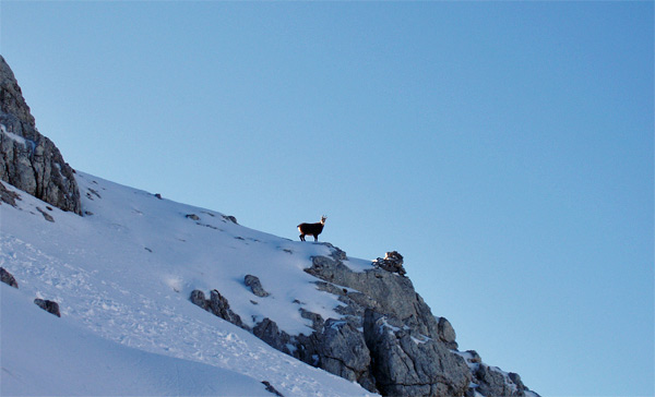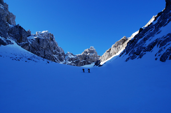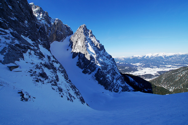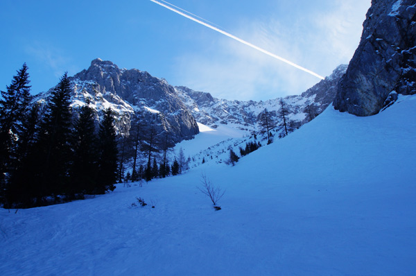 Tourenverhältnisse: sehr gute Bedingungen, allerdings eine sehr schattige Angelegenheit. Die Sonne sieht man erst auf den letzten ca. 100 Höhenmeter im Kar und dann natürlich am Gipfelanstieg. Vom Parkplatz weg ist die Forststraße noch dick engeschneit. Ansonsten griffigePiste, "Kanonenrohr" unterhalb der Dammkarhütte ist hart, aber nicht eisig.