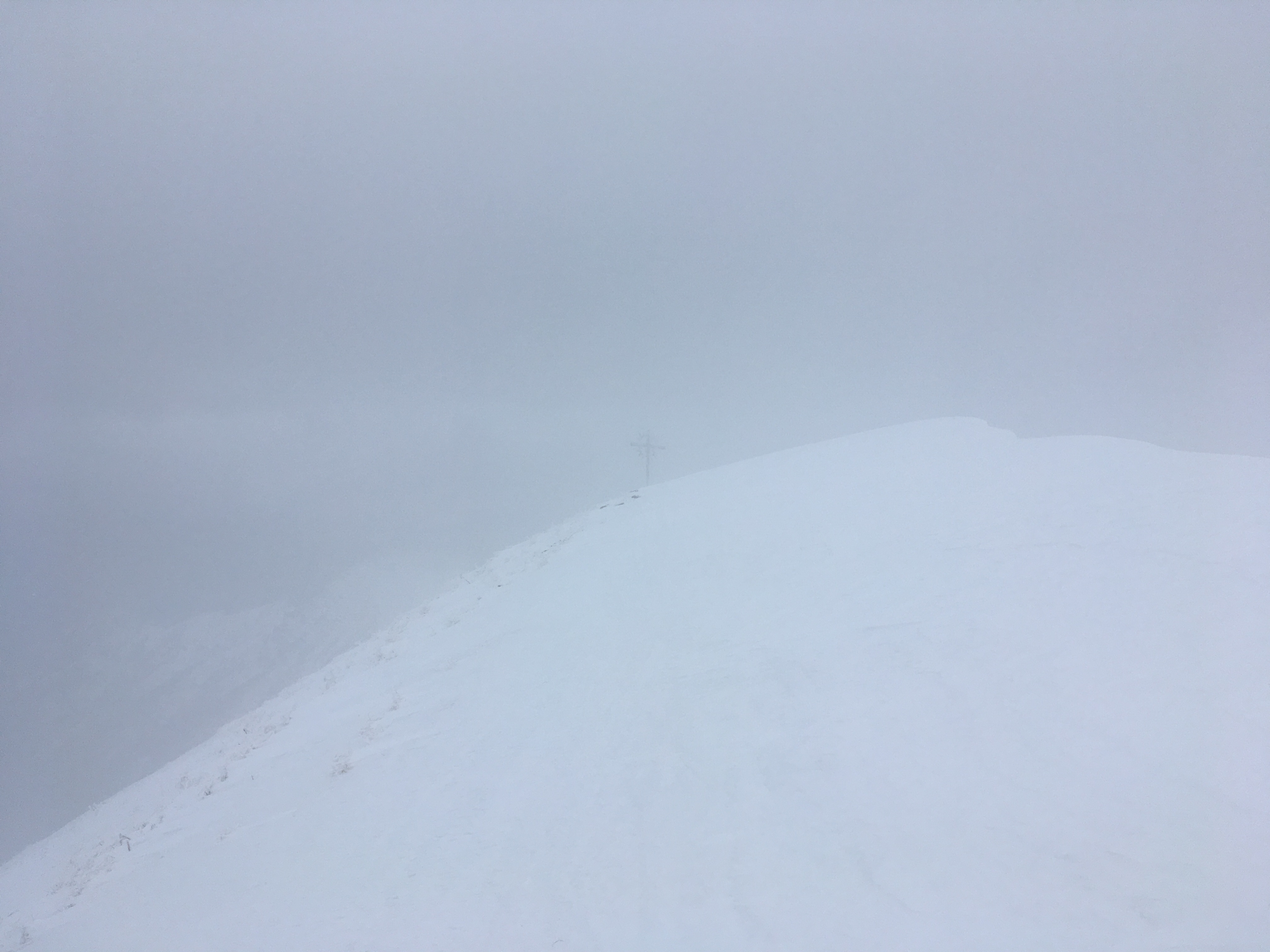 Noch ein Blick zurück zum Gipfelkreuz - das waren schon die besseren Sichtverhältnisse oben, meistens nur wenige Meter Sicht: