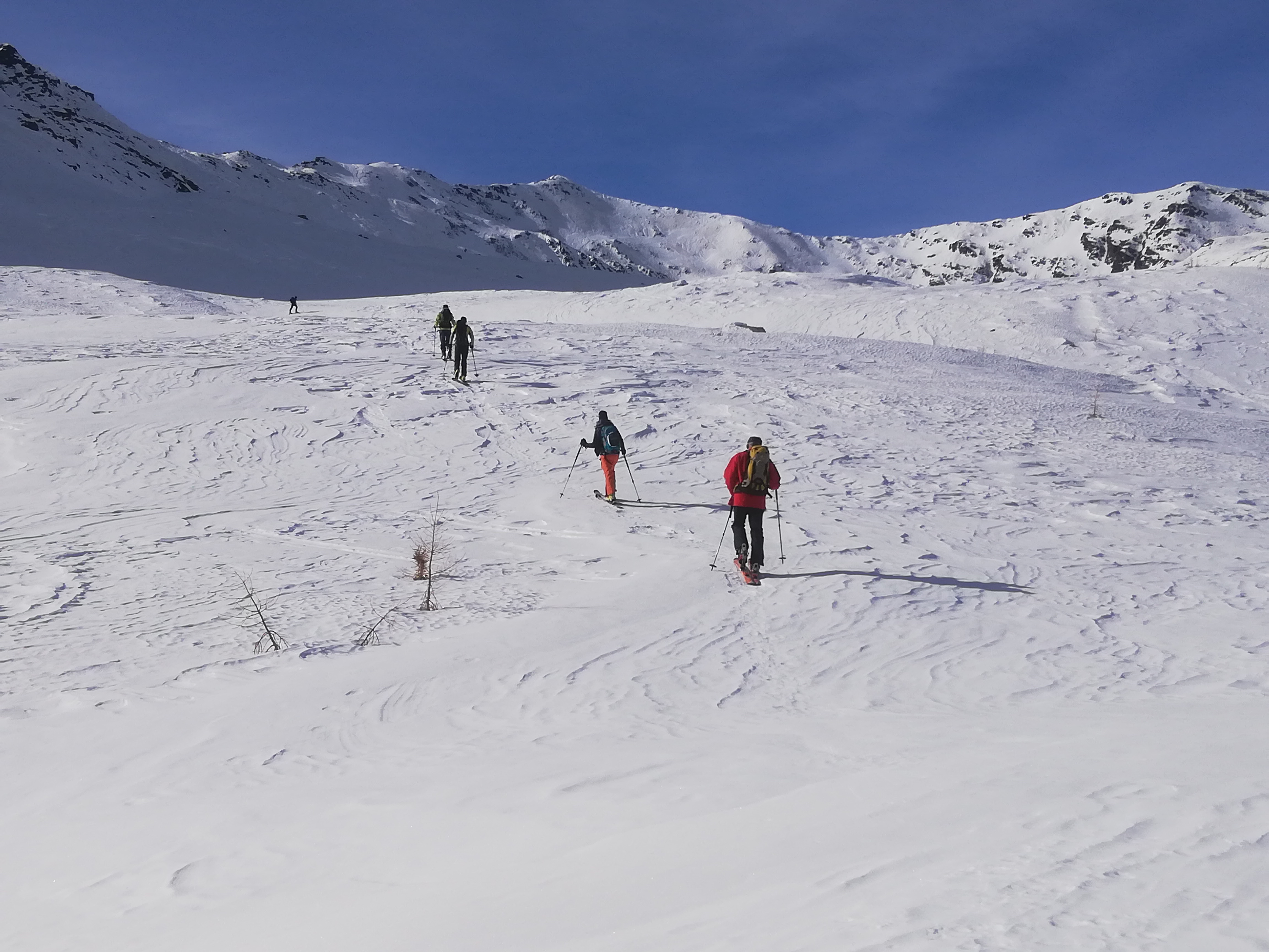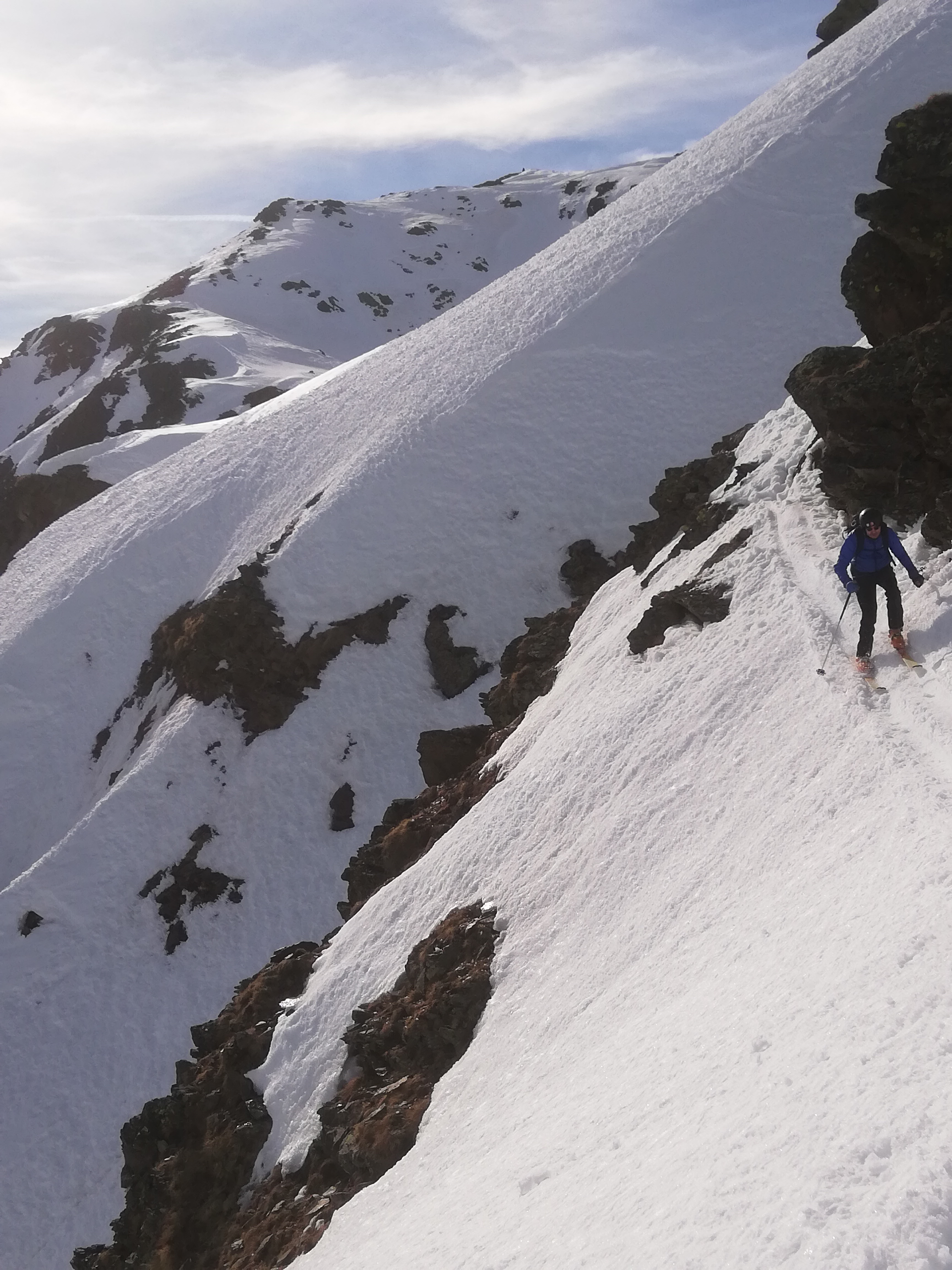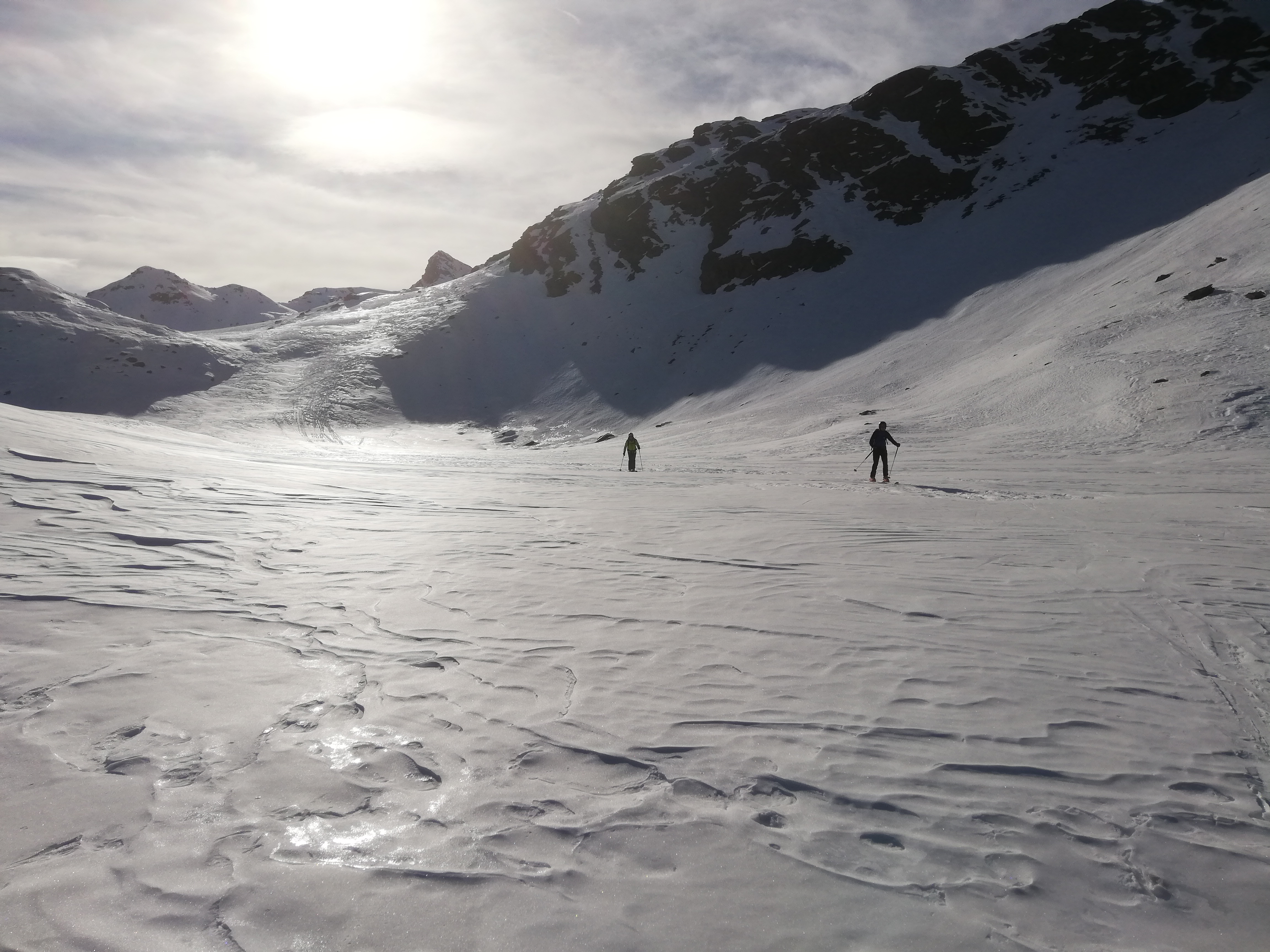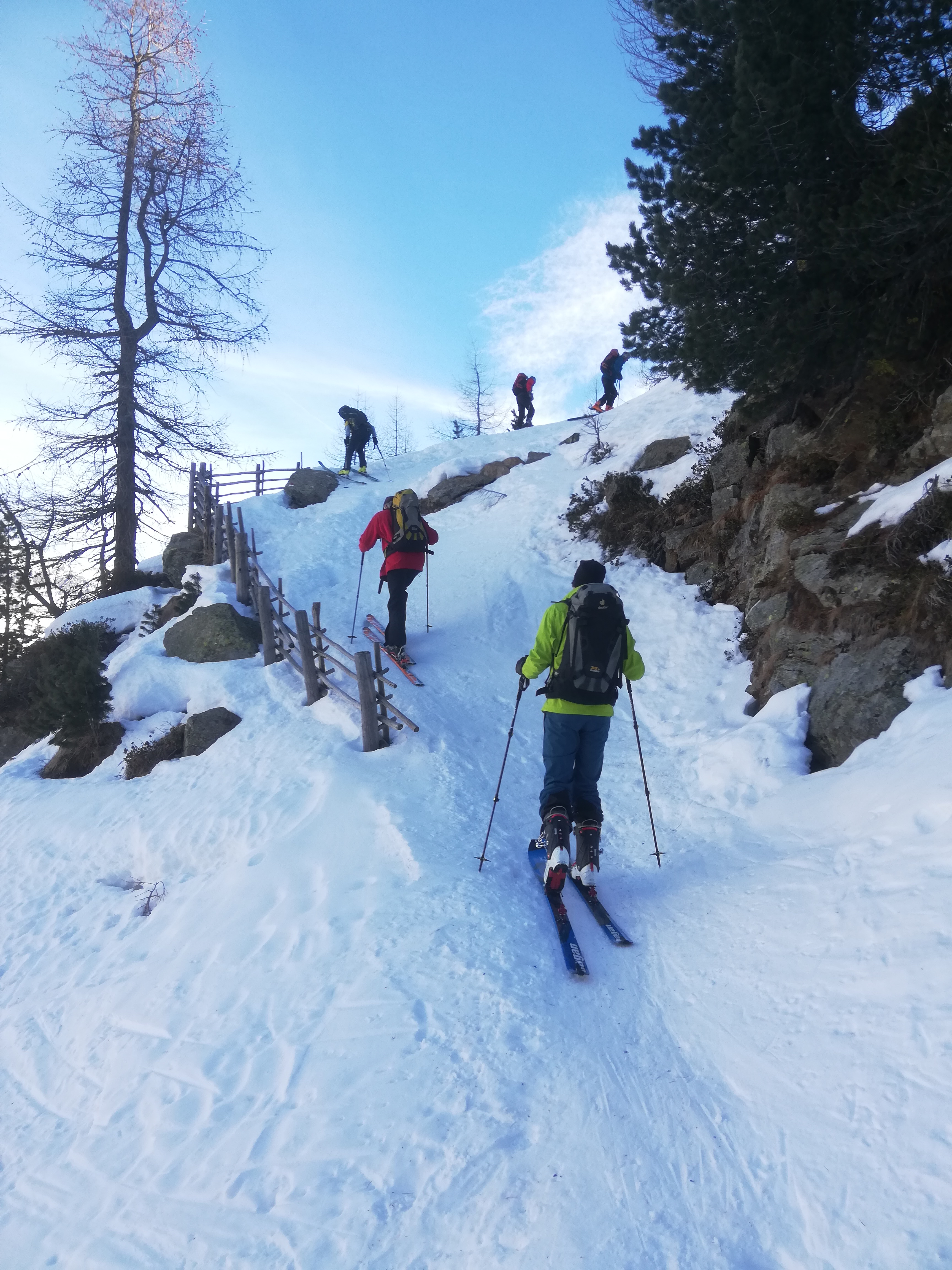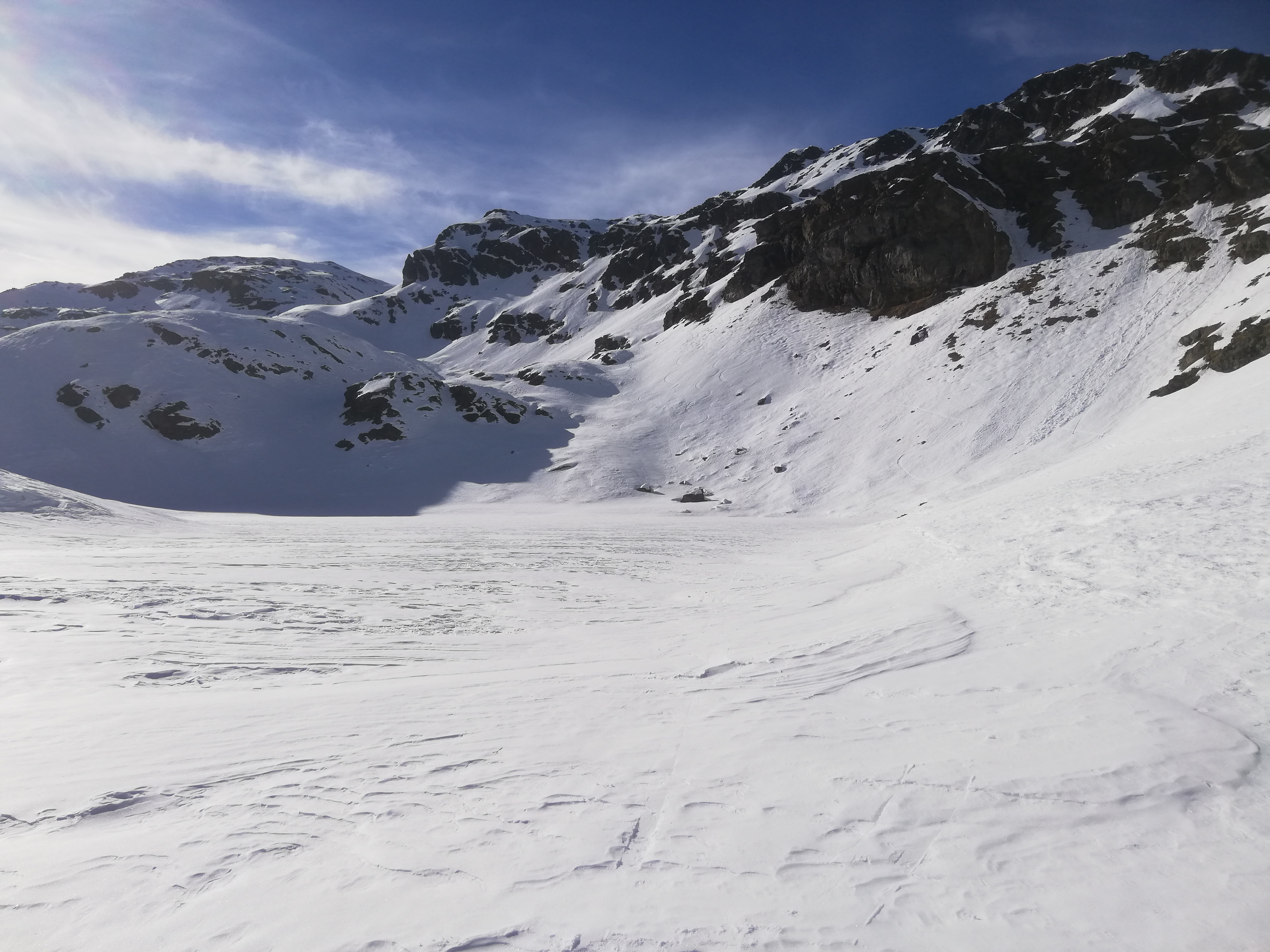 Abfahrt dann nicht wie Aufstieg, sondern nach Süden Richtung Rabbijoch und durch das Kirchbergtal bis nach St. Gertraut. Wir sind allerdings fälschlicherweise direkt vom Kreuz in die erste Mulde abgefahren, was uns eine Querung steiler Hänge oberhalb von Abbrüchen bescherte, ehe wir in den Talboden zum Kirchbergsee abfahren konnten. Südseitig war hier der Schnee garnicht schlecht, sulzig. Ansonsten aber größere Strecken harter bis sehr harter Harsch. Später über eine lange Forststraße talauswärts. Läuft sehr gut raus. Nur kurz vor dem Ort ca. 100m Ski tragen.