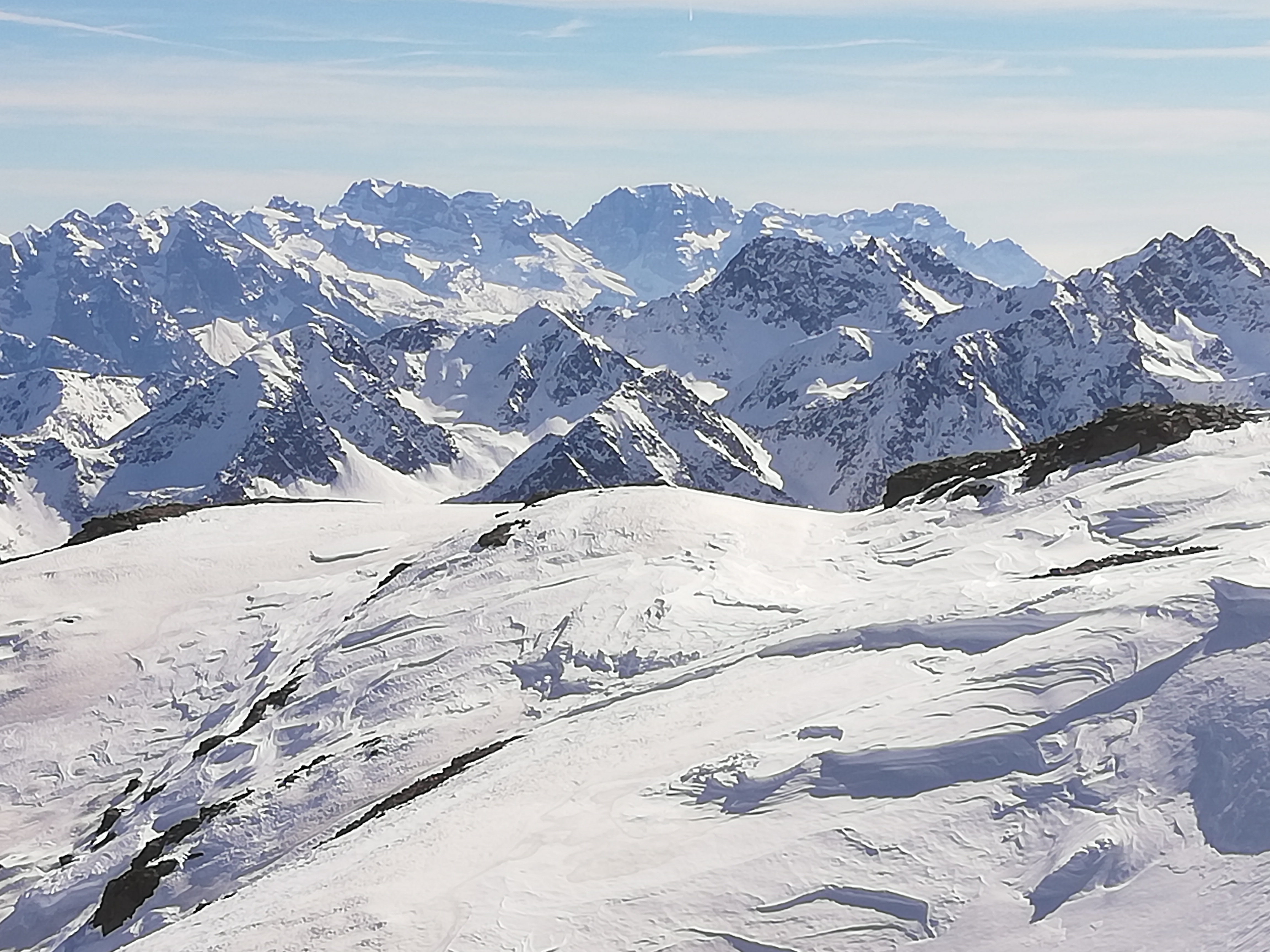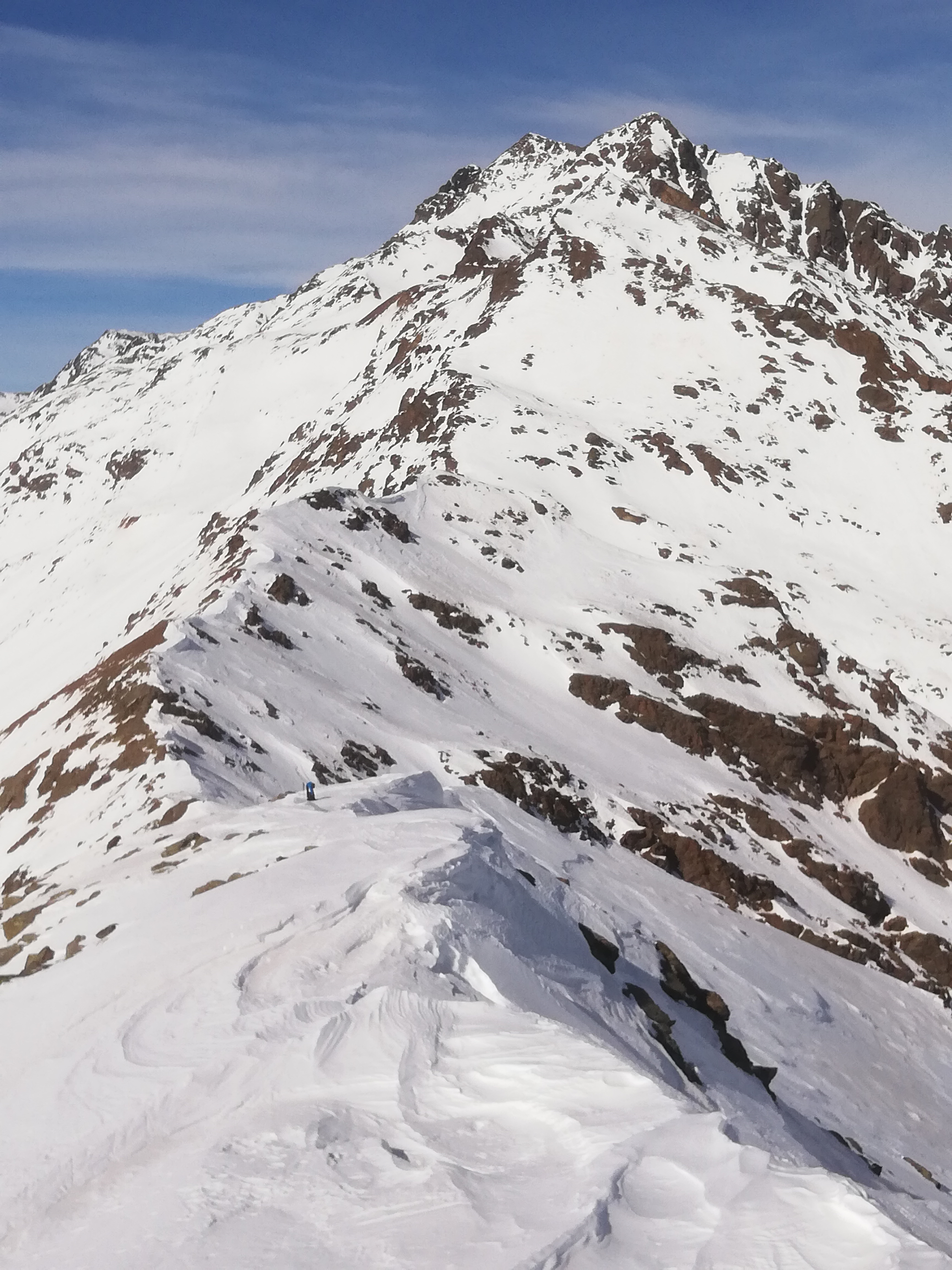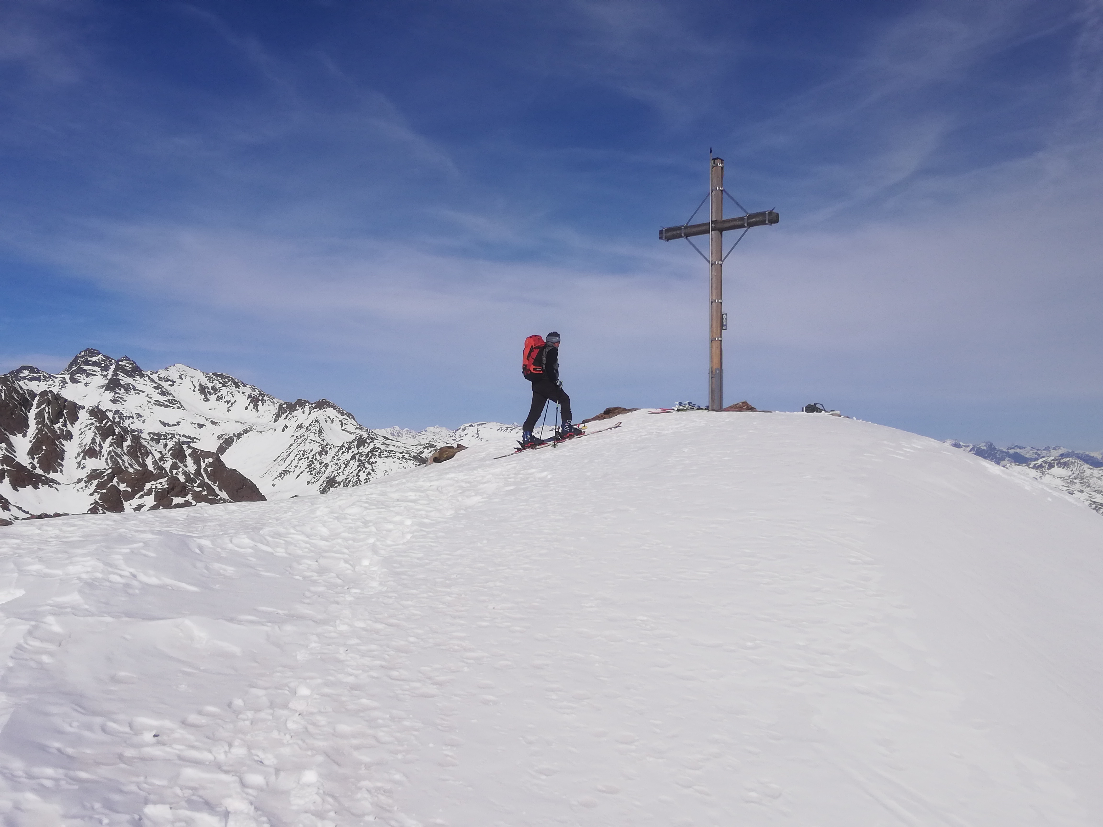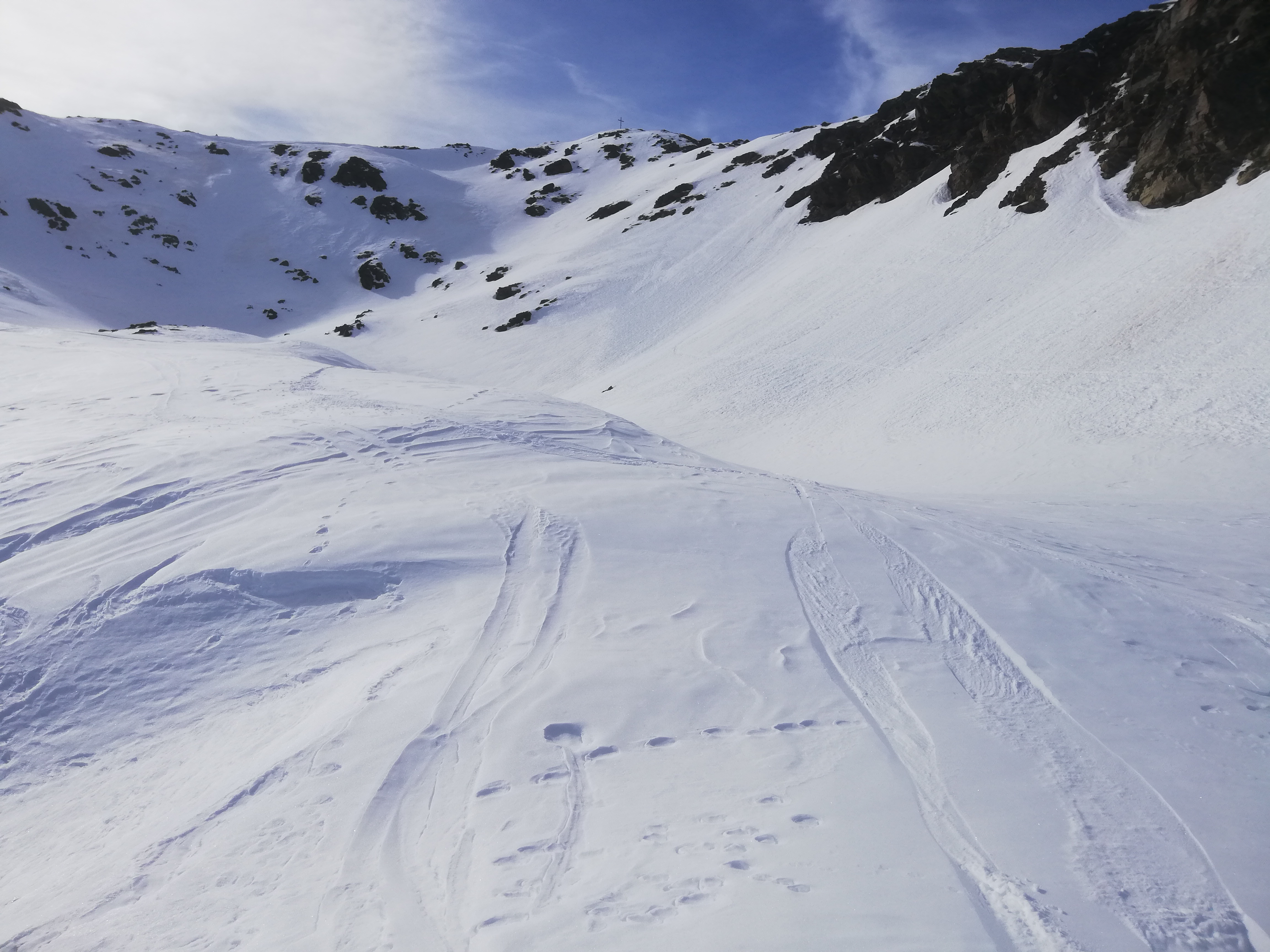 Tourenverhältnisse: Schneemäßig wenig erbaulich. Wie gestern vom See zur Oberen Weißbrunnalm, dann das lange und flache Tal nach Südosten, bis sich die Hänge aufsteilen. Wir sind heute dank der guten Lawinensituation direkt ins Schwarzseejoch bzw. knapp links davon hoch gestiegen. Hier war der Schnee allerdings, wie auch sonst, bockhart und Harscheisen ohne Steighilfe Pflicht. Die letzten Meter zum Grat zu Fuß. Andere sind durch die etwas flacheren Nordnordosthänge direkter Richtung Gipfel angestiegen. War aber wohl kaum besser. Zuletzt einfach über den Gipfelrücken (Nordrücken) zum Kreuz. Der höchste Punkt liegt wenige Minuten entfernt und ist einfach erreichbar.