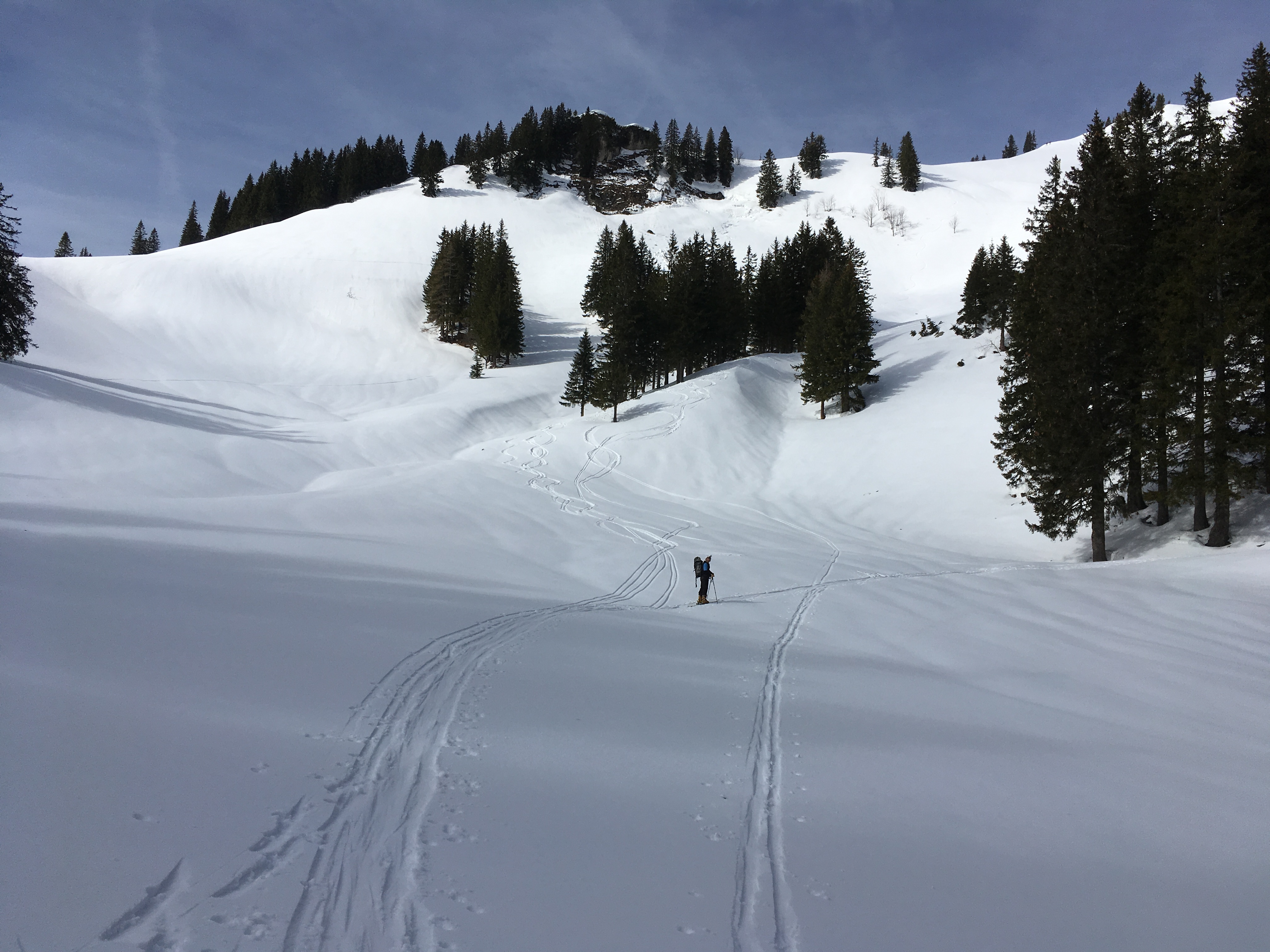 Tourenverhältnisse: Forstweg von unten ab schön planiert. Im Aufstieg auf ca. 1380 hm (anstatt zur Priener Hütte) schöne Spur links ab durchs Gelände zur Oberkaseralm und weiter. Latschen am Gipfelhang komplett eingeschneit. Gipfelanstieg gut, einige Stellen abgeblasen. Abfahrt kurz nach 14 Uhr durch Gipfelmulde: super zu fahren, teils nasser Pulver, teils Firn. Auf dem Forstweg weicher Schnee, es lief gut raus.