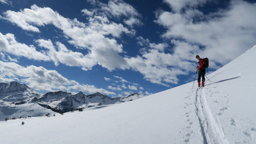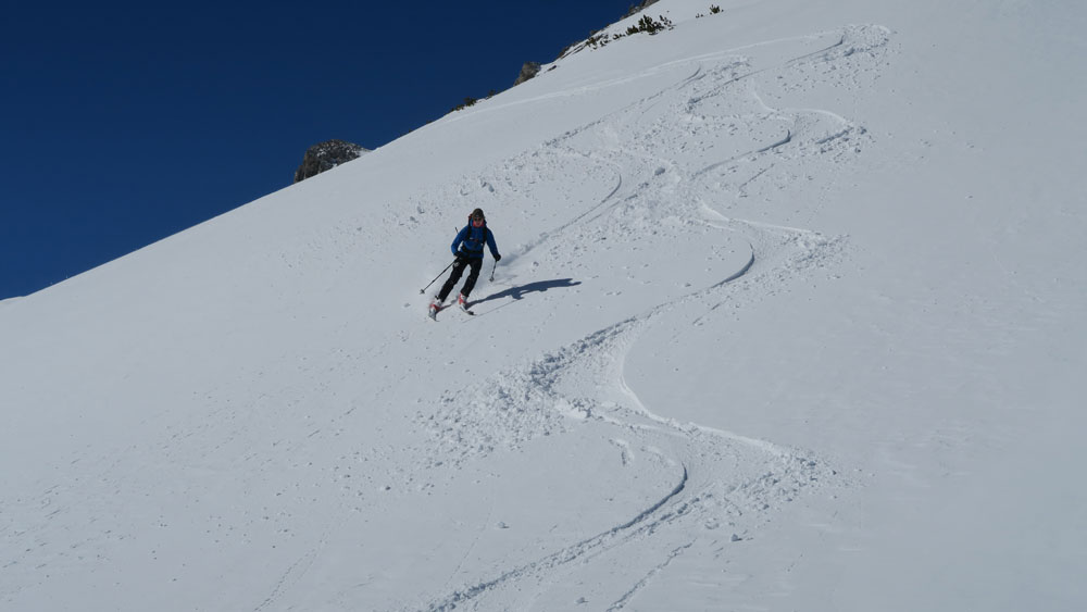 Tourenverhältnisse: Gestern Abend hat es 10 cm ohne Windeinfluss geschneit. Heute Vormittag hat es dann wieder aufgemacht und es wurde sonnig. Der pulvrige Neuschnee lag auf einer harten, gut gesetzten Unterlage. Perfekt zum Fahren. Dazu noch eine sehr schöne Landschaft!