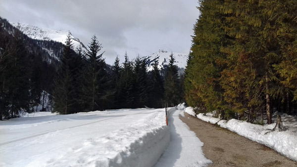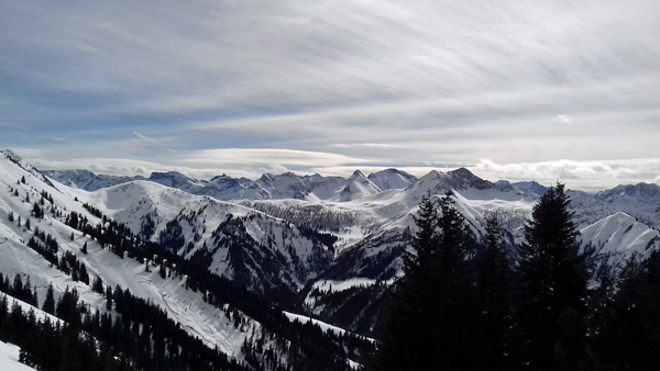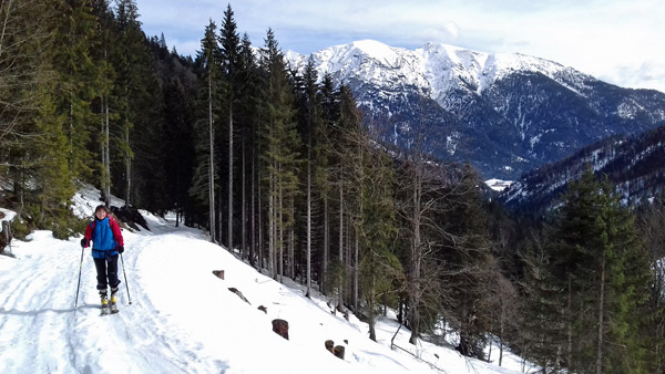 Tourenverhältnisse: Pünktlich zum Start um 10:45 Uhr kam die Sonne heraus und bescherte uns einen warmen und windstillen Aufstieg. Nur am Gipfel war ein leichter Wind zu spüren. Die Forststraße ist am Anfang bereits aper, man kann aber gut auf der parallel verlaufenden Loipe ausweichen. Danach ist noch alles fett eingeschneit. Oberhalb der Hochstegenalm hat eine Lawine die Straße zugedeckt, man kommt aber problemlos durch. Für die Abfahrt wären heute gut gewachste Ski notwendig gewesen. Der Schnee war doch sehr stumpf. Wenig Leute unterwegs.