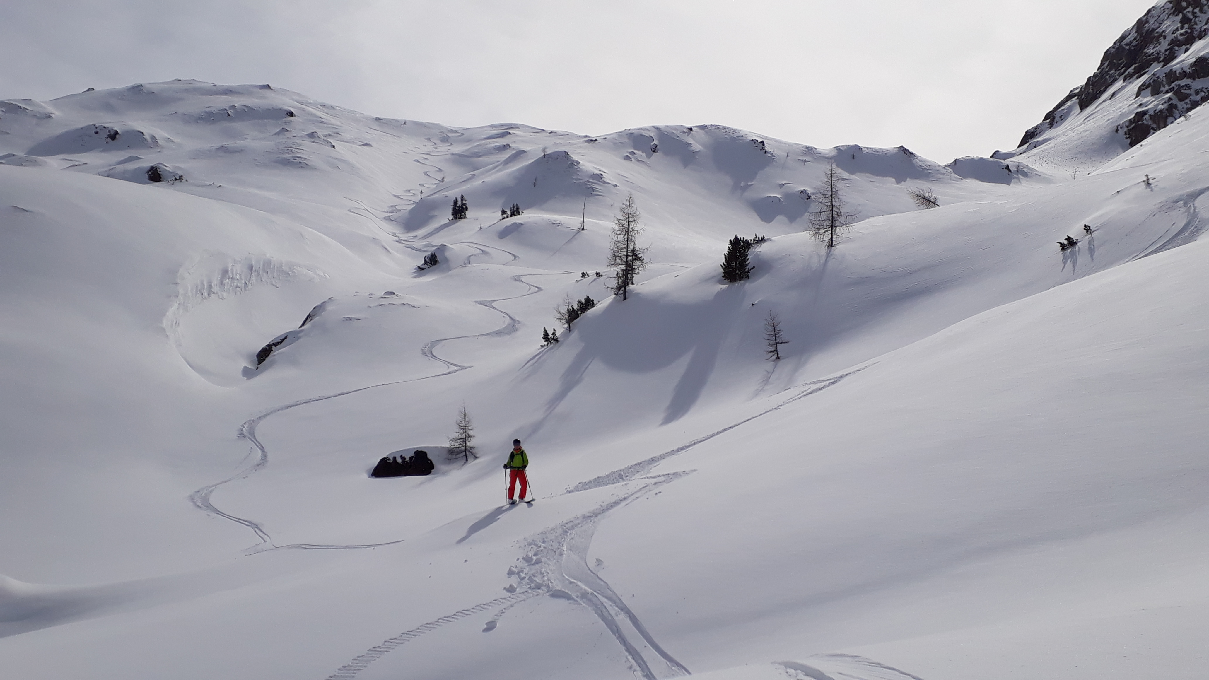 Tourenverhältnisse: oben Pulverschnee, unten sulzig