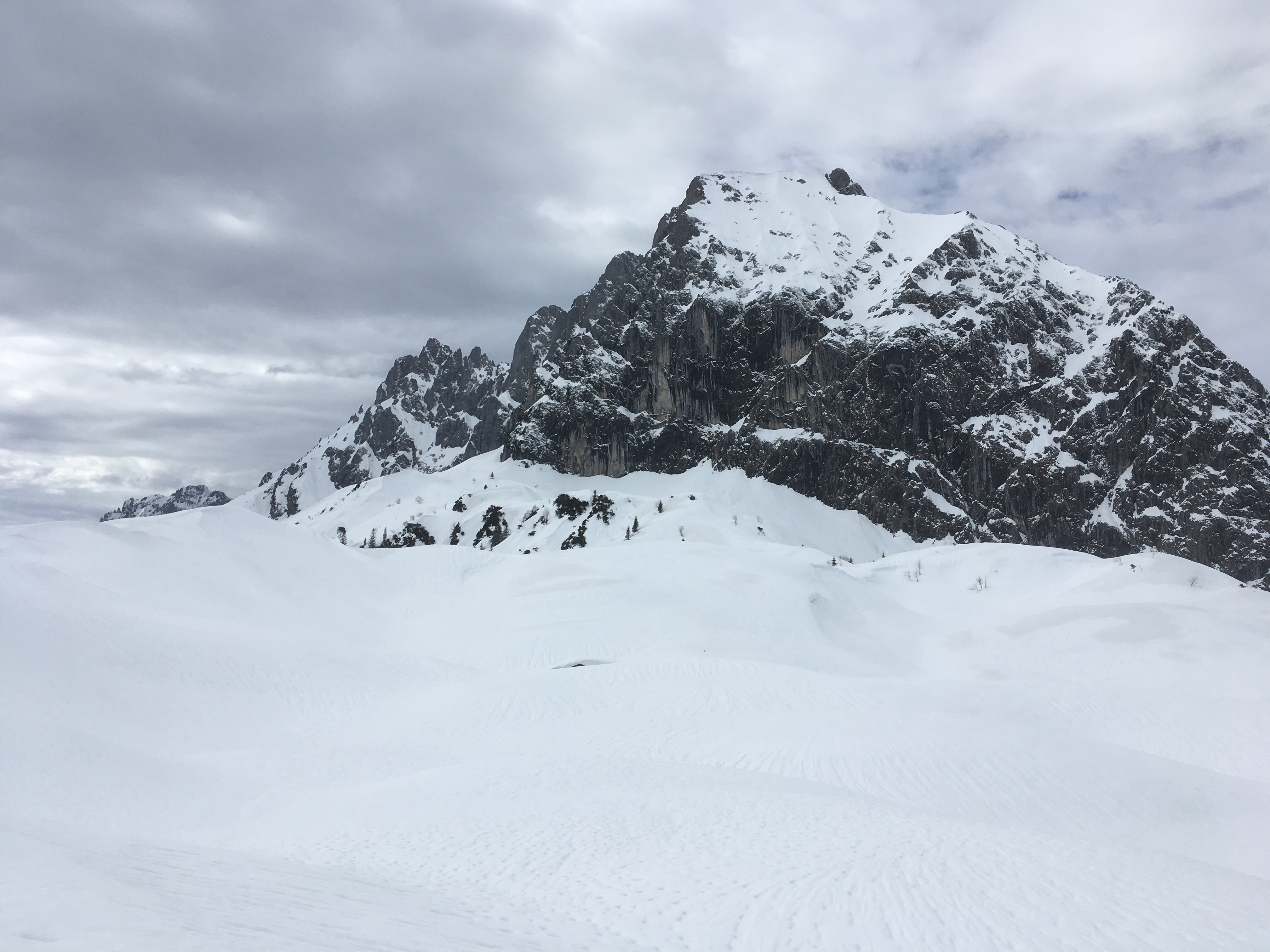 Tourenverhältnisse: noch sehr gute Schneelage vom Ausgangspunkt weg, aber die Schneebeschaffenheit war durch den Regen sehr bescheiden