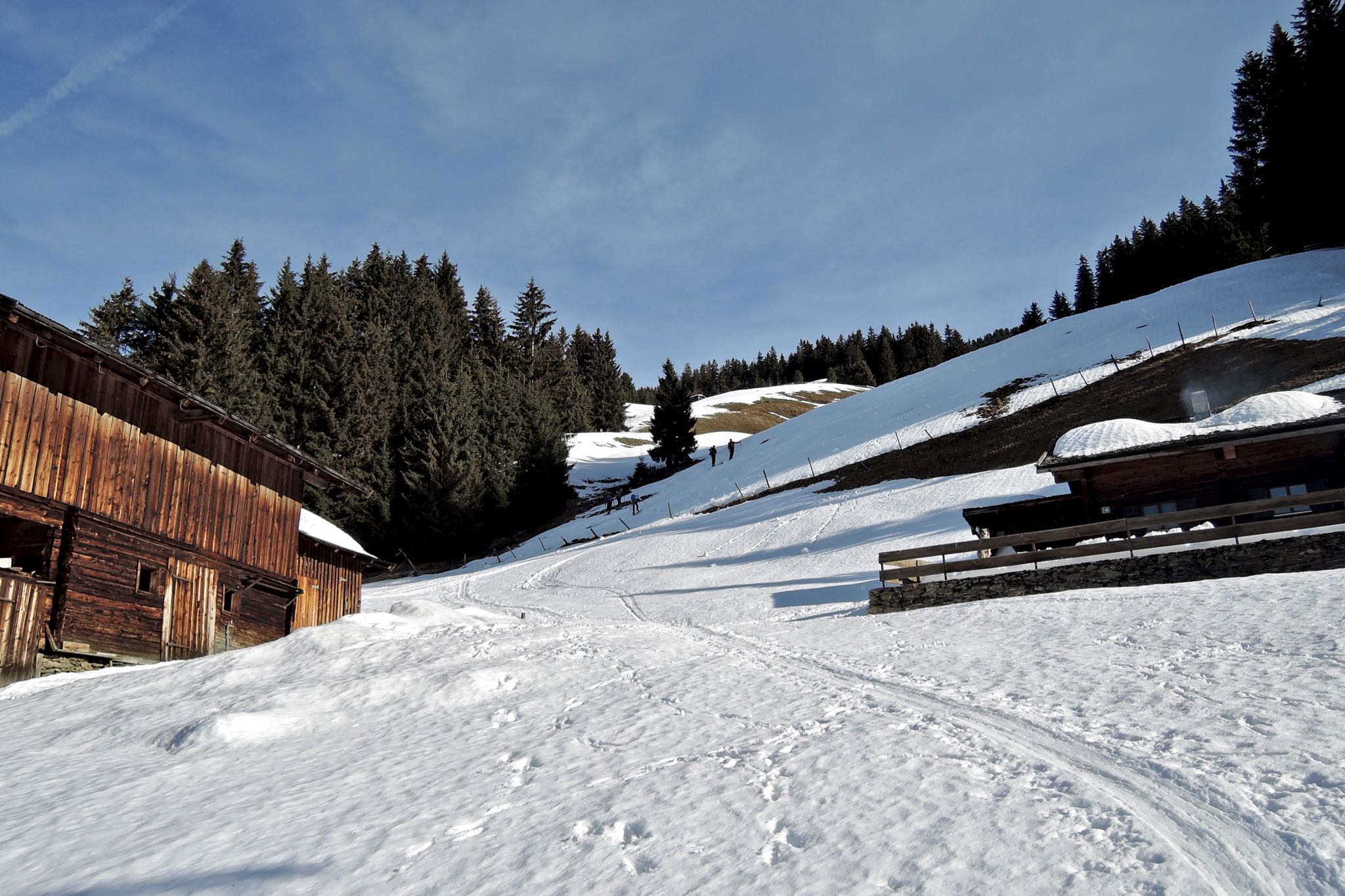 Tourenverhältnisse: Die ersten Meter auf dem Forstweg muss man 4x abschnallen, danach durchgängig Schnee. Morgens ist der Schnee noch gefroren, d.h. auf der vorhandenen Spur waren Harscheisen angenehm. Ab Mittag wurde der Schnee auf den sonnseitigen (SW-) Hängen sehr schnell sehr weich, war aber immer gut zu fahren, da vorhandene Spuren genauso weich waren...