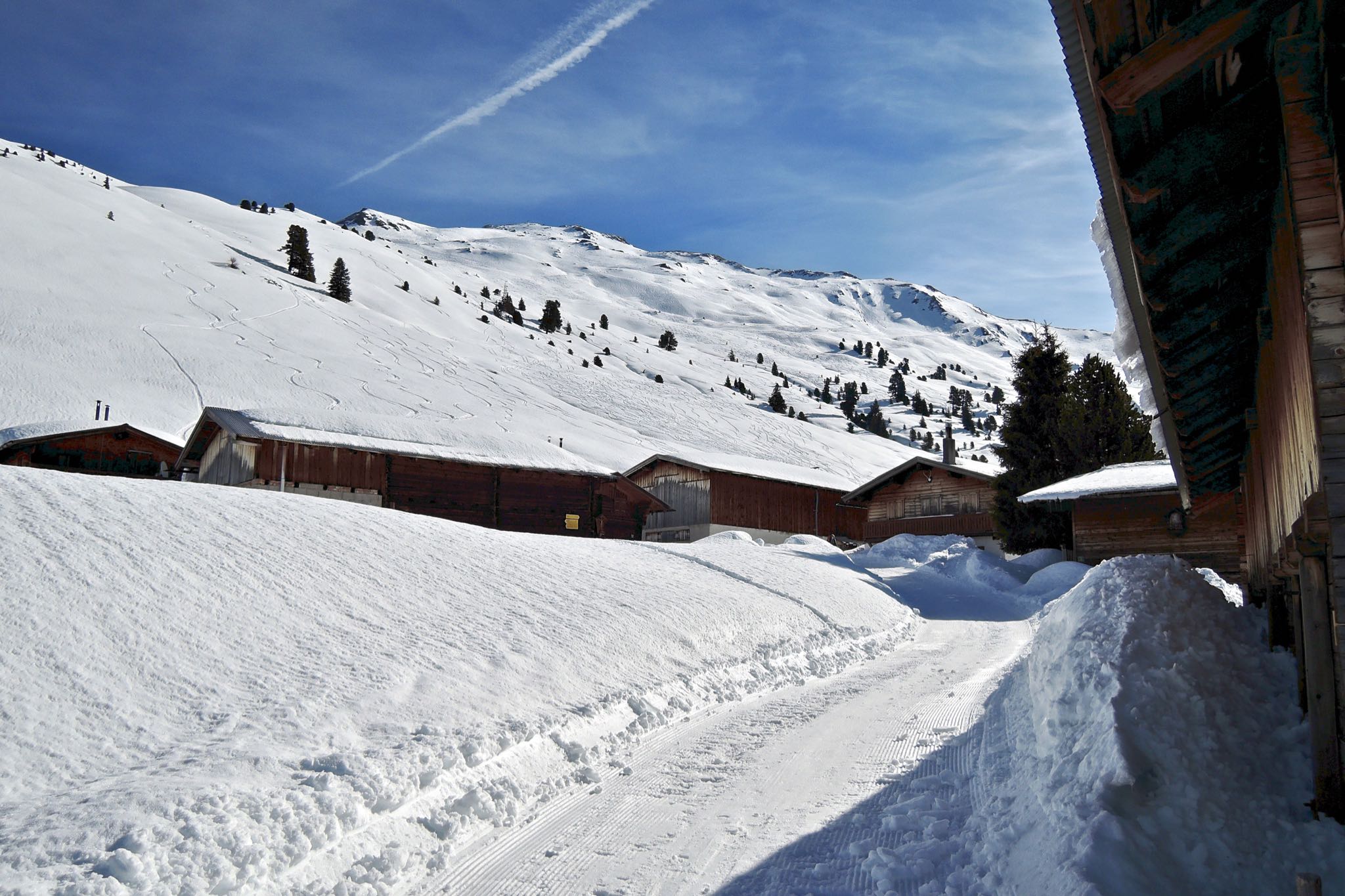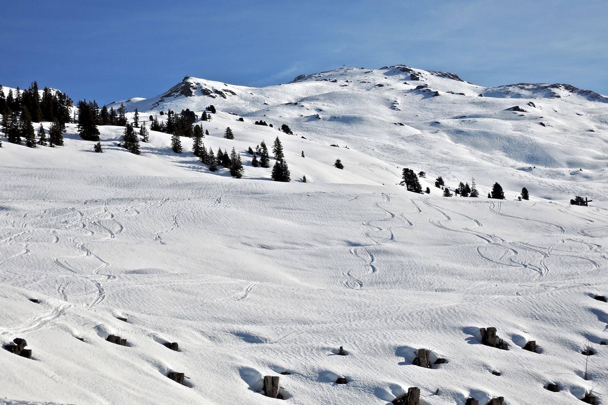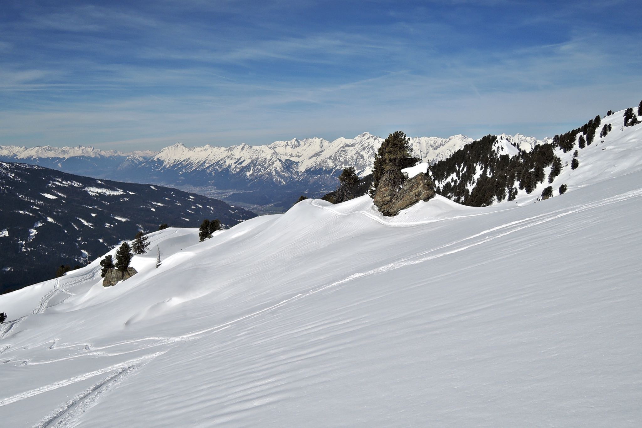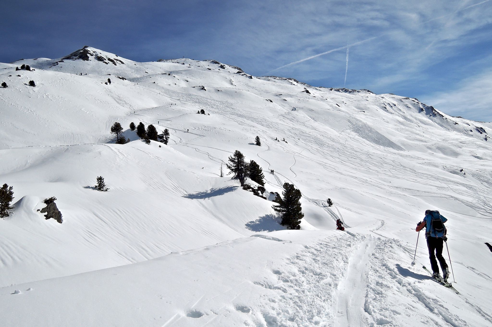 Runter zu Beginn entlang der Aufstiegsspur, ab 2100m etwas links haltend zu den Nonsalmen hinab. Weiter wie im Aufstieg.
