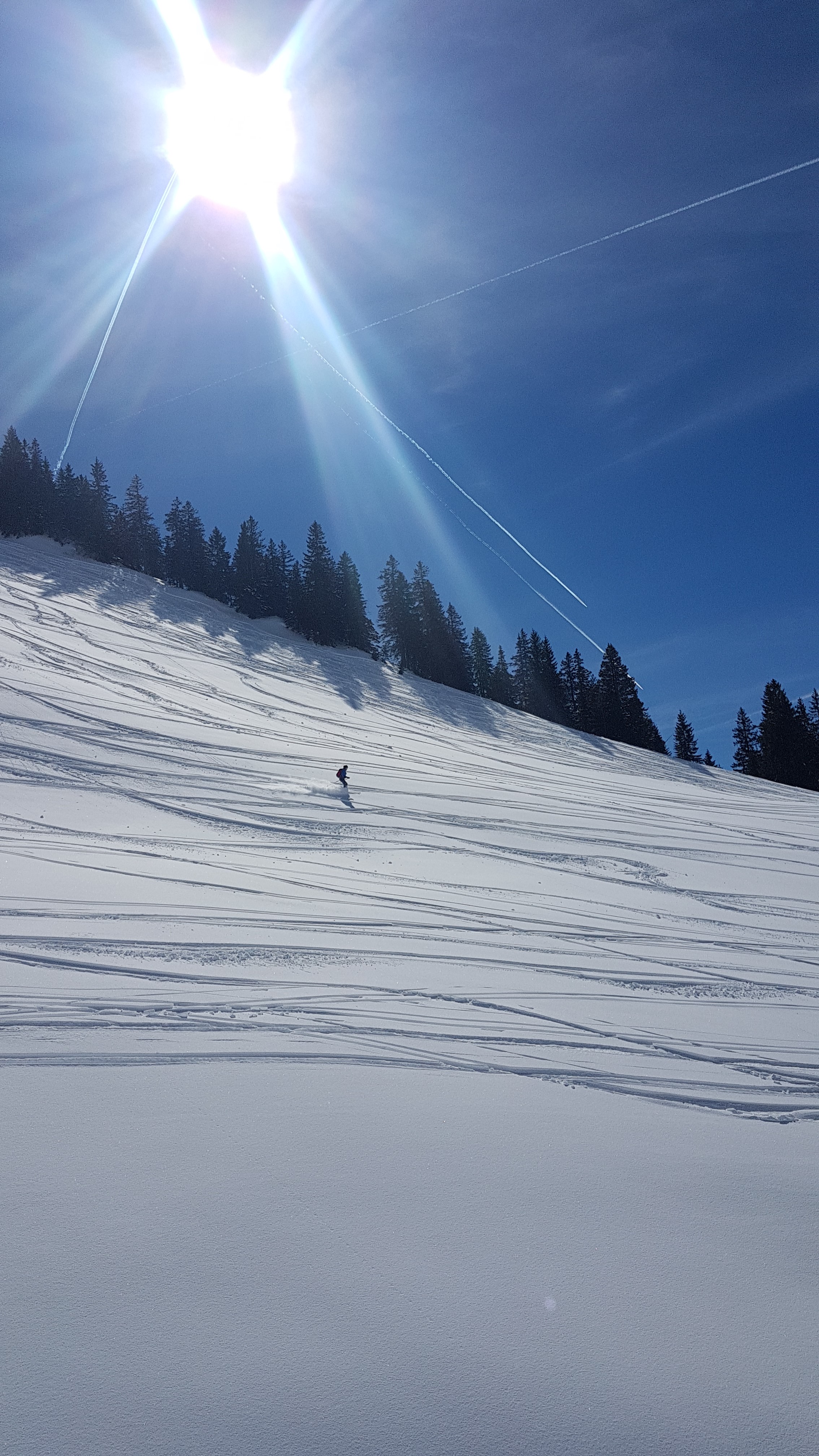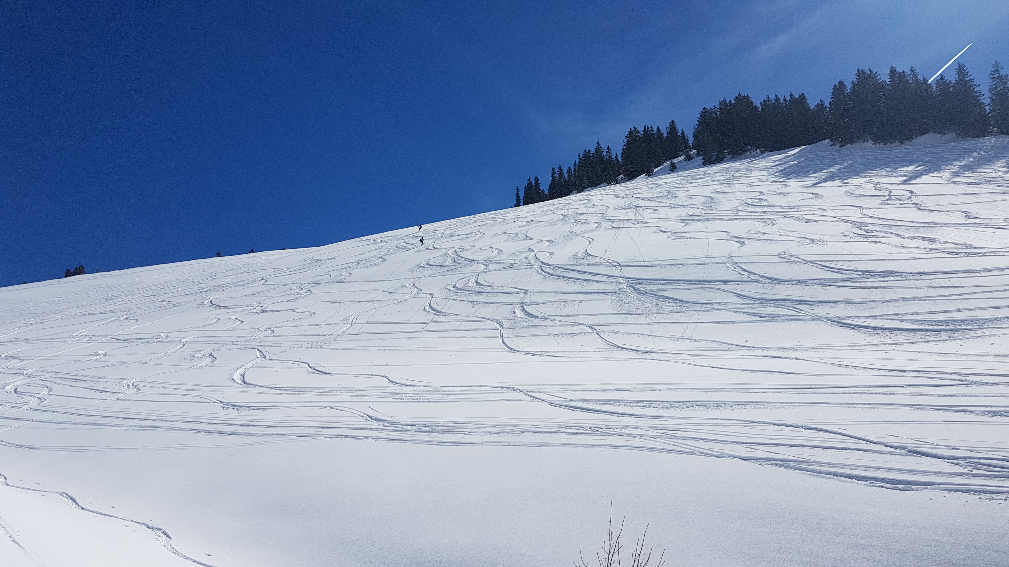 Tourenverhältnisse: Immer noch sehr gut. Der unterste Teil der ehemaligen Piste ist schon bisschen eisig, daher ist es besser unter der Seilbahntrasse aufzusteigen, das geht noch sehr gut. Am Rauhkopf dann noch Pulver, große Hangbereiche schon verspurt, aber man findet immer noch Platz für eine eigene Spur.
