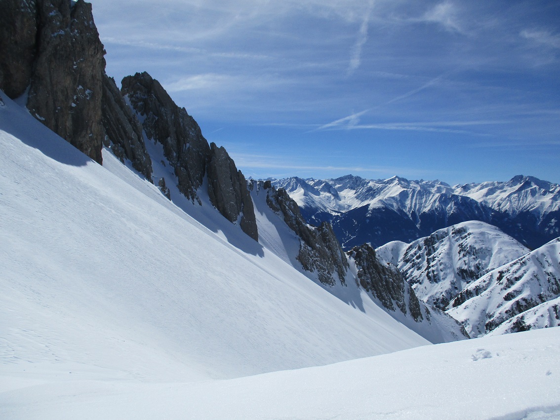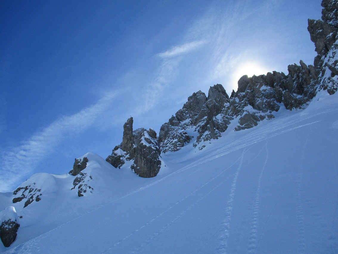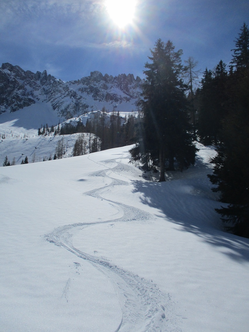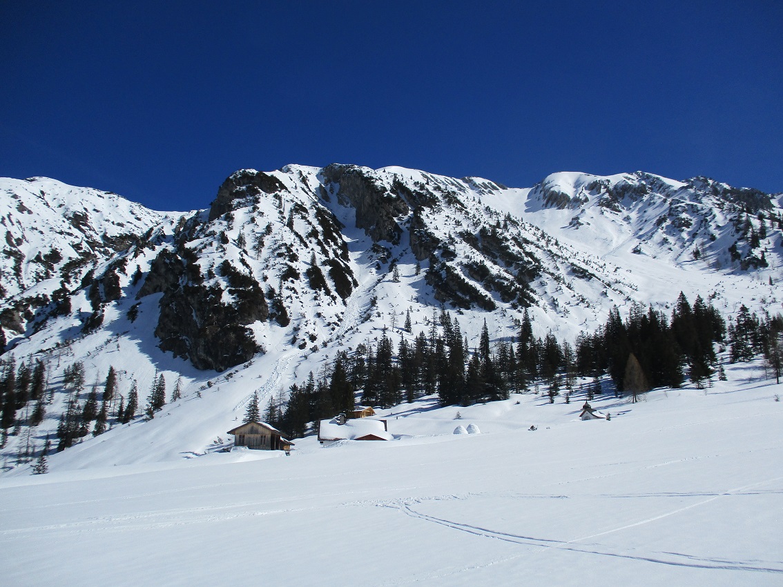 Tourenverhältnisse: Sehr gut / Schnee vom P. weg / gute Aufstiegsspur von gestern / in den oberen Hängen Pulverschnee / danach gut fahrbarer Firn / ab dem Gatter ca. 1300 m wird er feucht und bremsend