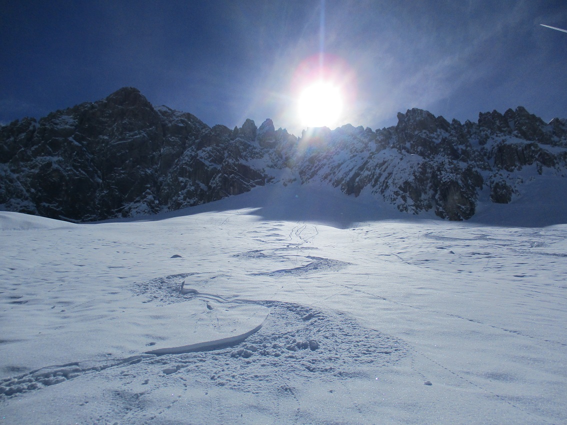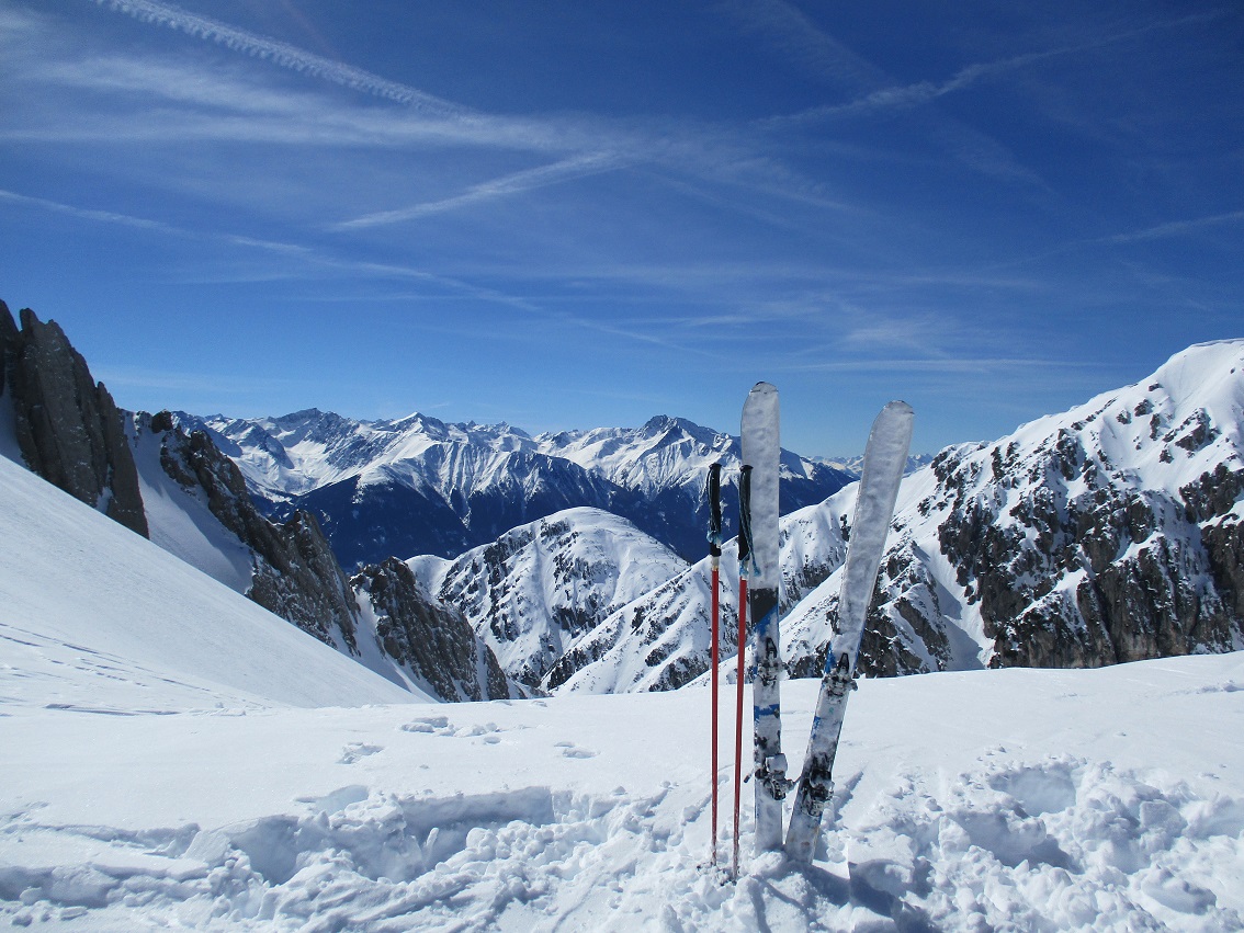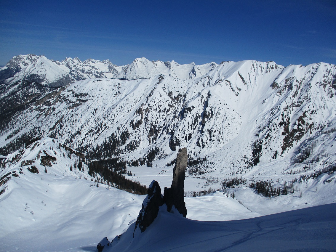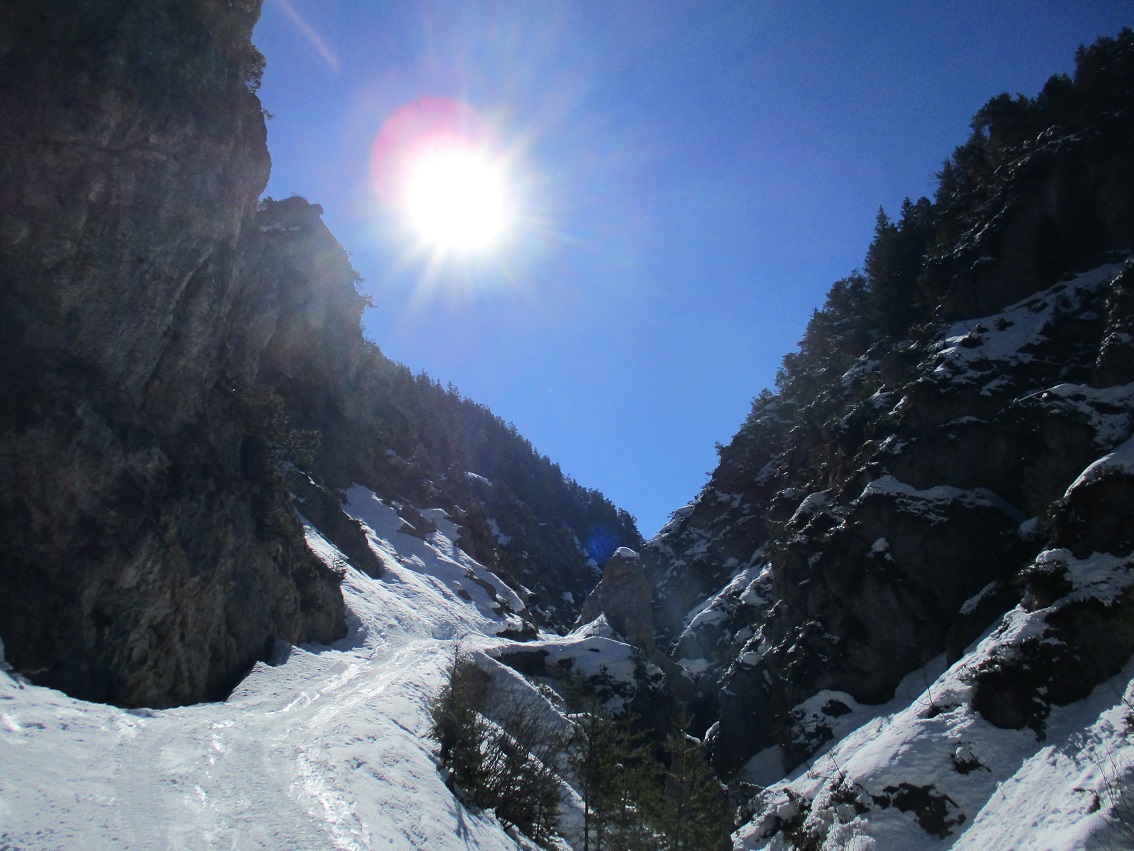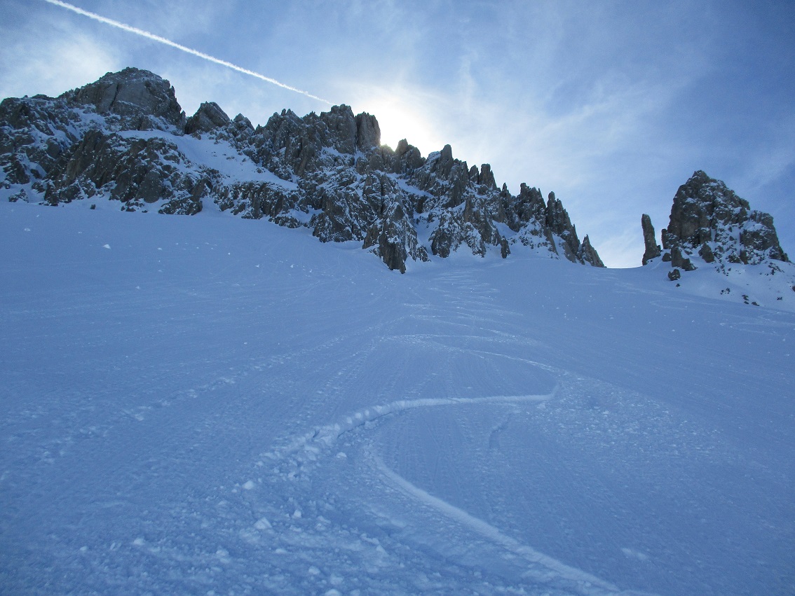 Tourenverhältnisse: Sehr gut / Schnee vom P. weg / gute Aufstiegsspur von gestern / in den oberen Hängen Pulverschnee / danach gut fahrbarer Firn / ab dem Gatter ca. 1300 m wird er feucht und bremsend