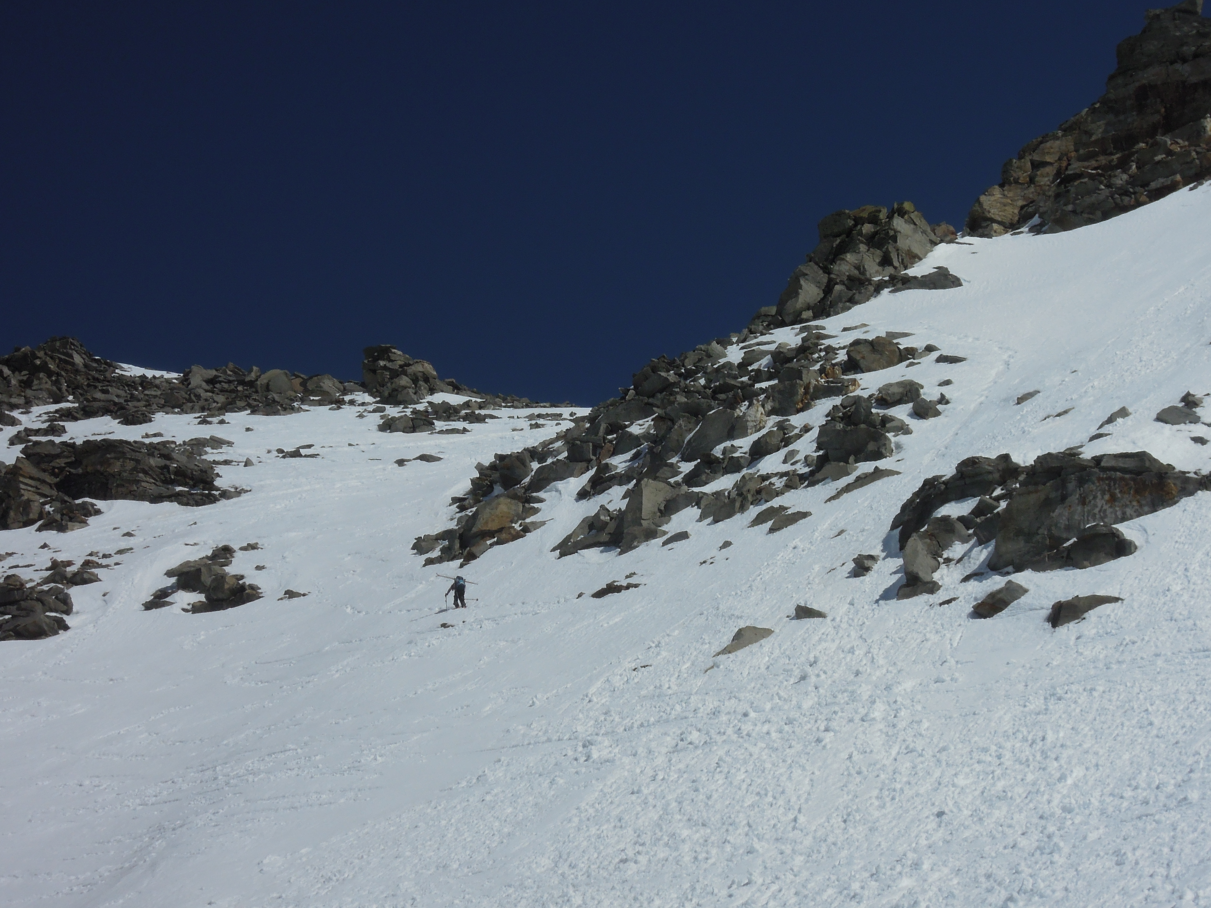 Tourenverhältnisse:Schlußhang sehr steil, Aufstieg zu Fuß; auch in der Abfahrt ist der Hang nicht gut; die Hänge unter dem Schrammacher herrlicher Pulver, d. h. dass noch viele Höhenmeter viel Spaß gemacht haben; unten im Flachteil gings gut;
