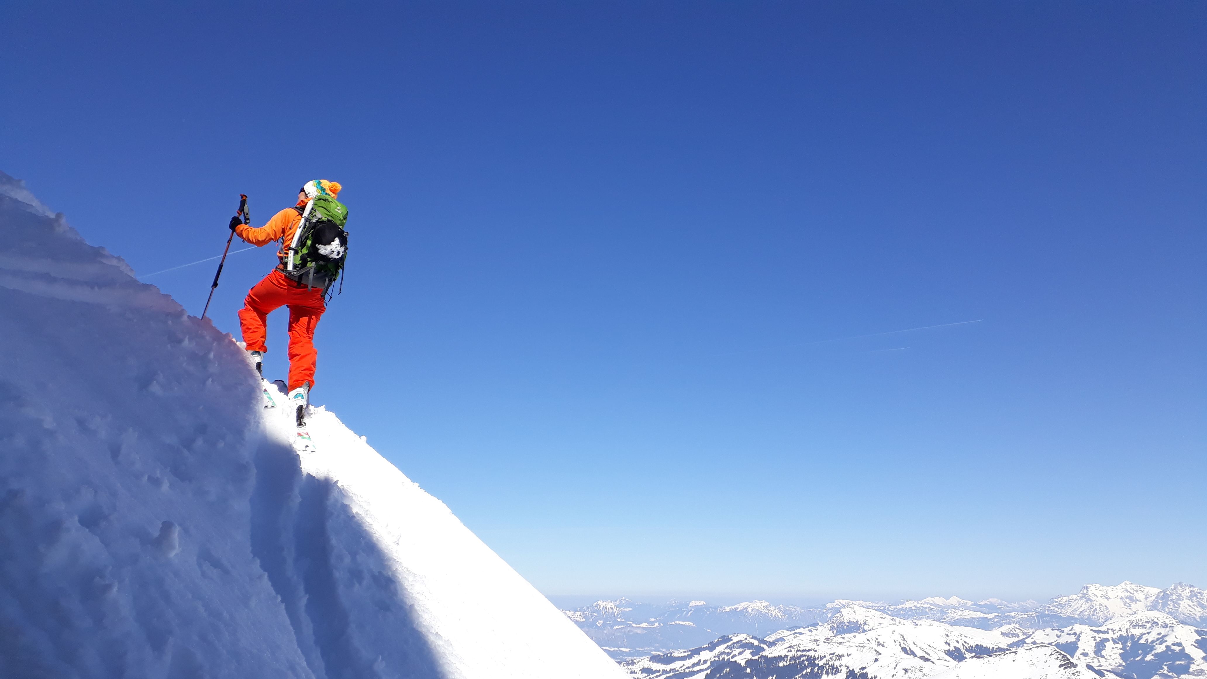 Tourenverhältnisse: Ein Einheimischer hat vor uns hochgespurt. In der Rinne schattseitig schwerer Pulver, da wo die Sonne hinkommt völlig durchweicht. Die letzen 50m zum Gipfel haben wir deshalb alle sein lassen.
