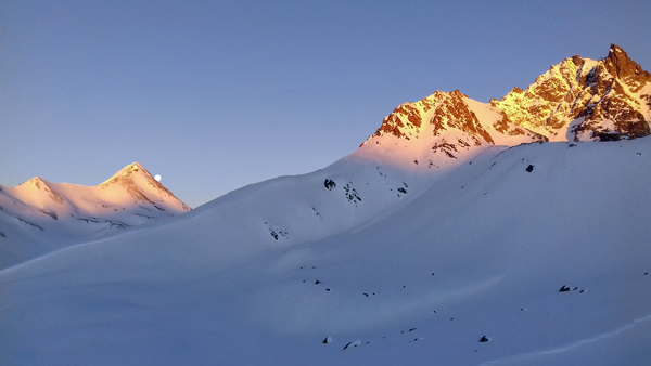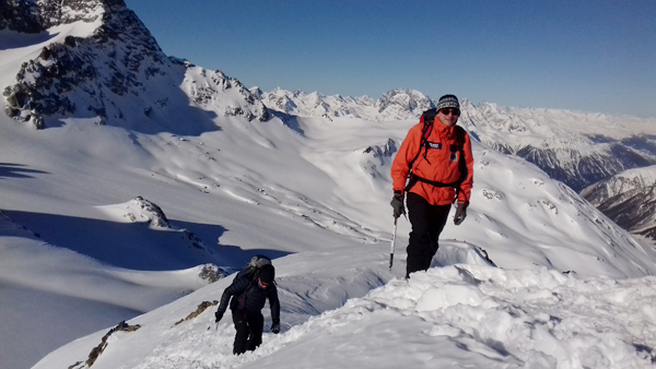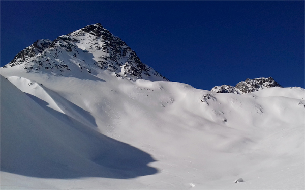 Tourenverhältnisse: 4 Tage wolkenloses Wetter und unverspurte Traumhänge. Den Piz Kesch haben wir bewusst ausgelassen und dafür eine einsame und skifahrerisch interessante Umrundung gewählt. Aufstieg von Madulain über die Chamanna d' es cha zur Fuorcla Pischa (2871 m)