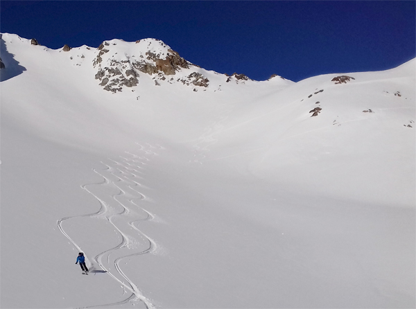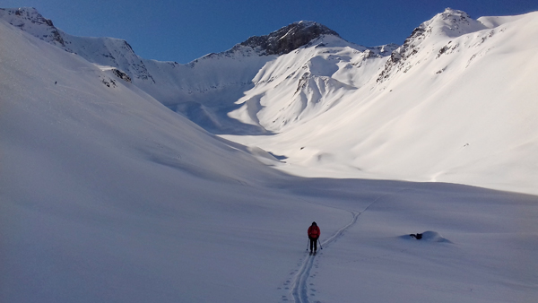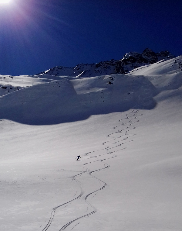 Abfahrt durch das Val Plazbi zur Alp digl Chant(1952 m) mit anschließendem Aufstieg zur Kesch Hütte. Tour zum Innominata (Pkt. 2040 m) mit anschließender Abfahrt ins Val Tschüvel. Aufstieg Kesch Hütte. Piz Porchabella (3079 m) und Abfahrt durch das Val Viluoch und Val Susauna nach Chapella ins Engadin.