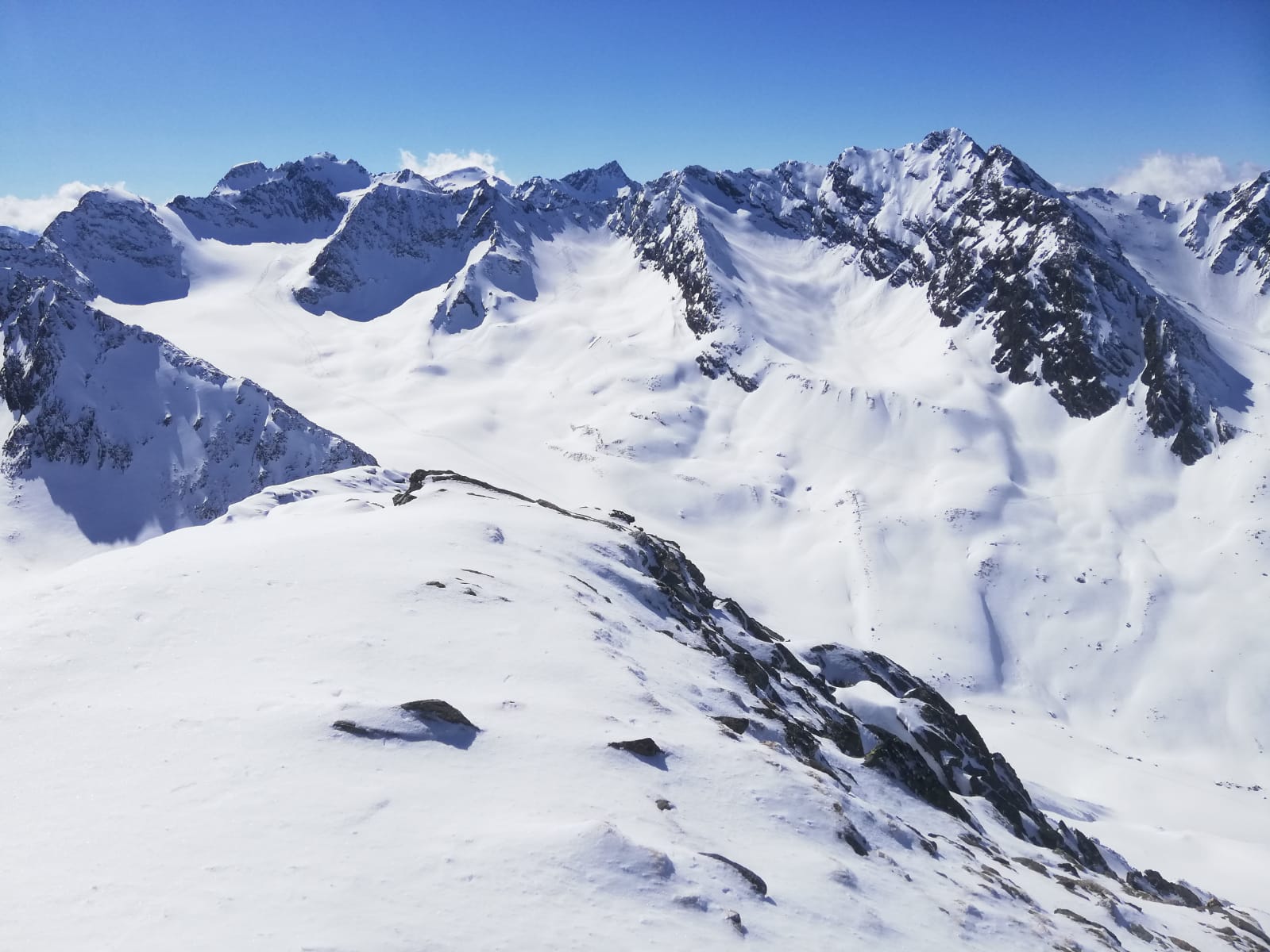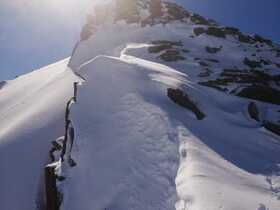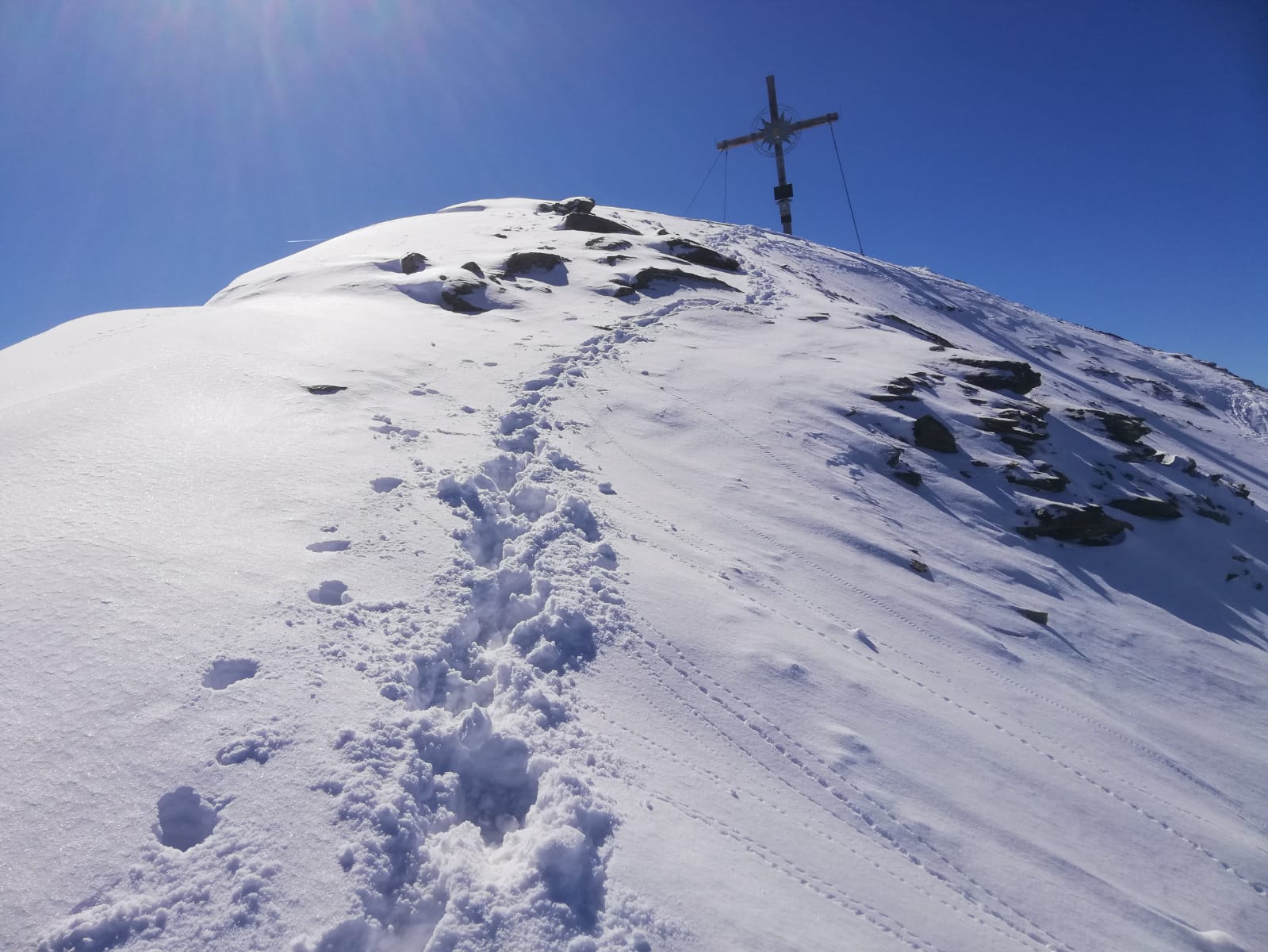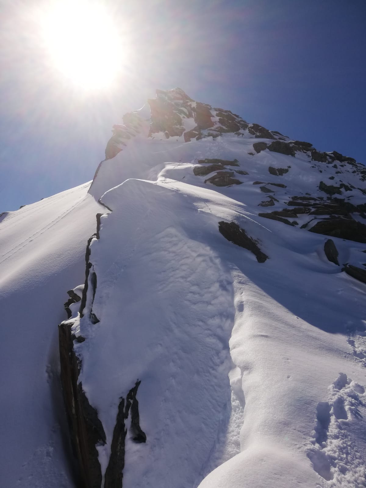 Tourenverhältnisse: Genial! Neuschnee über Nacht, unten ca. 5cm, weiter oben 15-20cm. Sonnig ab dem Morgen, aber kalt, so dass der Pulver auch nachmittags noch super war. Über Kamplloch und Nordostgrat zum Gipfel. Gipfelaufbau wegen der plattigen Felsen mit Pulverauflage durchaus etwas anspruchsvoller, die kurz vor dem Gipfel angebrachte Kette war heute kein Luxus.
