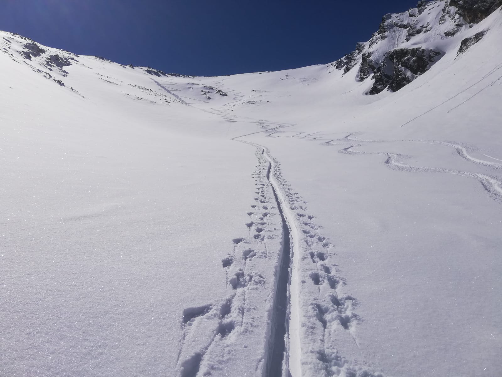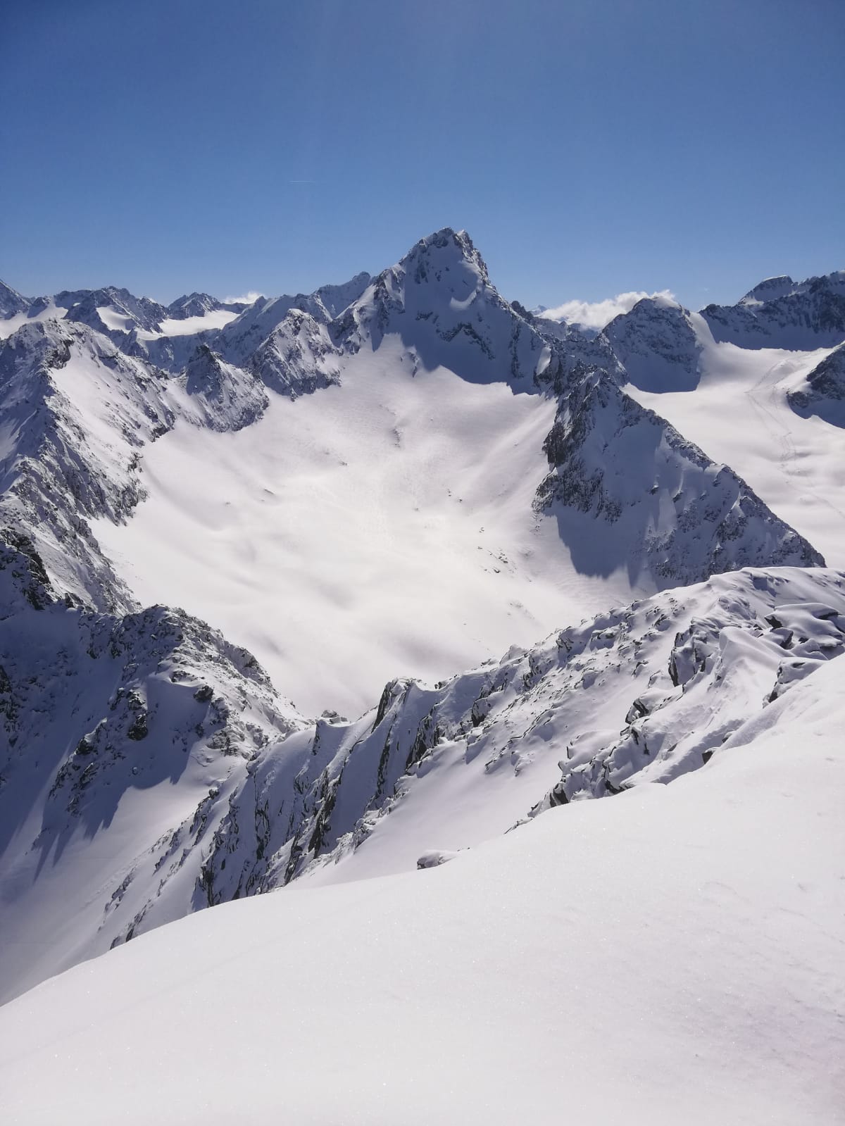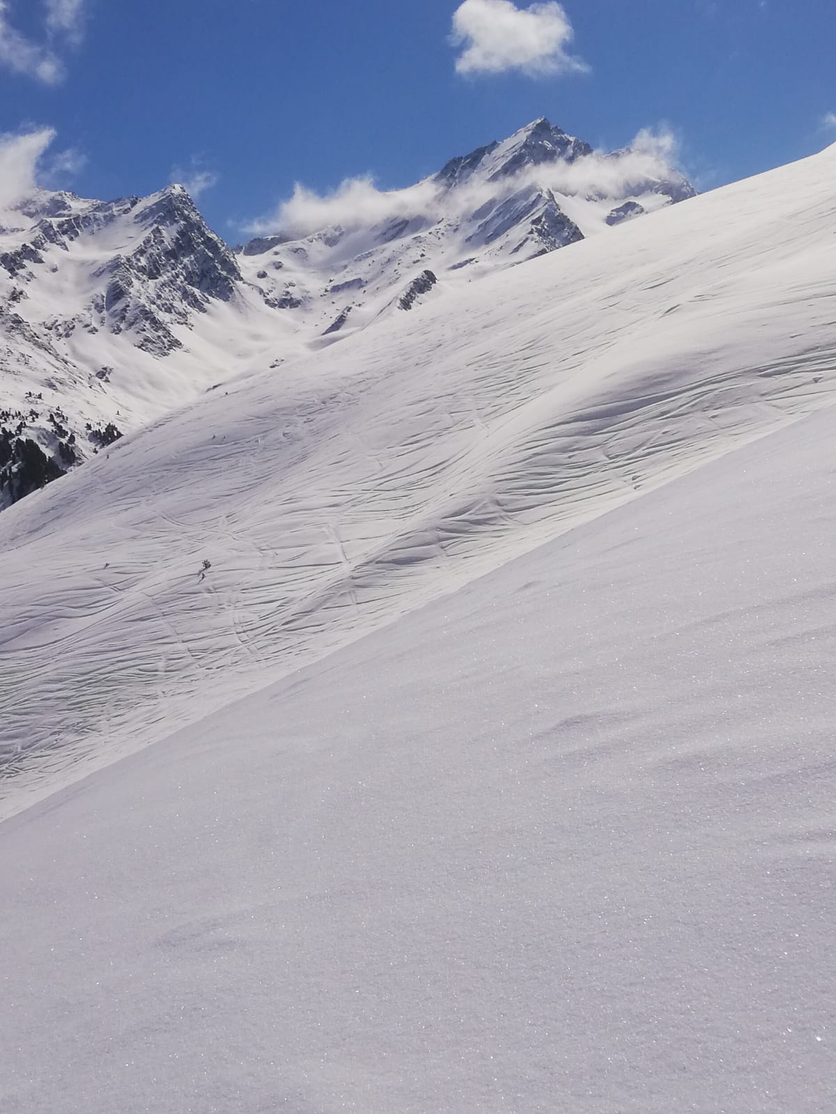 Tourenverhältnisse: Genial! Neuschnee über Nacht, unten ca. 5cm, weiter oben 15-20cm. Sonnig ab dem Morgen, aber kalt, so dass der Pulver auch nachmittags noch super war. Über Kamplloch und Nordostgrat zum Gipfel. Gipfelaufbau wegen der plattigen Felsen mit Pulverauflage durchaus etwas anspruchsvoller, die kurz vor dem Gipfel angebrachte Kette war heute kein Luxus.