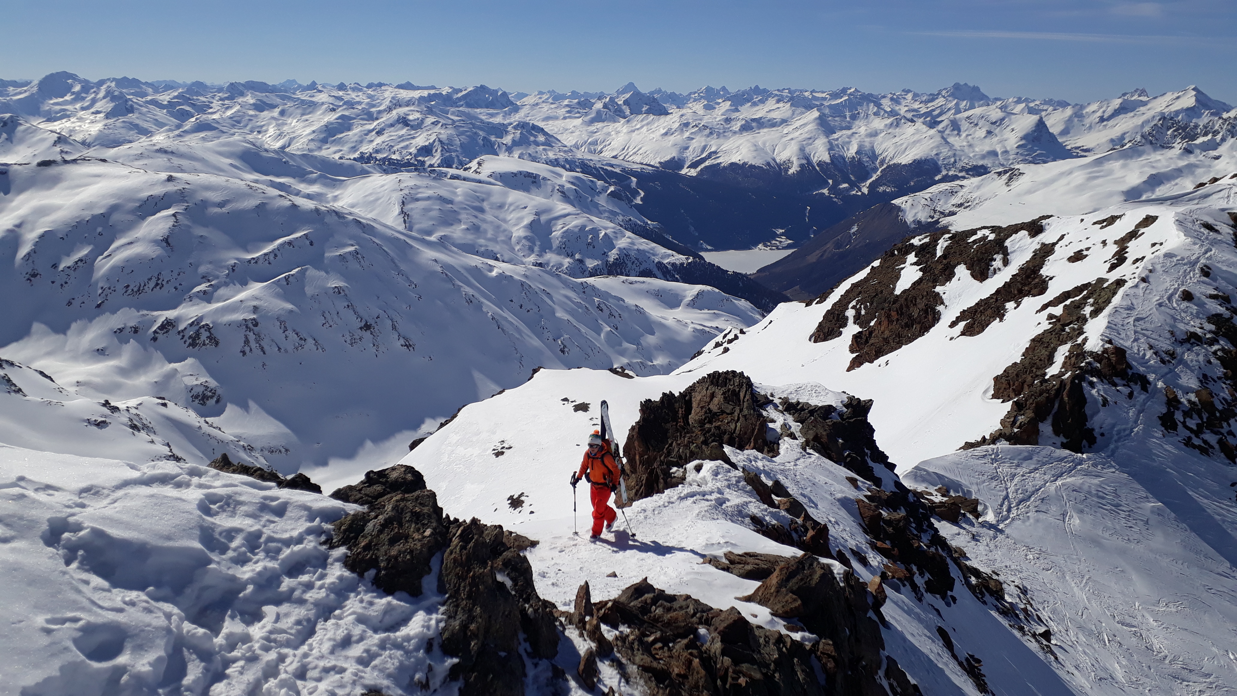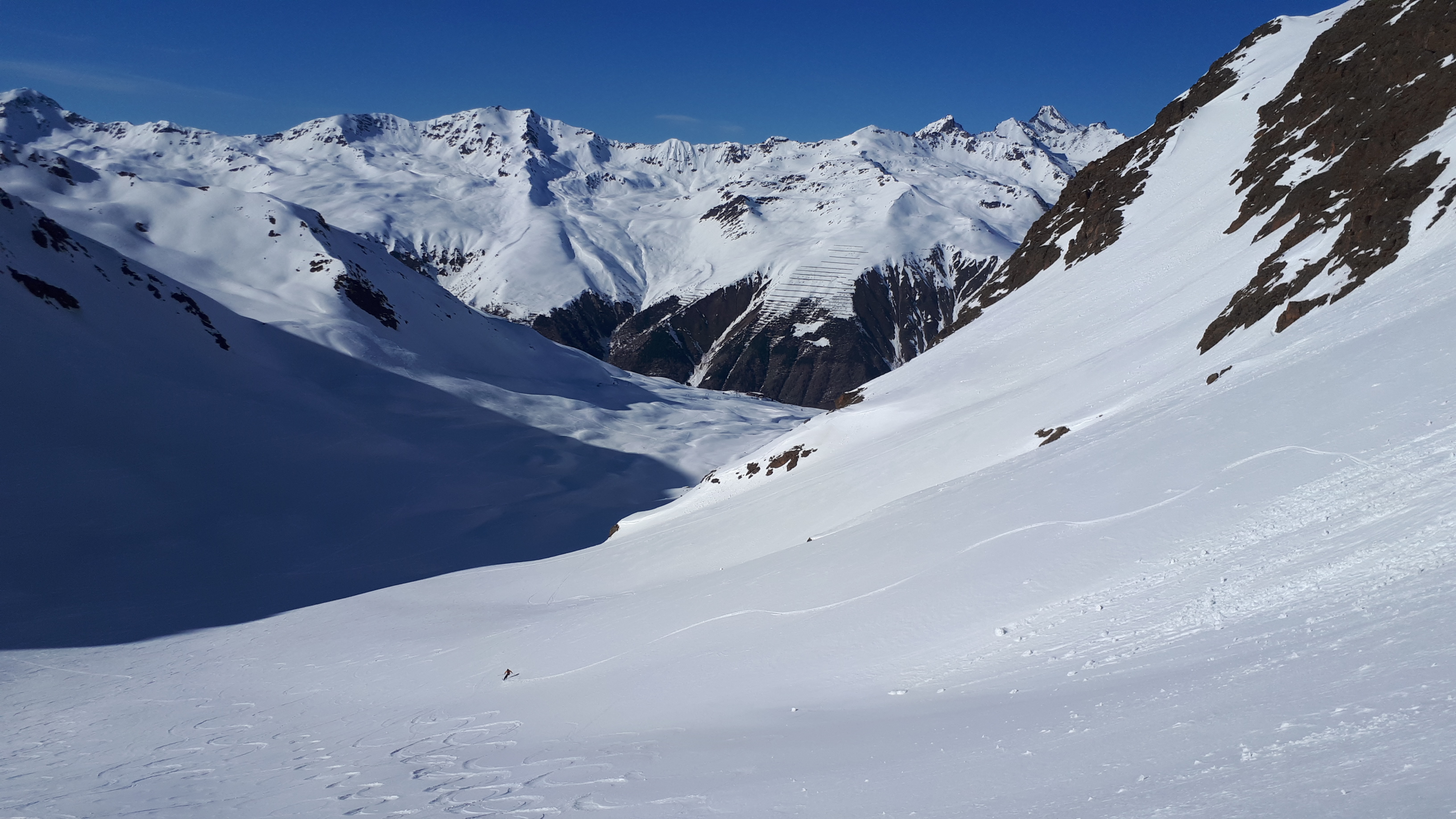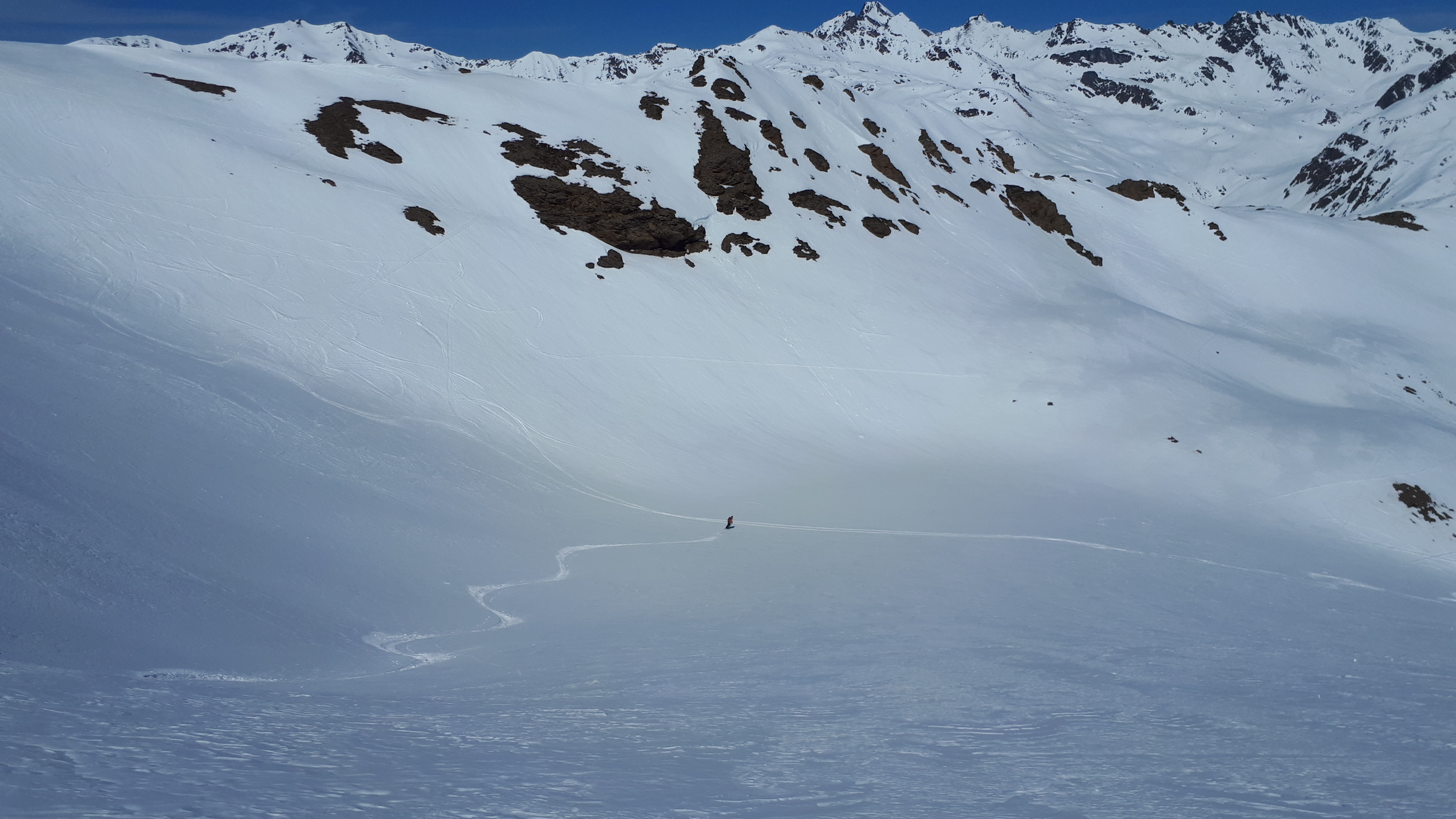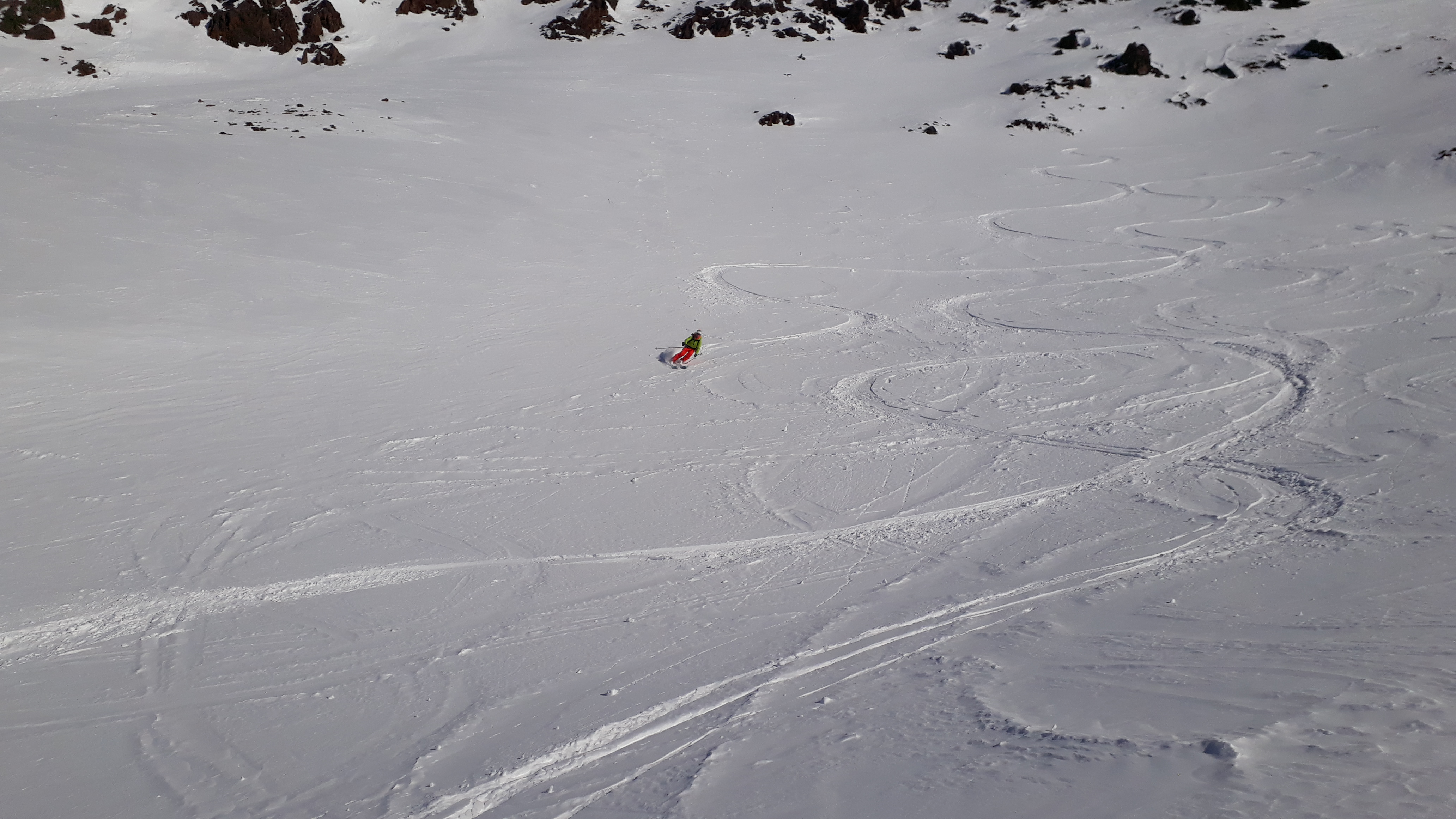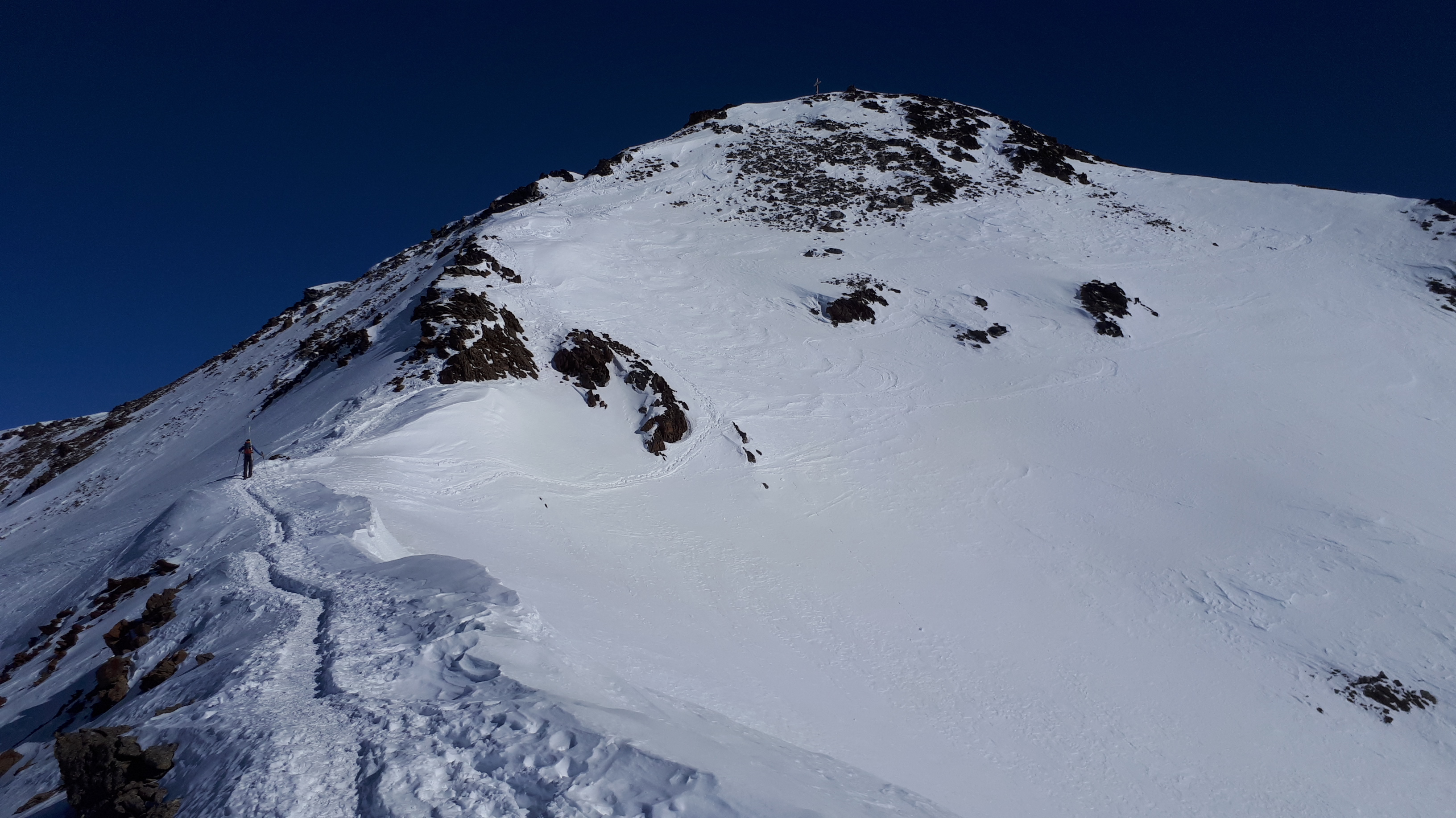 Tourenverhältnisse: viel windverpresst, aber durchaus auch noch schöner Pulver, unten Firn