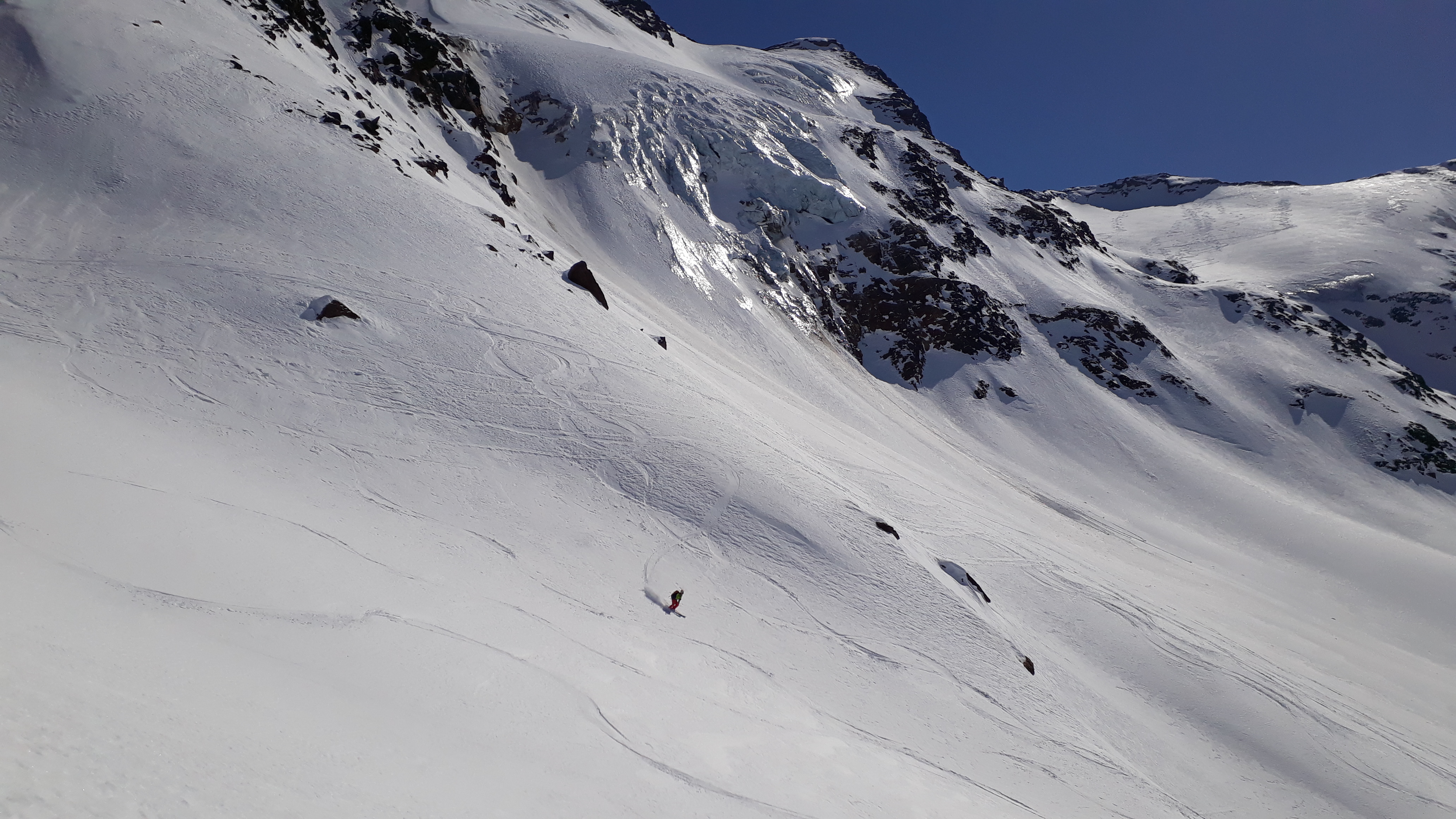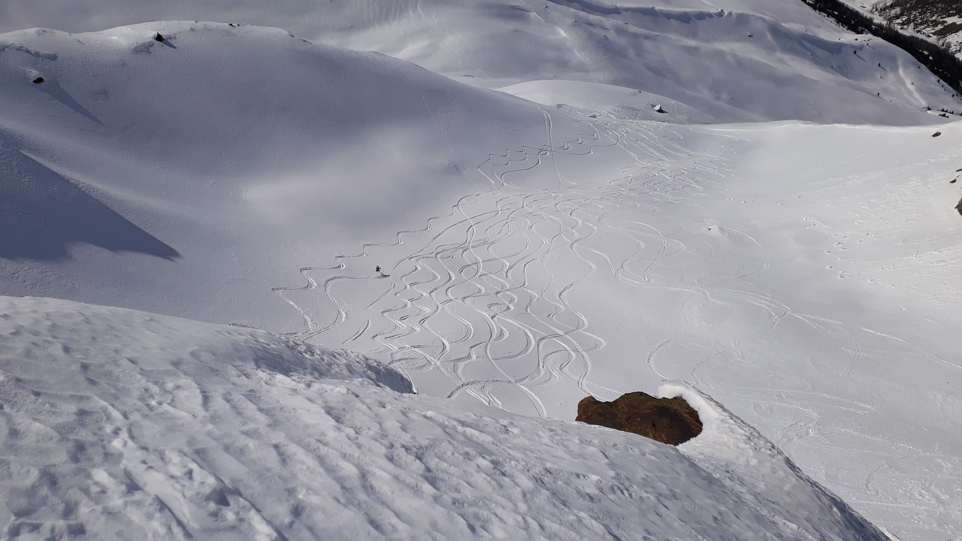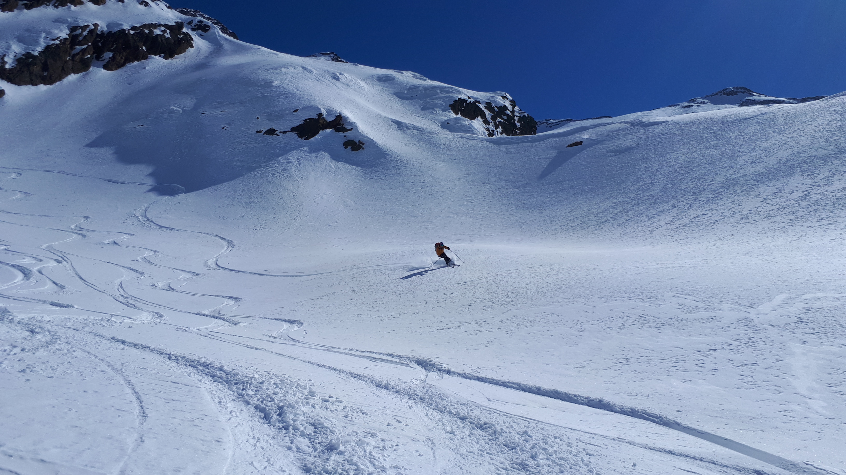 Tourenverhältnisse: viel windverpresst, aber durchaus auch noch schöner Pulver, unten Firn