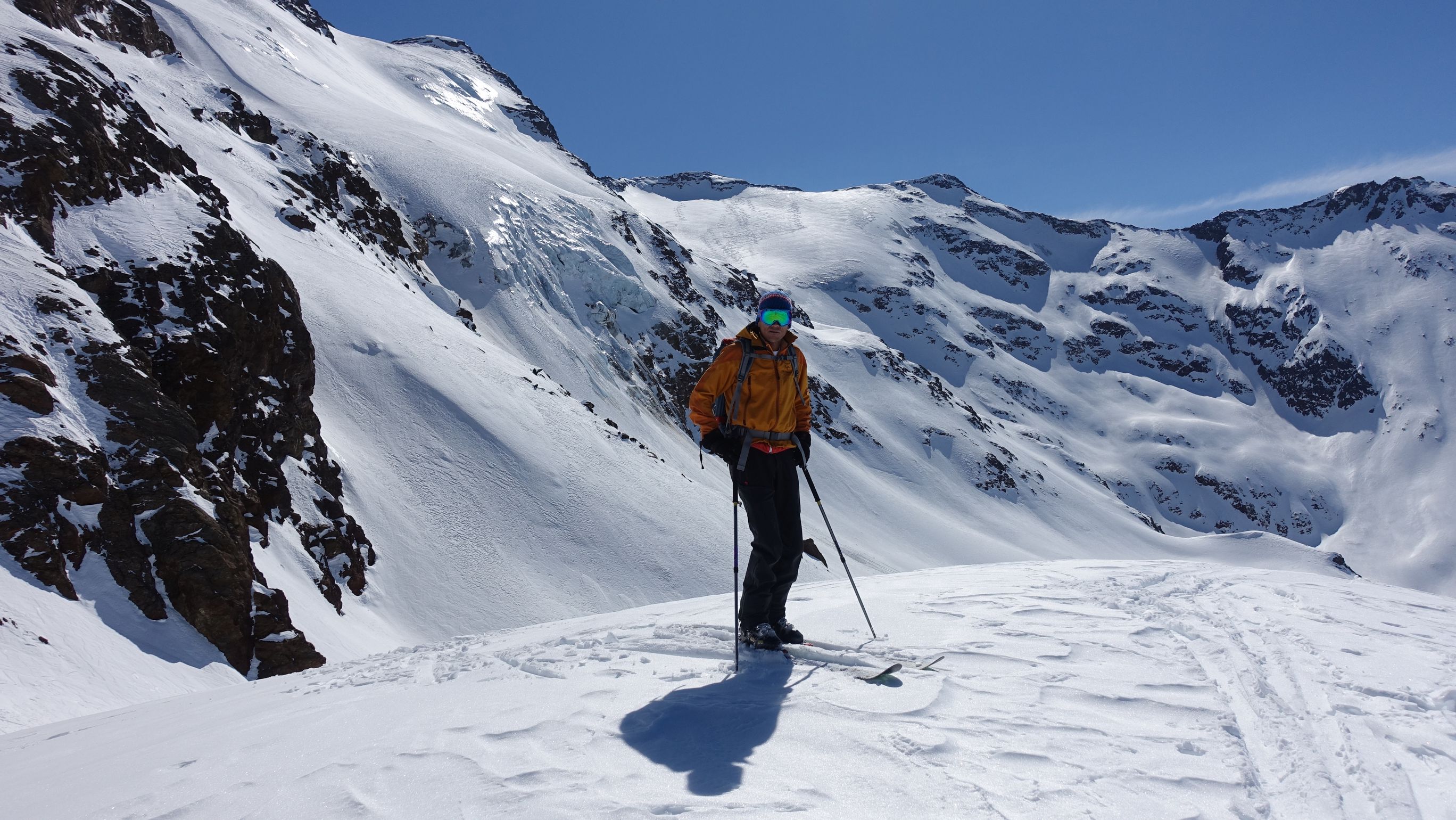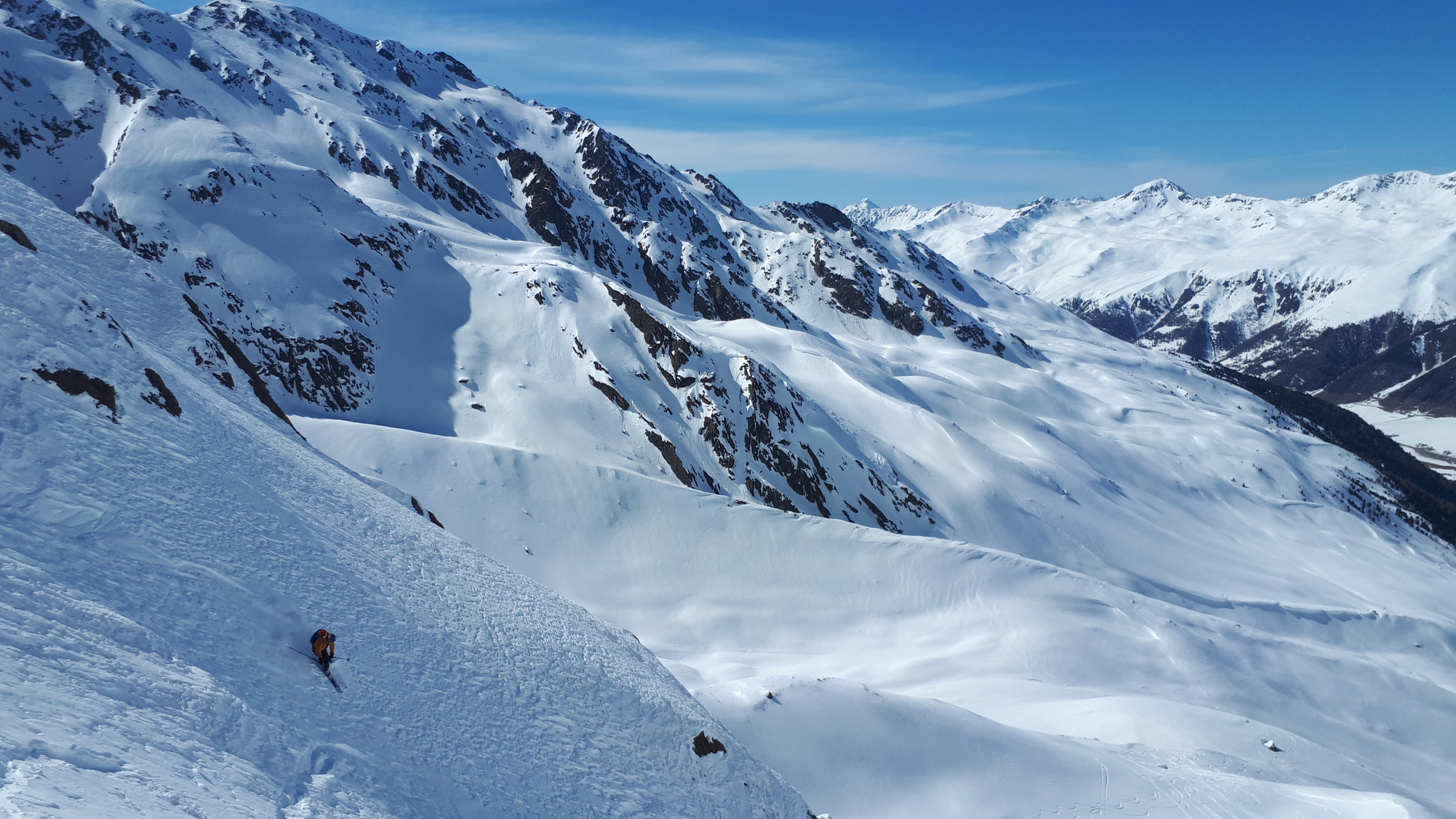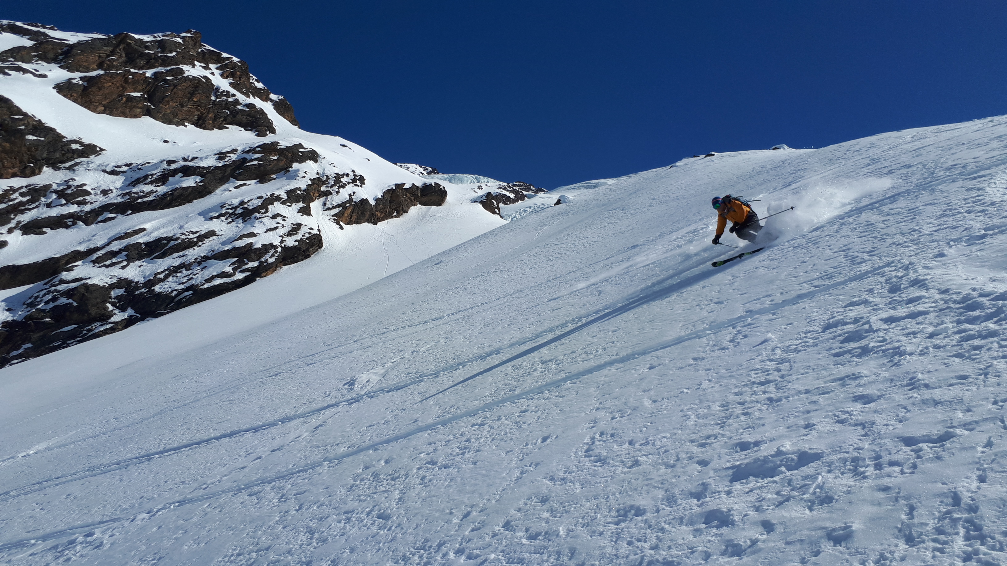 Tourenverhältnisse: viel windverpresst, aber durchaus auch noch schöner Pulver, unten Firn