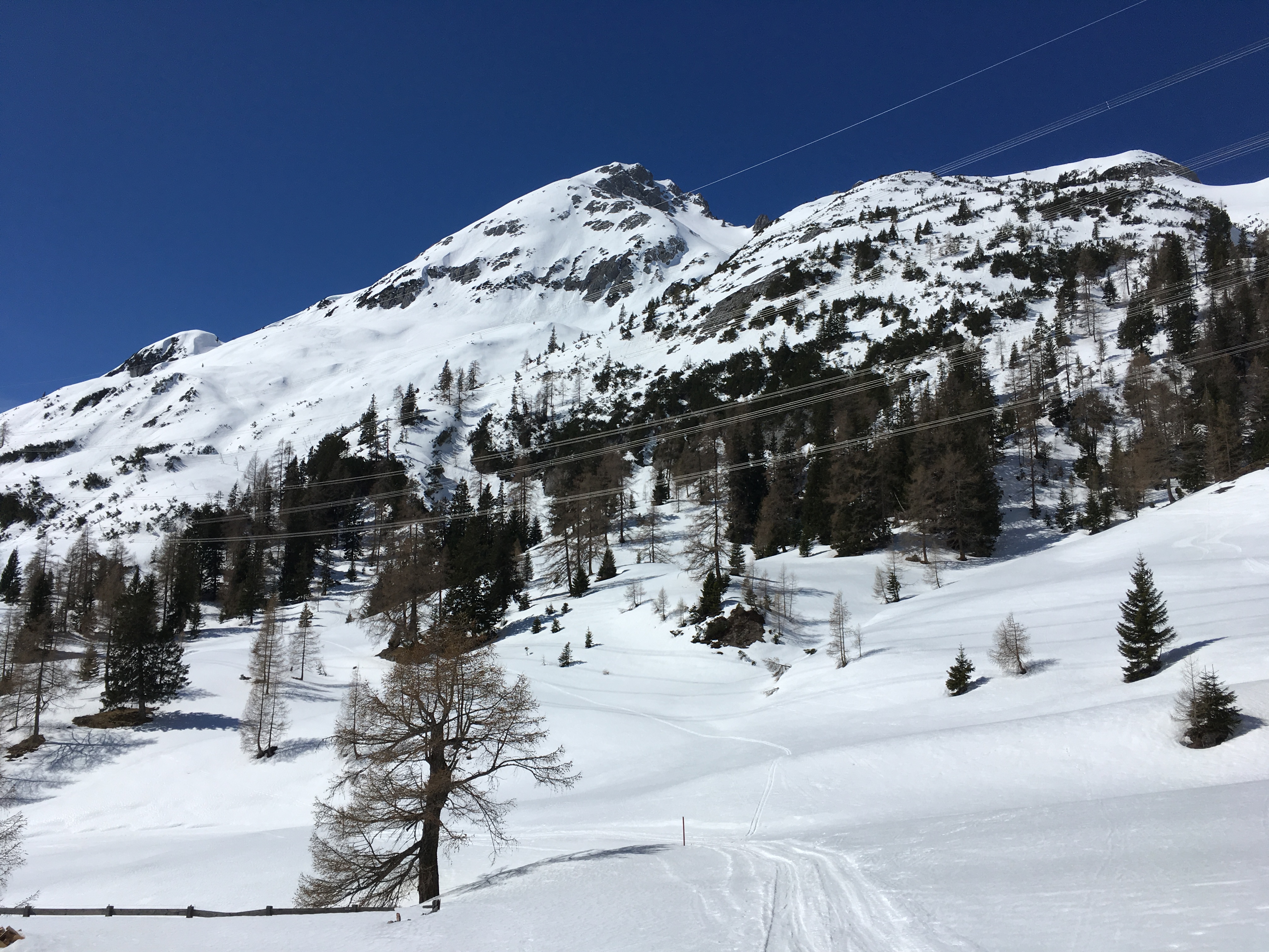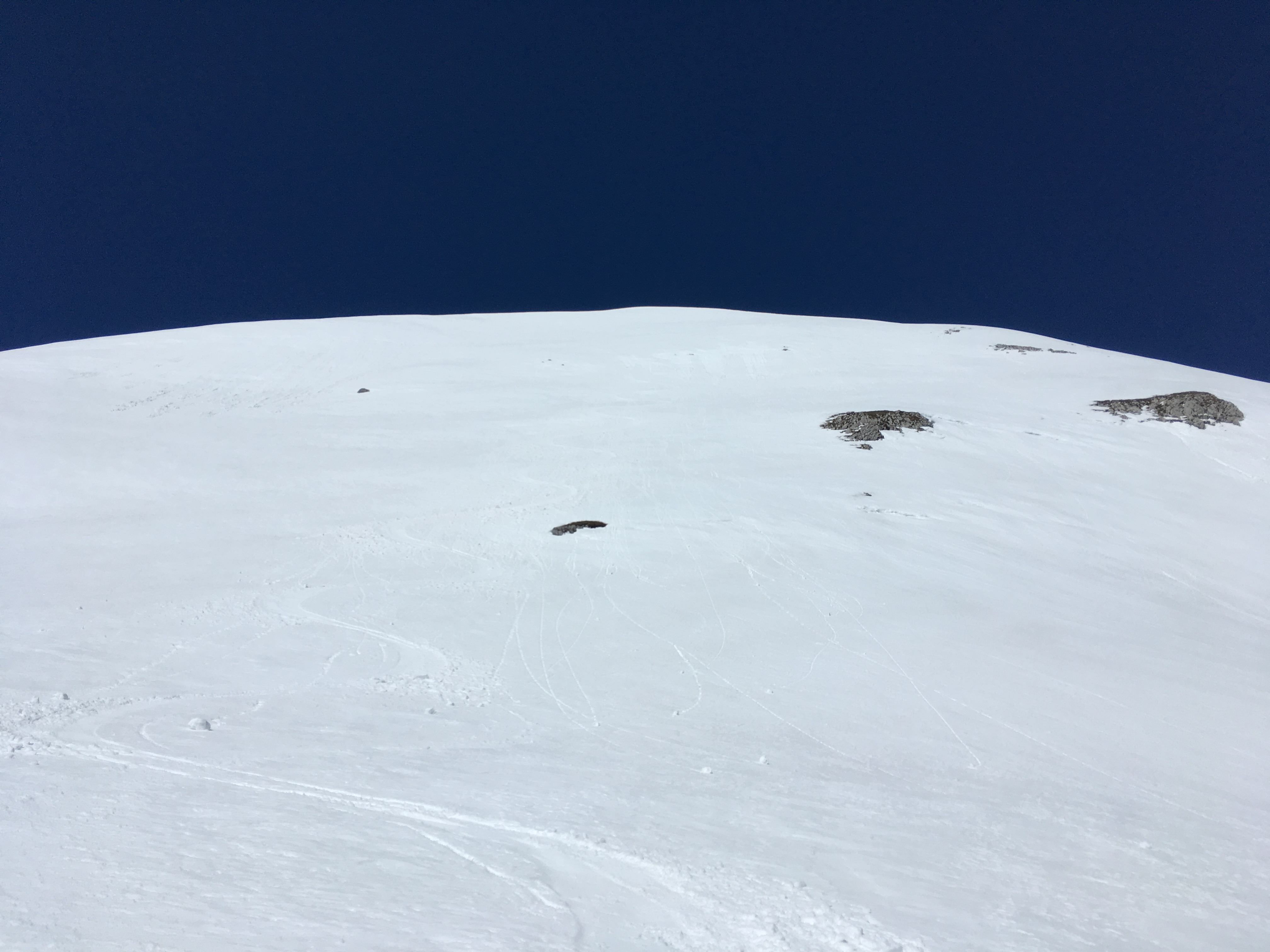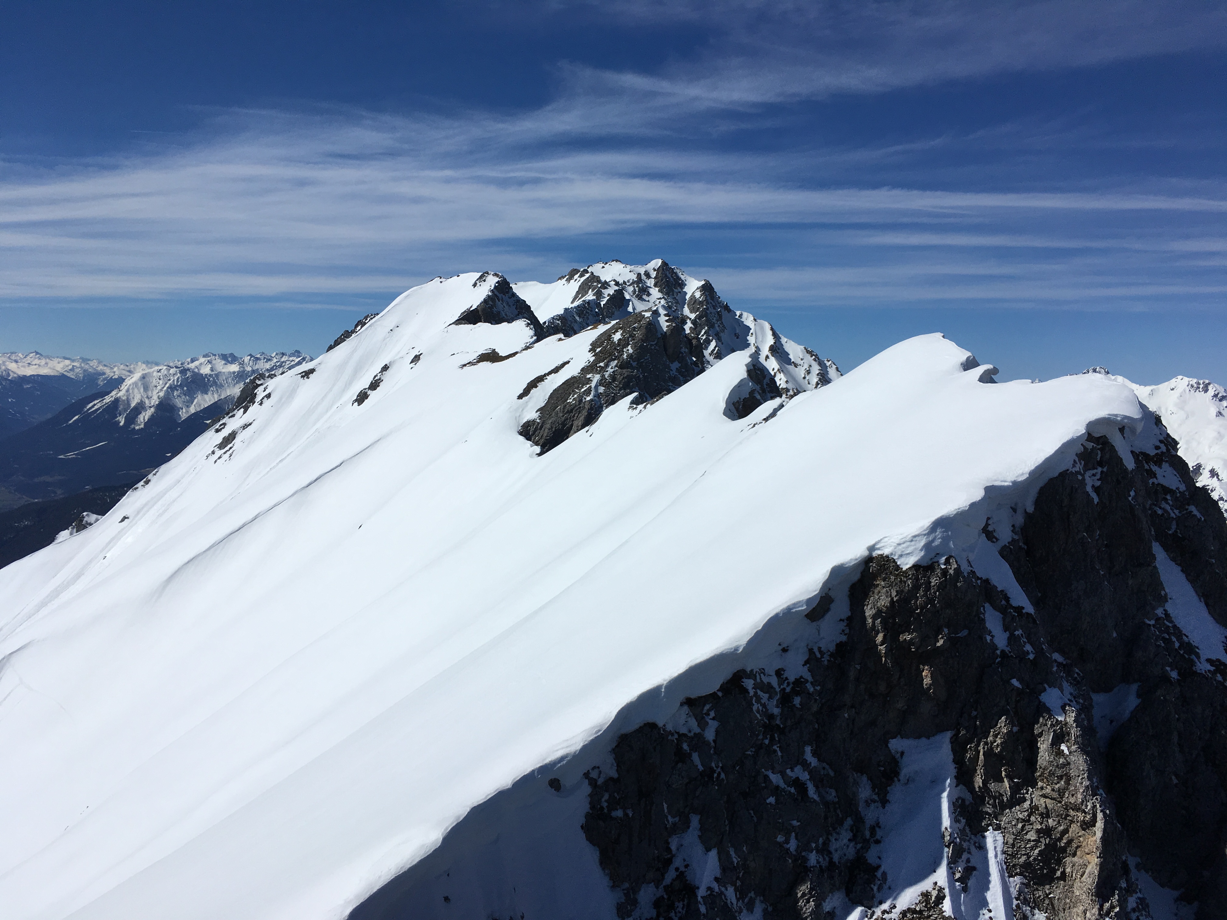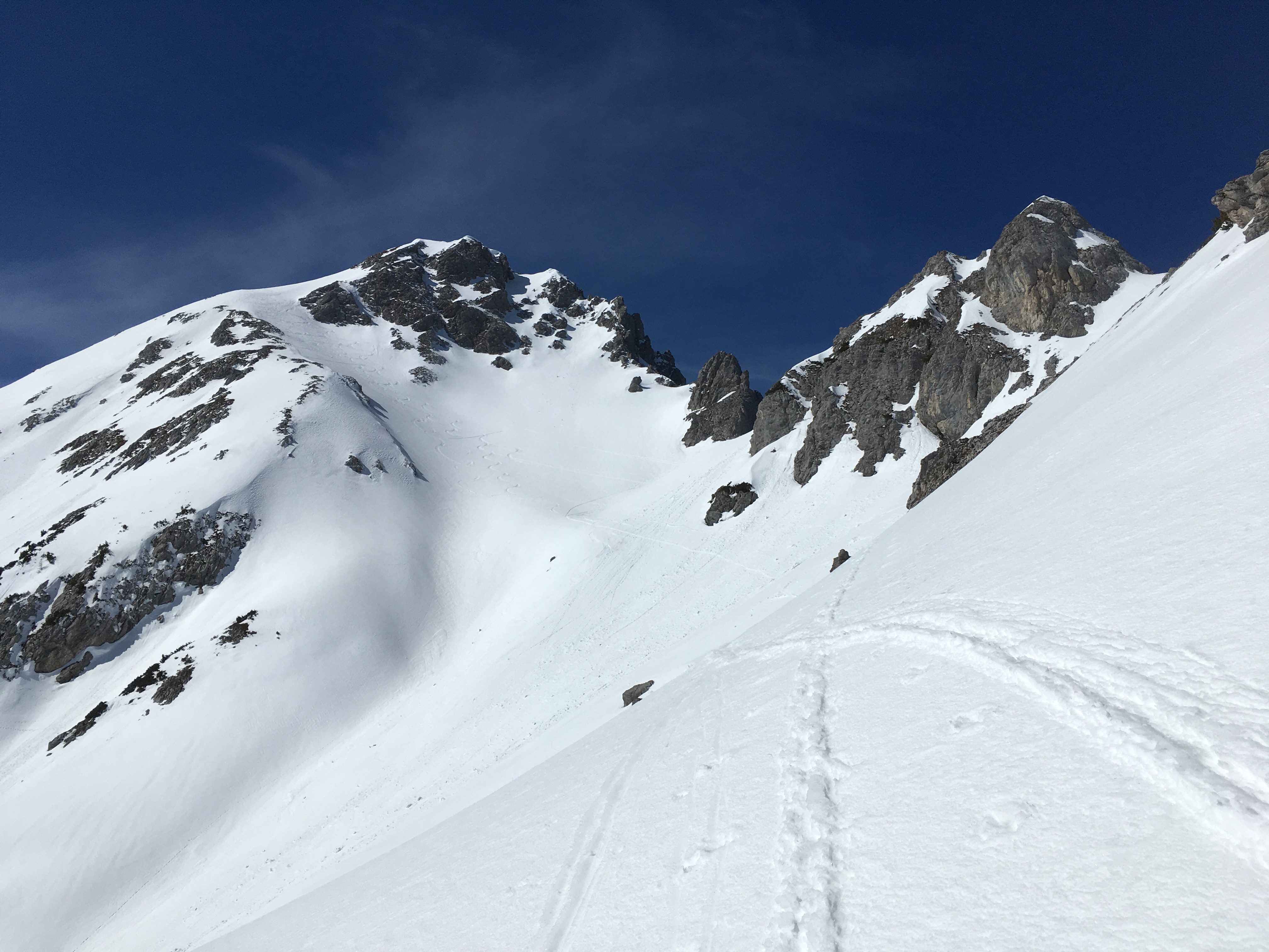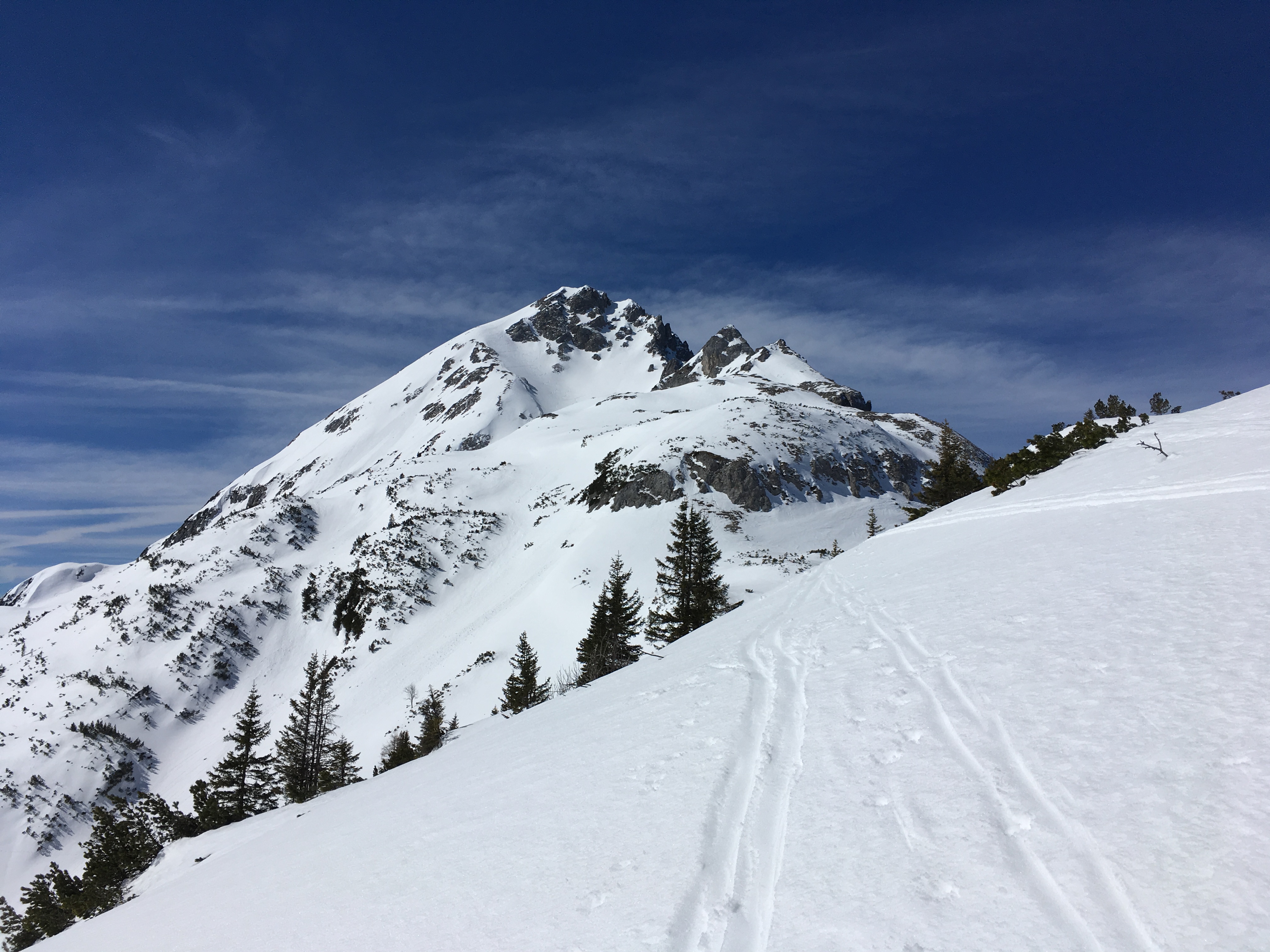 Gefahreneinschätzung: im Aufstieg bei hartem Schnee Vorsicht bei den Querungen oberhalb der Felsen, die direkte Südabfahrt sollte man ohnehin nur bei Firn angehen (sonst besser die Aufstiegsroute abfahren)