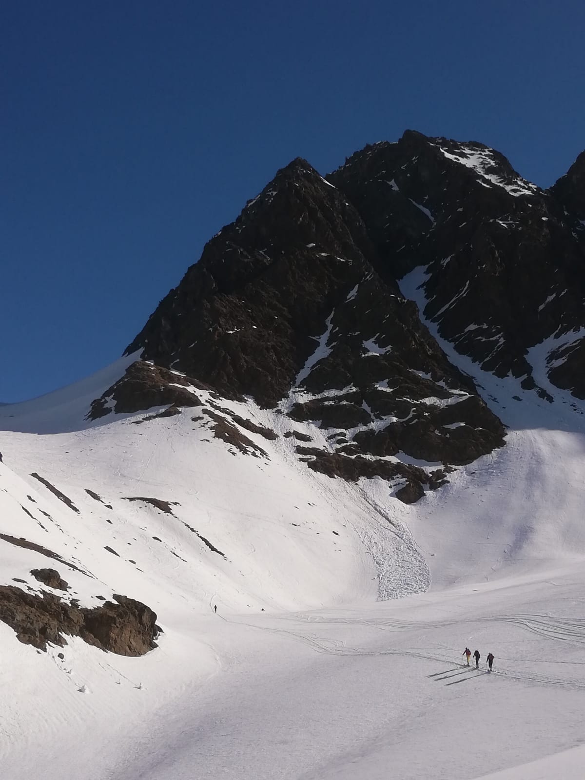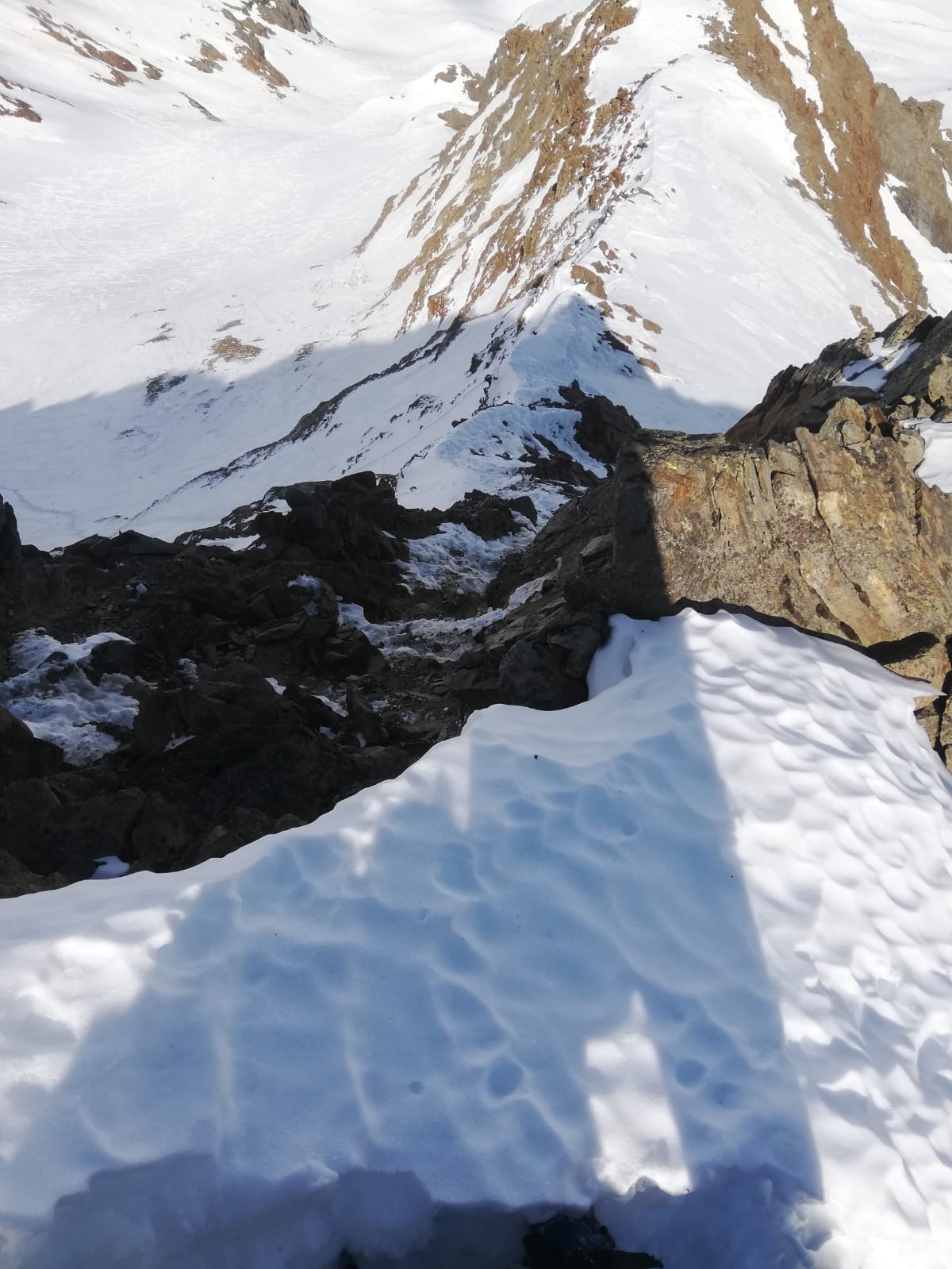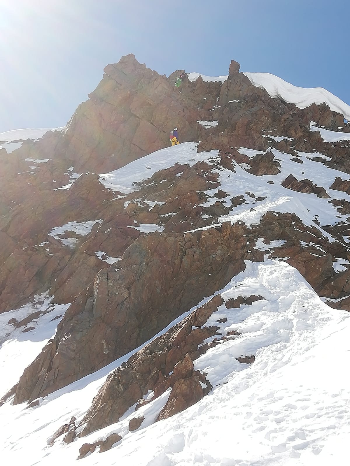 Zu Fuß durch die Nordflanke hoch, bis man auf ca. 3350m nach links zum Nordostgrat rausqueren kann. Die Flanke ist 40-45 Grad steil und momentan auf ein paar Metern felsdurchsetzt. Pickel und Steigeisen derzeit notwendig. Über den Grat mit Kletterei (I-II) in brüchigem Fels zum flachen Gipfel grat und nach rechts zum höchsten Punkt. In der Nordflanke war (zum Glück) eine Spur drin. Den gleichen Weg zurück und auch Abfahrt wie Aufstieg.