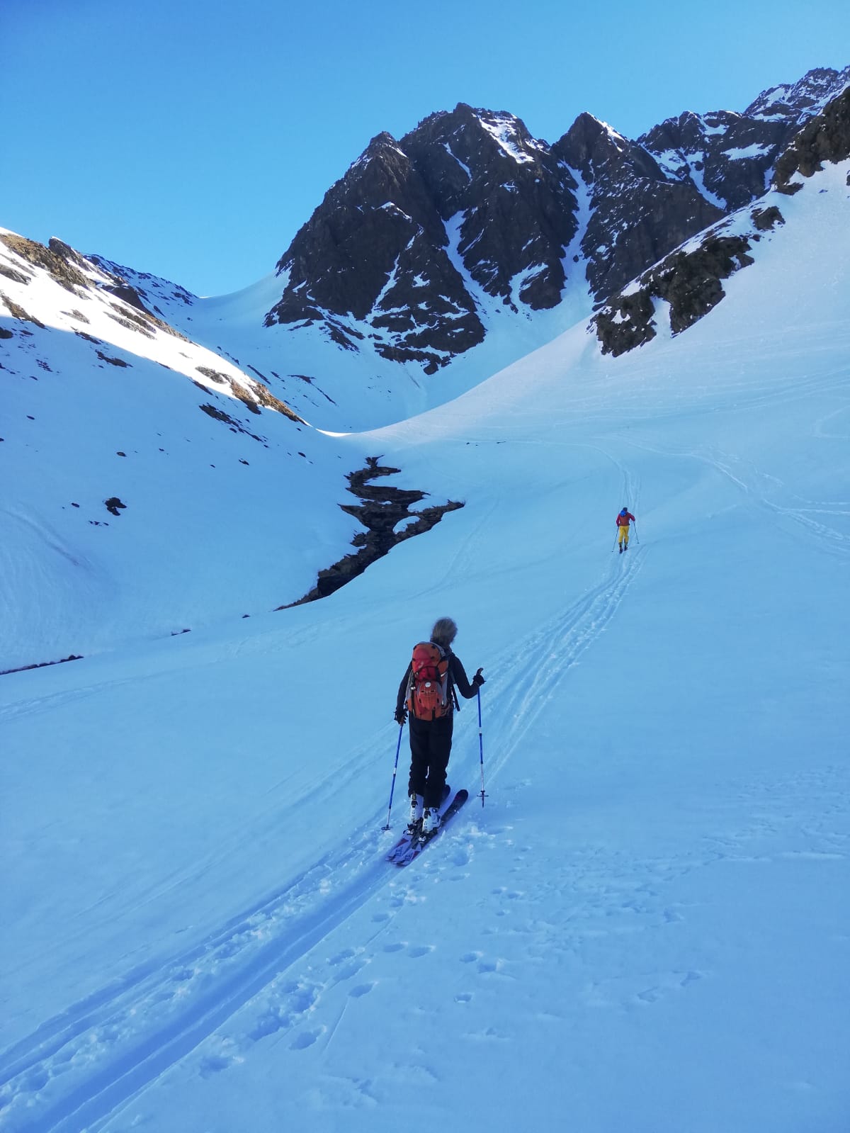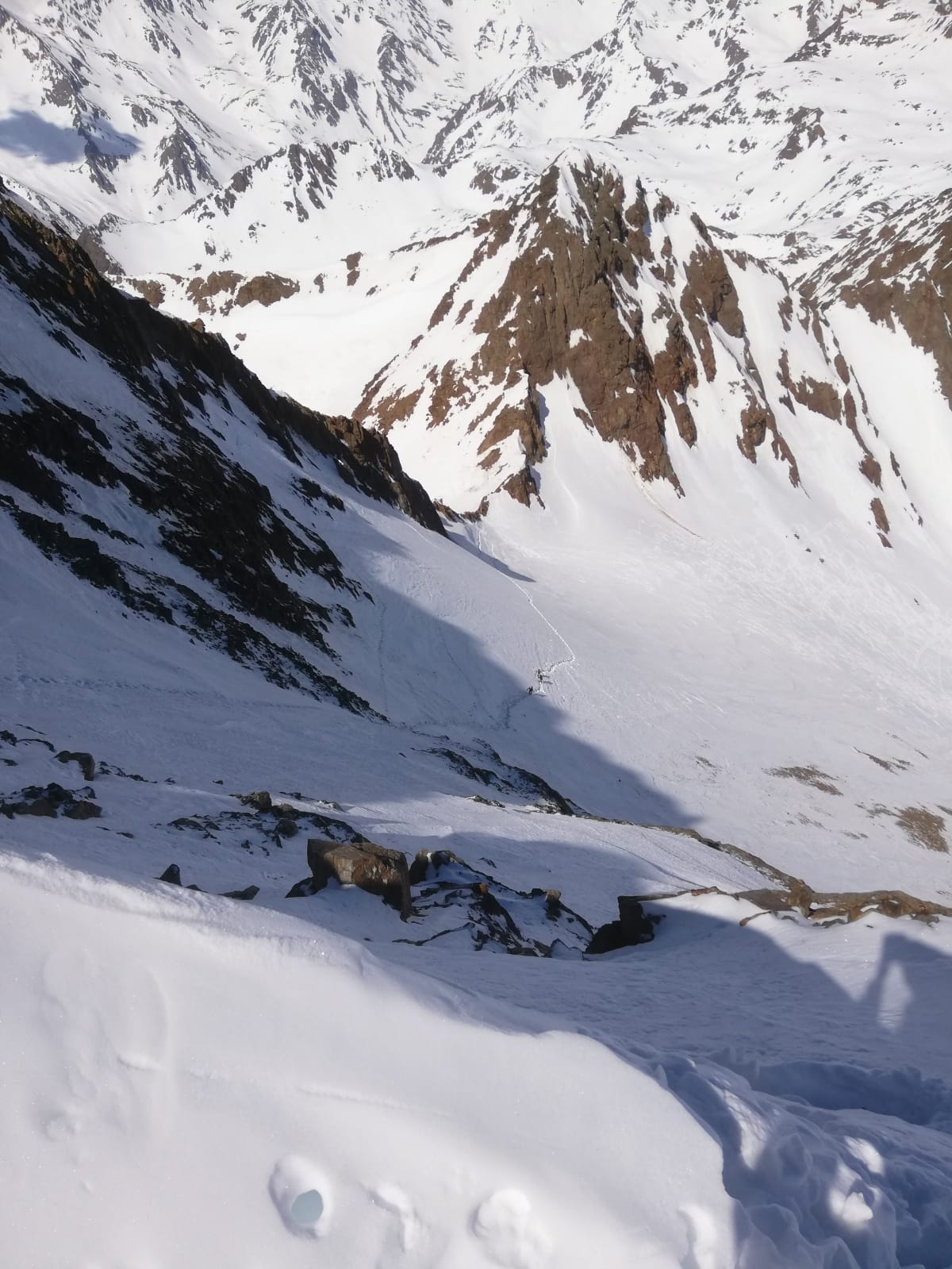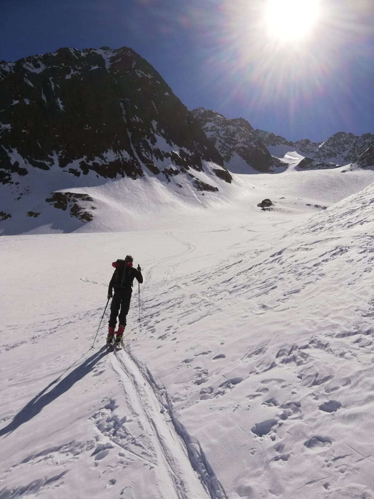 Zu Fuß durch die Nordflanke hoch, bis man auf ca. 3350m nach links zum Nordostgrat rausqueren kann. Die Flanke ist 40-45 Grad steil und momentan auf ein paar Metern felsdurchsetzt. Pickel und Steigeisen derzeit notwendig. Über den Grat mit Kletterei (I-II) in brüchigem Fels zum flachen Gipfel grat und nach rechts zum höchsten Punkt. In der Nordflanke war (zum Glück) eine Spur drin. Den gleichen Weg zurück und auch Abfahrt wie Aufstieg.