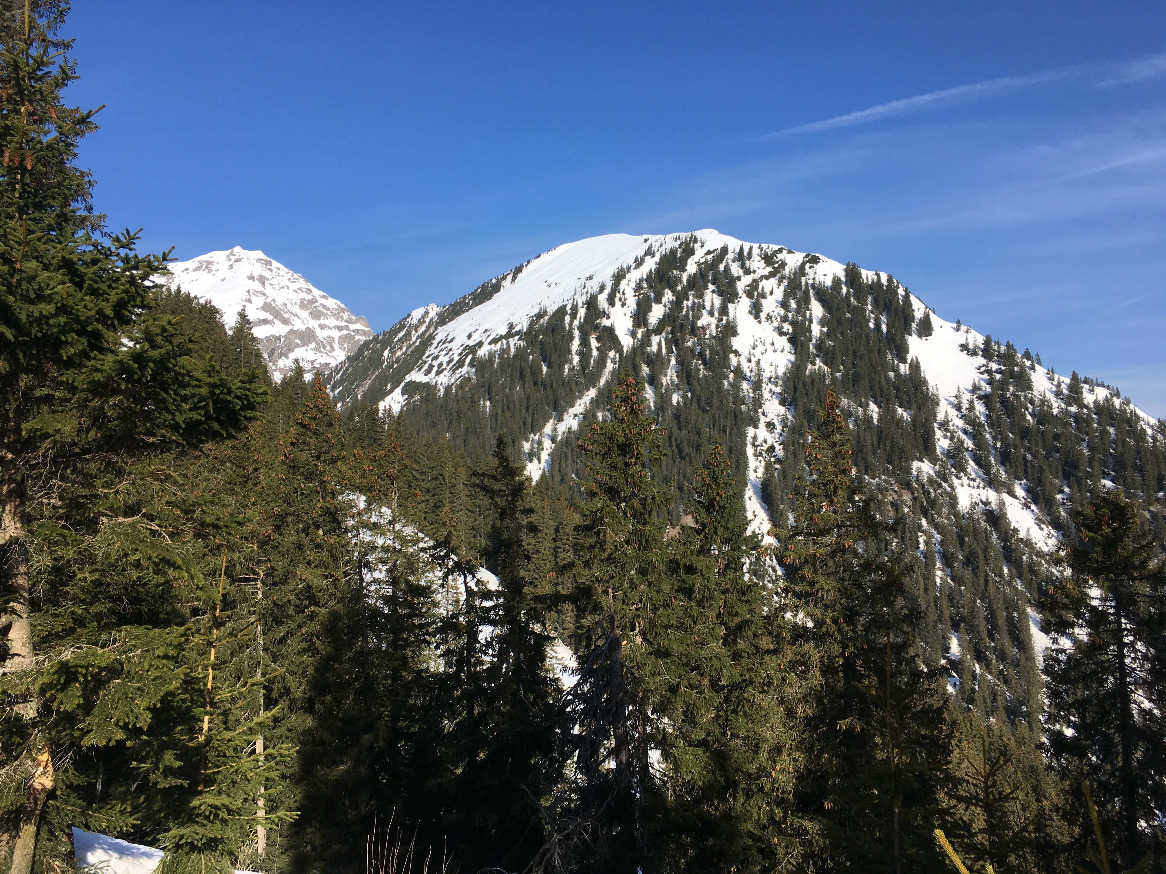 Tourenverhältnisse: um 11 Uhr bei der Abfahrt vom Gipfel über den S-O-Hang Firn, in der Latschenzone sumpfig, darunter wieder Firn (etwas tief), Piste dann super aufgefirnt
