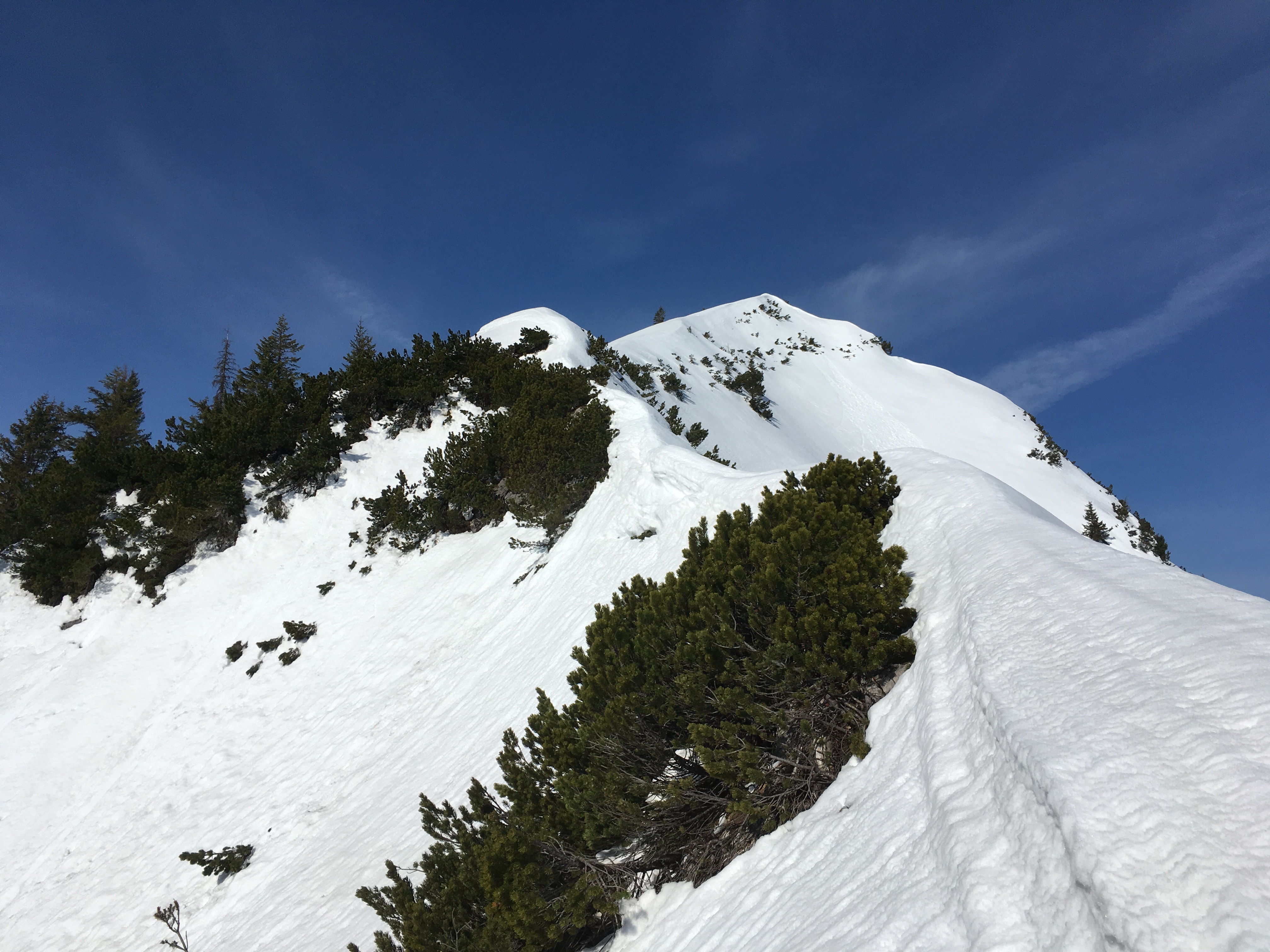 Prognose: Piste sowie der "Normalgipfel" gehen noch eine Weile, am Achseljoch hängt es davon ab, wie stark die Latschen ausapern - es müssen diese tragfähig zugeschneit sein