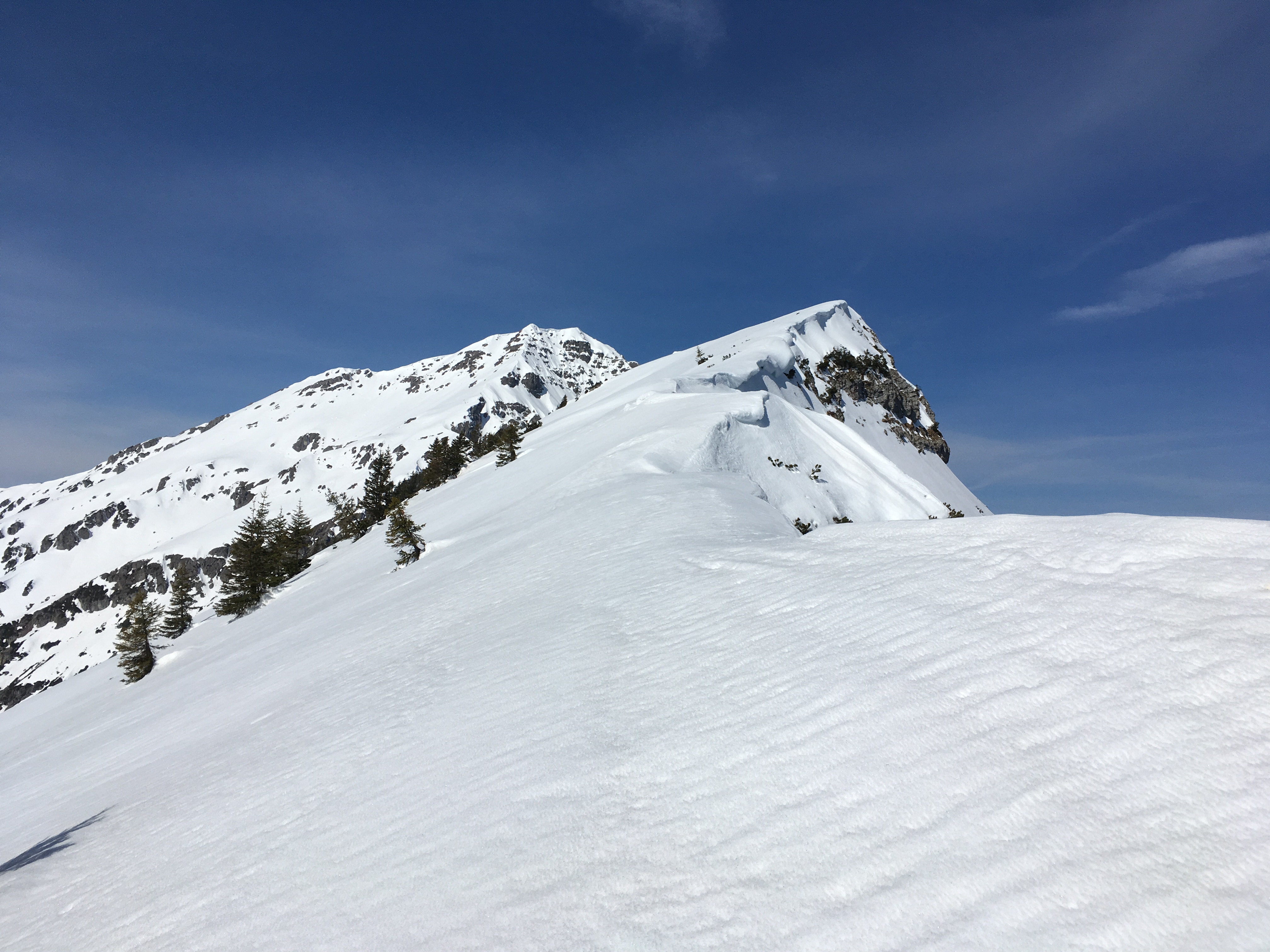 Am Gipfelgrat nach Überwindung der steilsten Passage (der Grat schaut auf dem Foto deutlich flacher aus als in Realität):