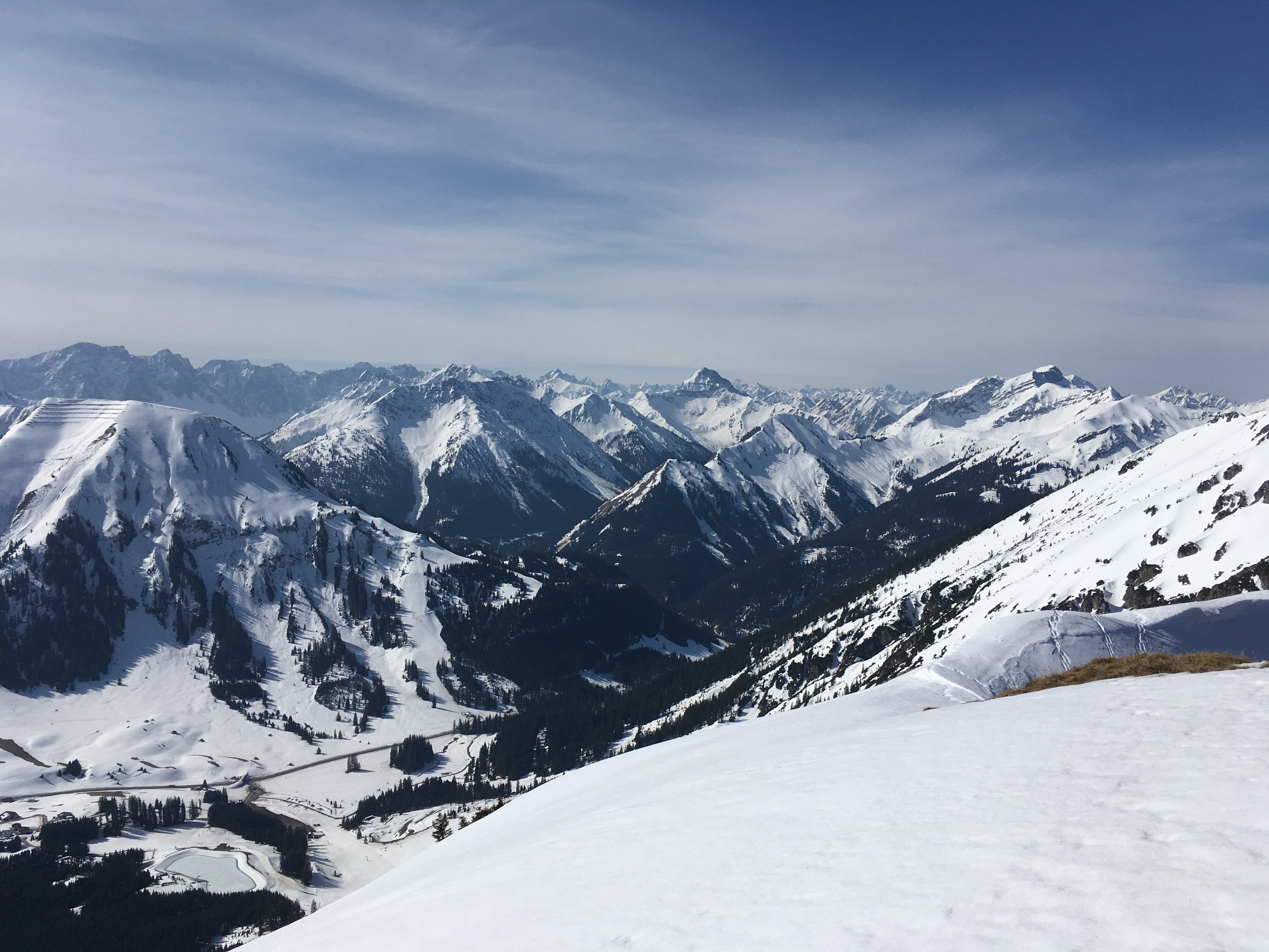 Blick vom Achseljoch auf die Ziele im hinteren Berwanger Tal - die Schneelage schaut gut aus: