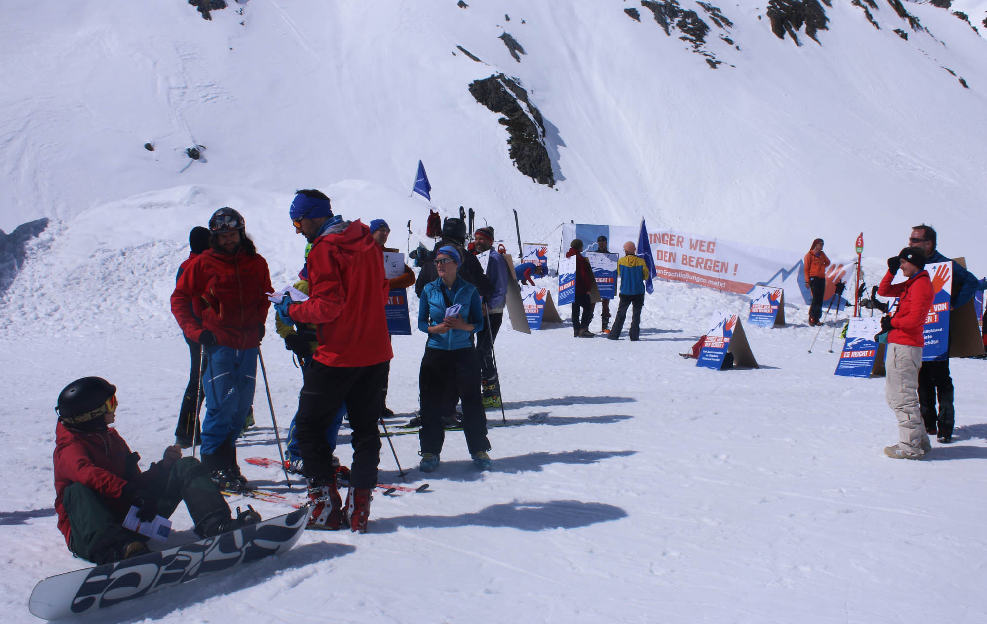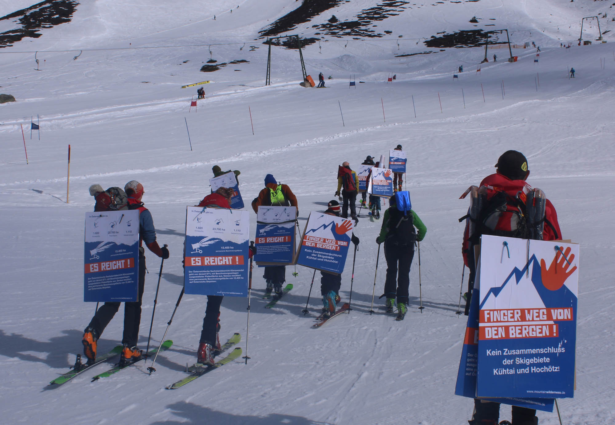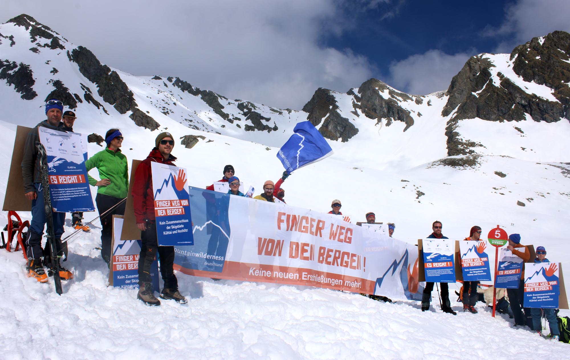 Böden unangetastet zu lassen. Noch bevor das großes Transparent mit dem Slogan „Finger weg von den Bergen“ ausrollt wurde, fragten bereits die ersten Skifahrer, wo man die Petition gegen die geplante Neuerschließung Kühtai mit Hochötz unterschreiben könne. Selbst ein örtlicher Hotelier sagte, dass er den Skigebietszusammenschluss nicht brauche, weil die Auslastung ohnehin so gut sei.