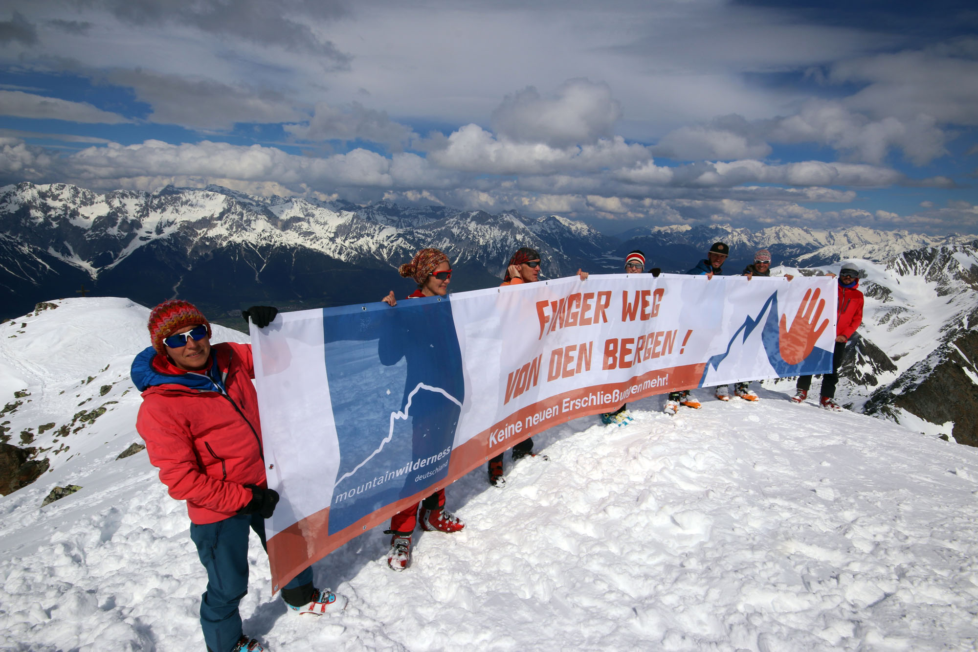 Am Sonntag demonstrierten die Landesverbände vom Mountain Wilderness Österrreich und Mountain Wilderness Deutschland an der Bergstation der Kaiserbahgegen den geplanten Skigebietszusammenschluss zwischen Kühtai und Hochötz