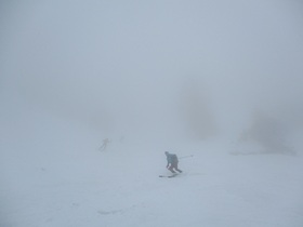Tourenverhältnisse: Für Mitte April noch recht gut / keine Leute - keine Sicht / paar cm Neuschnee auf tragendem, hartem Altschnee / nur 3 Meter aper unter der Rosengassenalm sonst noch vui Schnee / Ein großes Lawinenfeld ist beim Aufstieg zu meistern !