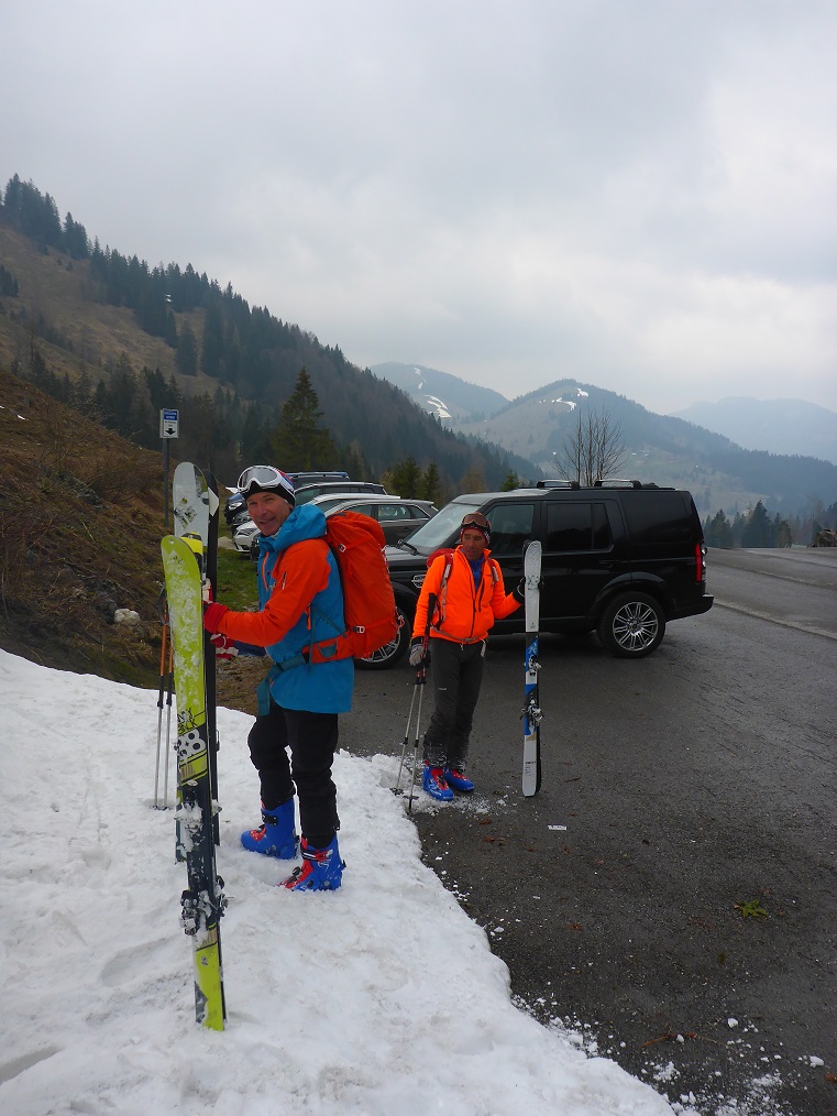 Tourenverhältnisse: Für Mitte April noch recht gut / keine Leute - keine Sicht / paar cm Neuschnee auf tragendem, hartem Altschnee / nur 3 Meter aper unter der Rosengassenalm sonst noch vui Schnee / Ein großes Lawinenfeld ist beim Aufstieg zu meistern !
