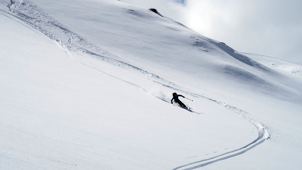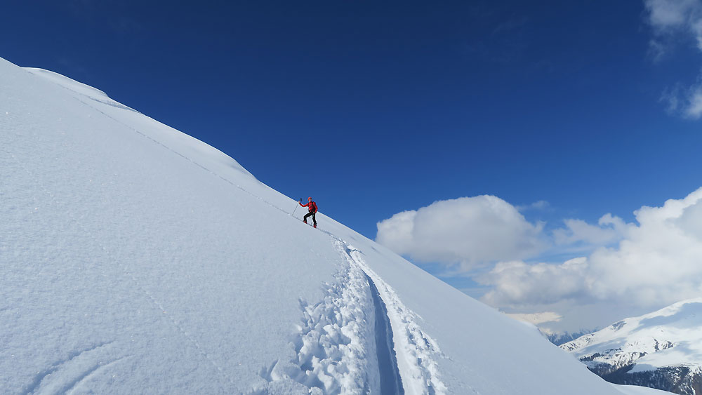 Tourenverhältnisse: Am Morgen über die hart gefrorene Piste (Harscheisen in der Steilstufe nicht schlecht...) zur Bergstation Maseben und weiter über meist pulvrige Hänge zum Gipfel. Hänge nach Nordwesten hatten einen leichten Deckel; so musste man sich einfach die Nordost geneigten Passagen aussuchen, die waren super pulvrig! Noch langen nicht alle Varianten verspurt. Sehr schöne Tour!