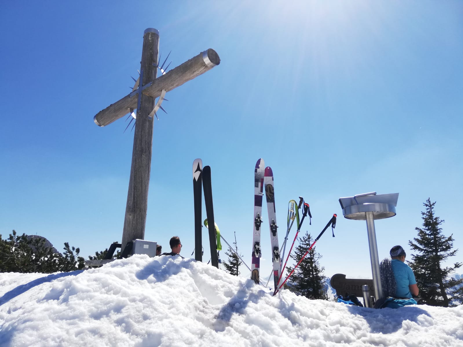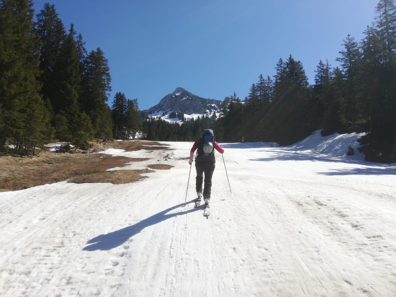 Tourenverhältnisse: gut; Piste morgens hart, gegen 11.00 gut aufgefirnt, am Nachmittag tief sulzig. Schnee ab Parkplatz.