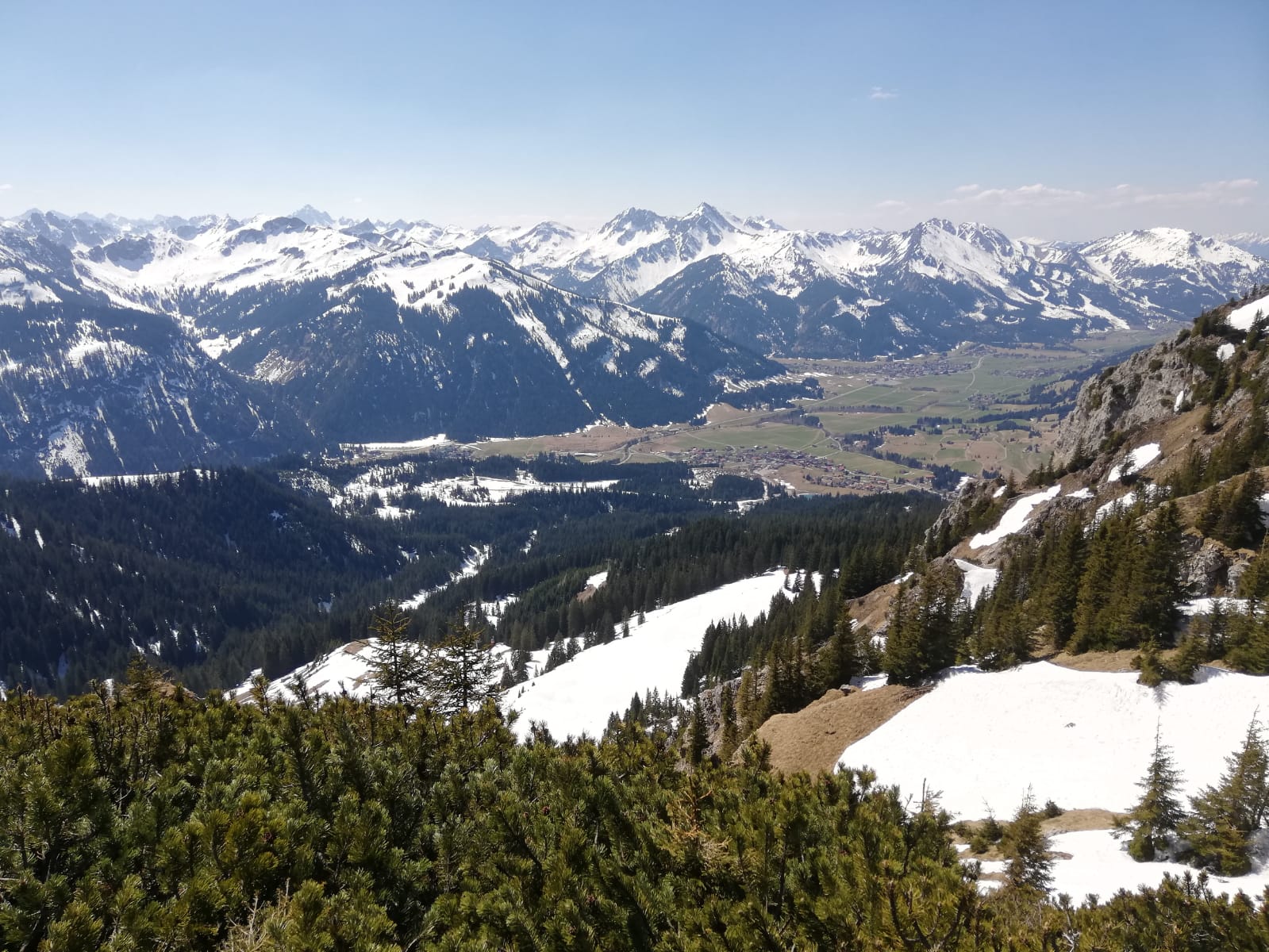 Sonstiges: Das Tal ist grün, aber nordseitig reicht der Schnee noch bis runter (vgl. Foto). Zum Beispiel in Schattwald kein Skibetrieb, man kommt aber auf der Piste ins Tal. Genauso schaute es gegenüber an der Krinnenspitze aus.