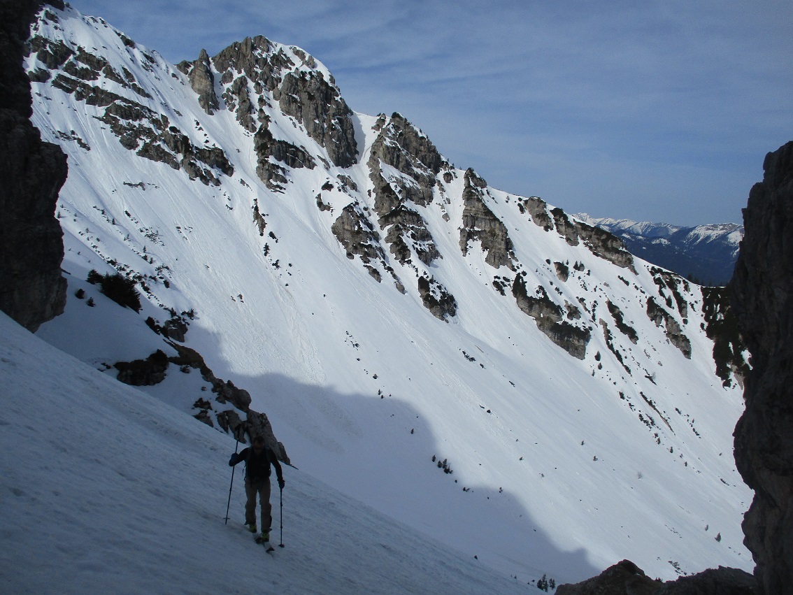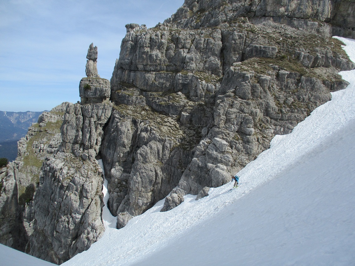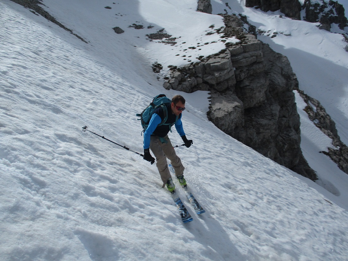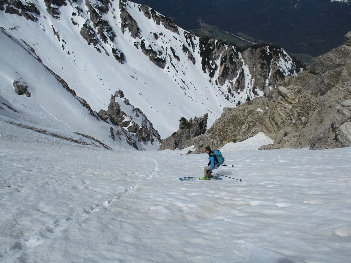 Tourenverhältnisse: Sehr gut / nach gut 3 Km Radlauffahrt ca. 10 Minuten zu Fuß zum Schneebeginn / Westl. Gipfelrinne verlangt nach Harscheisen / Abfahrt um 11.30 war ideal