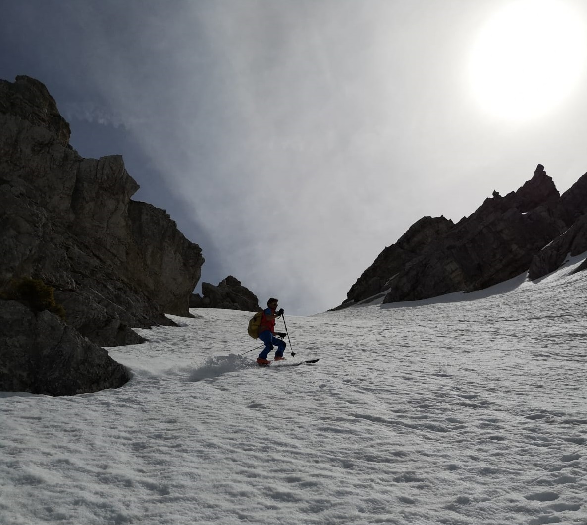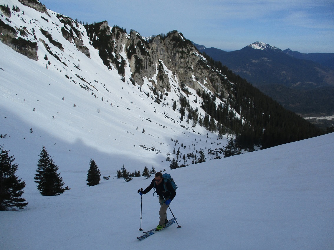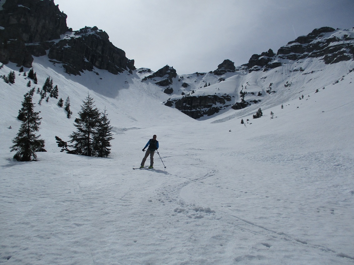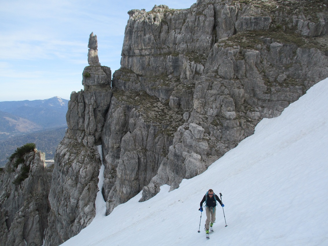 Tourenverhältnisse: Sehr gut / nach gut 3 Km Radlauffahrt ca. 10 Minuten zu Fuß zum Schneebeginn / Westl. Gipfelrinne verlangt nach Harscheisen / Abfahrt um 11.30 war ideal