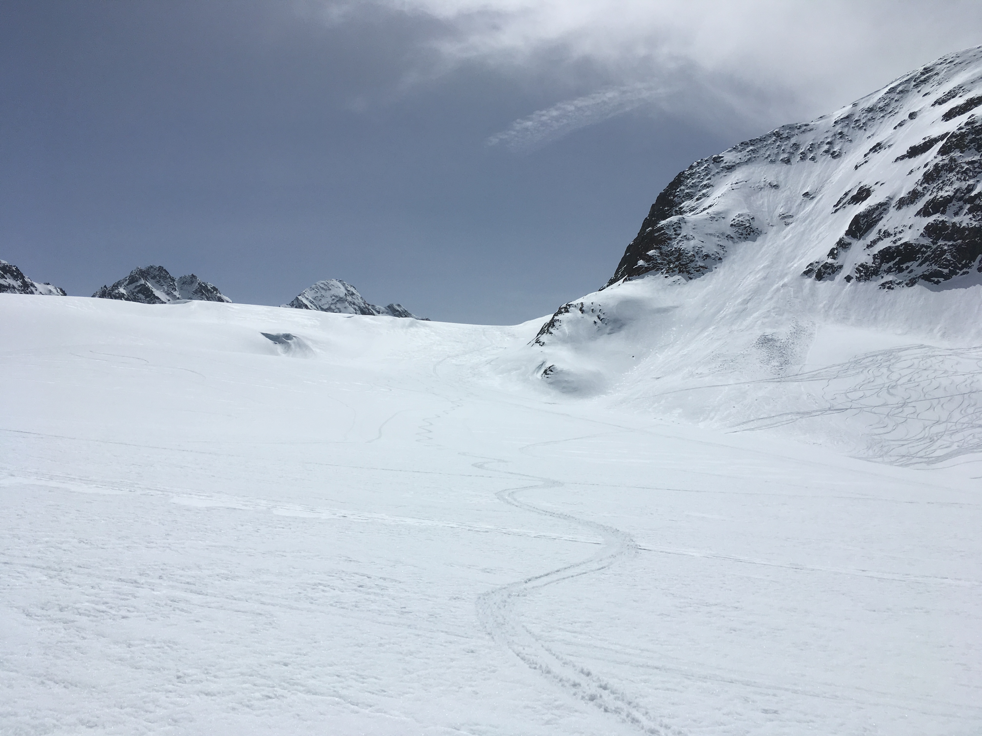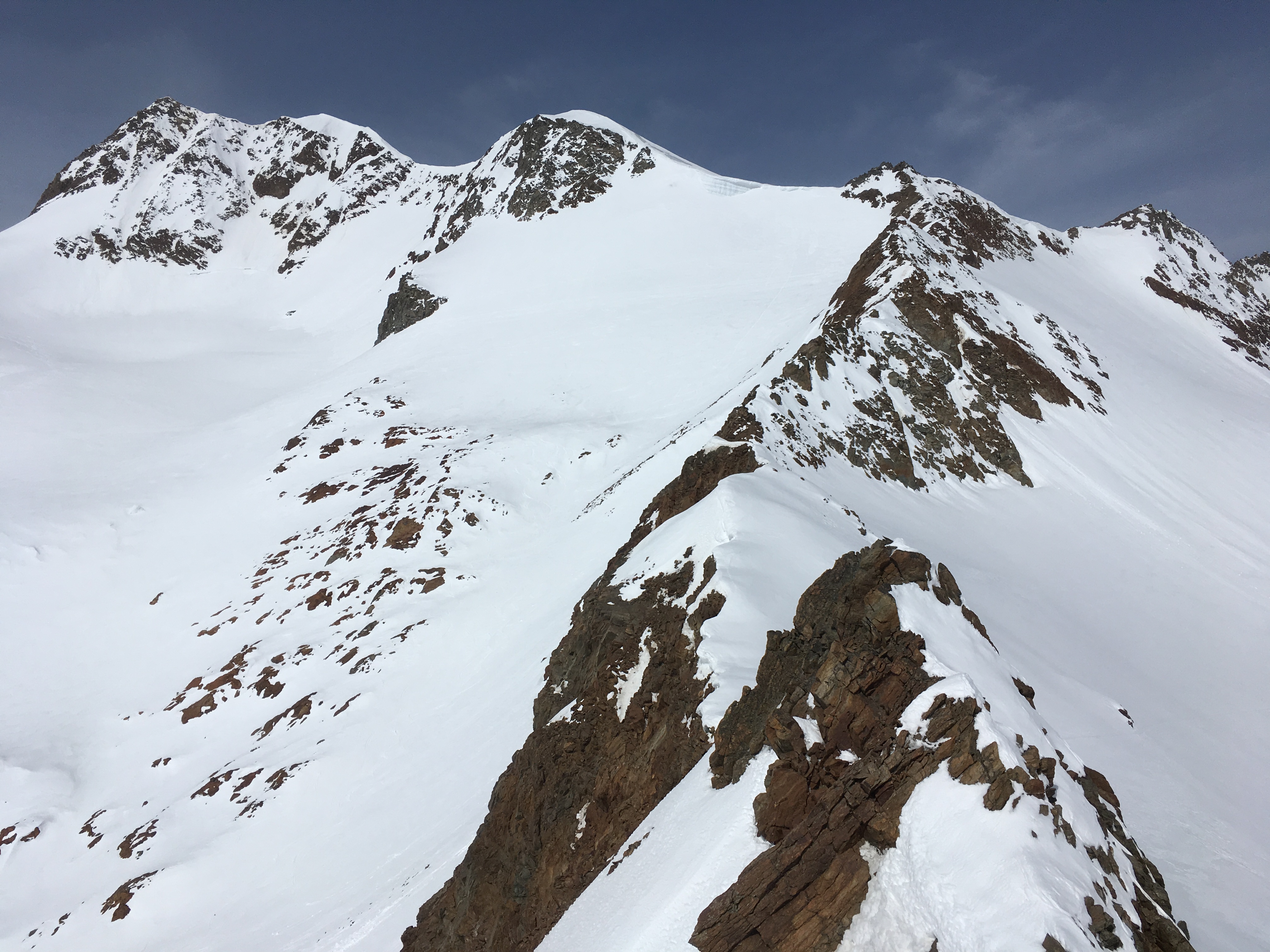 Tourenverhältnisse: in sehr schattigen Lagen noch Pulver, unterhalb ca. 2.700 m Firn, dazwischen (Mittelbergferner) bruchharschig, ging aber mit etwas Geschwindigkeit recht gut zu fahren