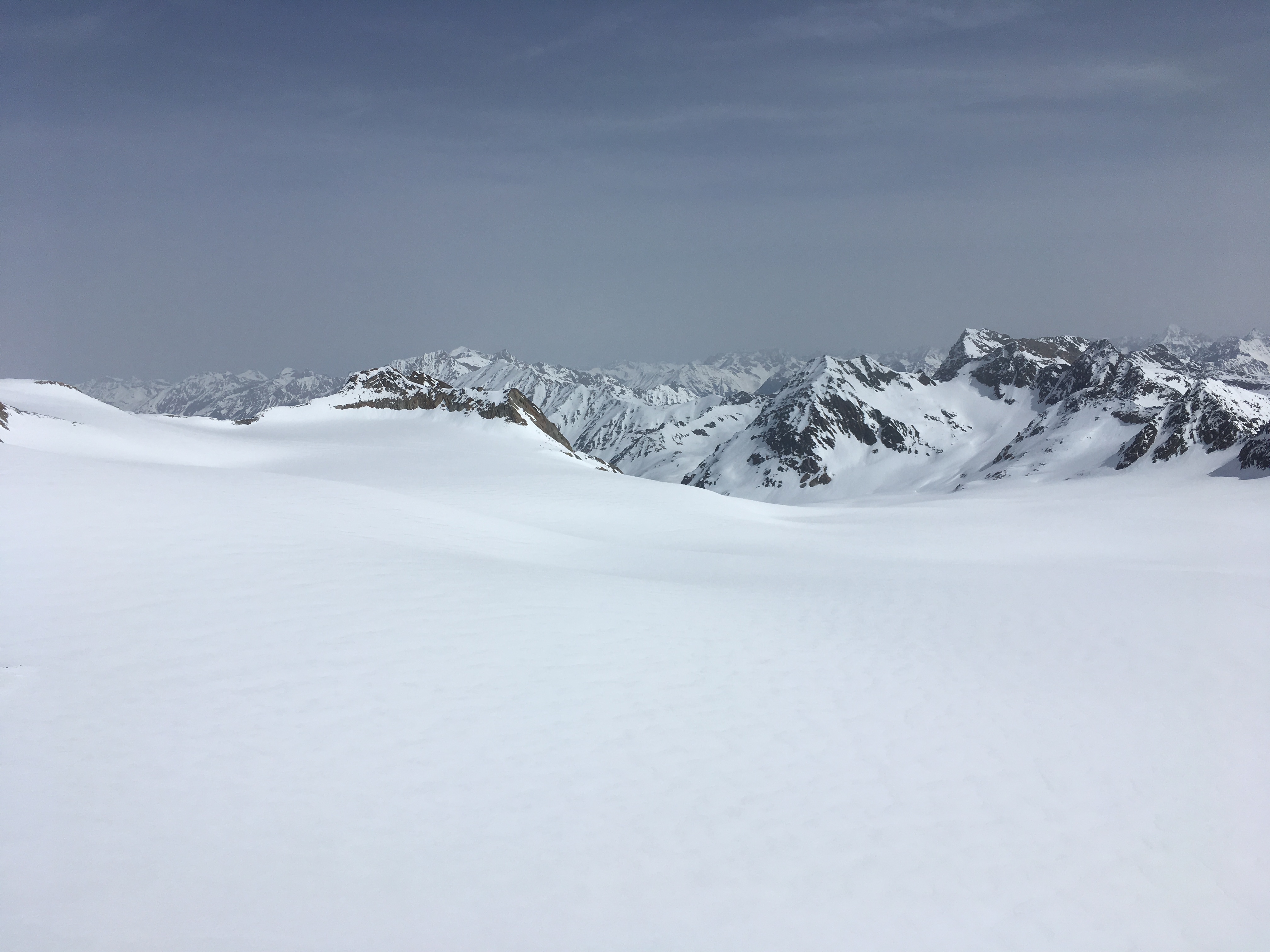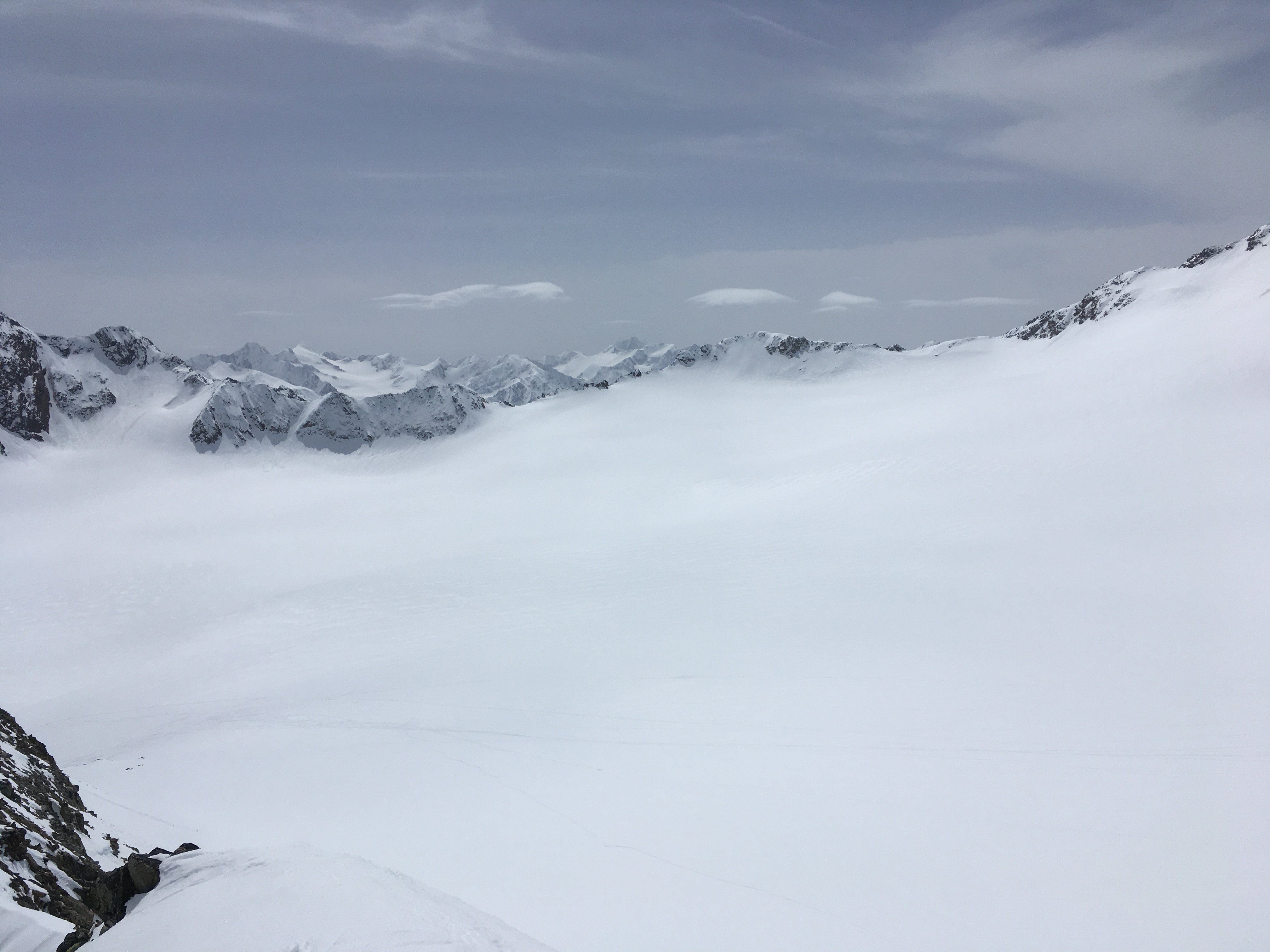 Sonstiges: Heute gab es eine Skidurchquerung von Vent nach Sölden. Auffahrt mit den Liften (17 Euro) und nach ein paar Metern Abfahrt Richtung Rofenkarbach Aufstieg über den Rofenferner ins Rofenkarjoch - zuletzt den steilen Hang mit Steigeisen, ginge aber auch mit Skiern mit Harscheisen (allerdings Felsen unterhalb). Der frühere Anstieg in Falllinie zum Rofenkarjoch vom Ferner ist wegen des Gletscherrückgangs schwierig geworden (winters wie sommers), es empfiehlt sich, etwas nach Osten auszuweichen oder gleich über den Taufkarkogel zu gehen.