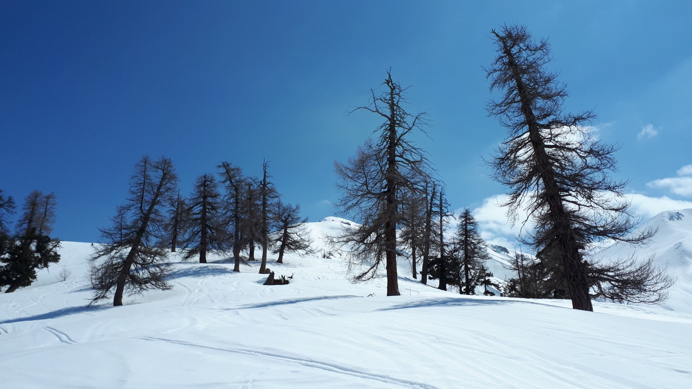 wieder eine klare Nacht und gute Verhältnisse. Start in La Punt in der Kehre kurz hinter dem Bahnhof. Hier liegt noch Schnee. Aufstieg im Bachtal Richtung Albulapass bis zur Alpe Proliebas. Dann über weite Hänge zum Gipfel. Die Sonne ist hinter einem dünnen Wolkenschleier, aber die Osthänge beginnen trotzdem aufzufirnen. Am Gipfel bläst ein kalter Föhnwind. Über Palü und Bernina steht die Föhnmauer. Abfahrt über eine tolle Ostrinne und dann durch lichten Lärchenwald mit super Firn. Der Schnee bleibt bis ins Tal gut fahrbar.
