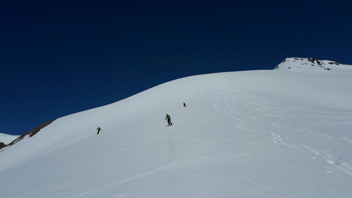 leichter Niederschlag über Nacht und Bewölkung. Daher zum Piz Arpiglia aufgebrochen. Schnee im unteren Teil weich. Ab dem flachen Rücken windgepresster Pulver und Bruchharsch. Im Laufe des Aufstiegs kommt die Sonne raus. Einige gehen daher noch den Piz Uter und fahren über die NW Flanke ab. Wir fahren Richtung Piz Murtiröl ab. Leider ist nur der oberste Nordhang noch pulvrig, dann folgt Bruchharsch. Zurück auf der Hauptroute ist der Schnee zwar weich und zerpflügt, aber noch recht gut fahrbar. Nur die letzte Wiese ist schon Sumpf.