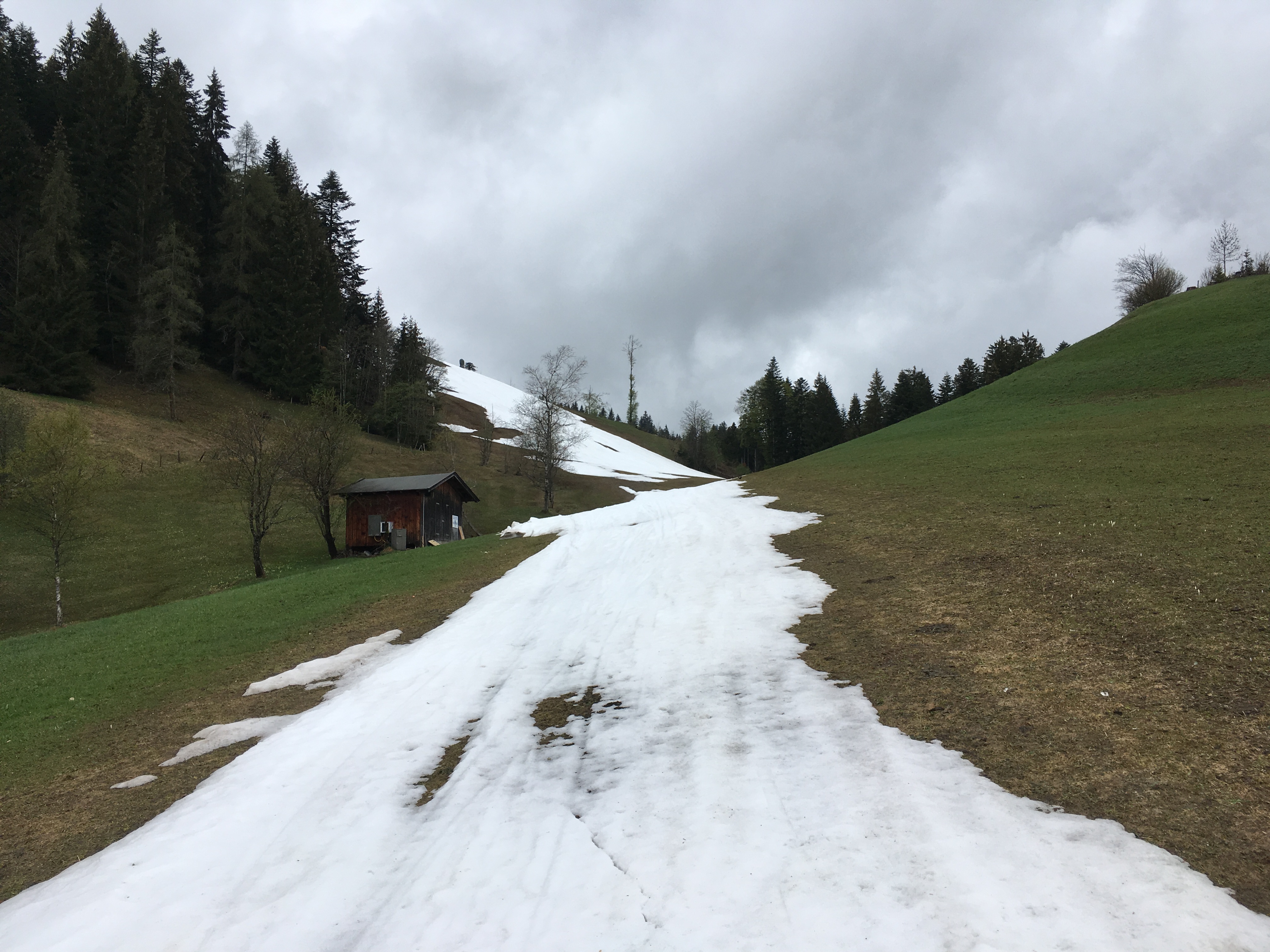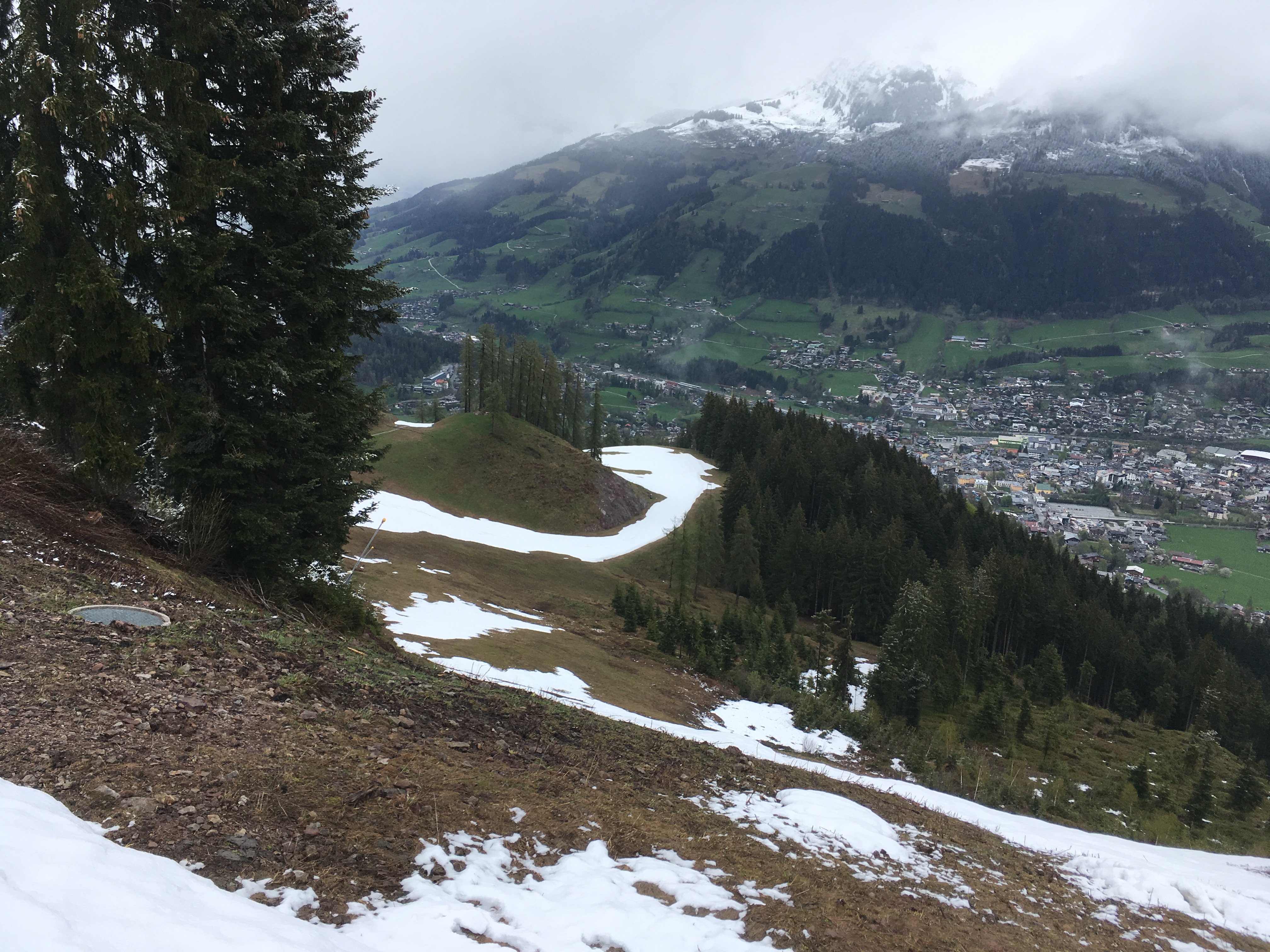 Sonstiges: Die Skier konnten an der Ganslern-Alm angeschnallt werden, d.h. ca. 15 min Ski tragen. Im Bereich Oberhausberg kommen noch 2-3 ganz kurze schneefreie Stellen (geht aber mit Skiern). Ansonsten durchgehend über die sog. "Familienstreif" hoch, ab der Talstation der Waldebahn ist auch noch (bis zum 1.5.) Skibetrieb. Zunächst zur Ehrenbachhöhe, wo dann gegen Mittag Schneefall einsetzte, dann nach Abfahrt zur Talstation der Waldebahn hoch zum Hahnenkamm und über die Streif-Rennstrecke herunter. Angesichts des Neuschnees und des weichen Altschnees war das heute eine vergnügliche Abfahrt, wo beim Skirennen die Rennläufer über eine völlig vereiste Piste herunterkratzen. Auf wirklich allerletzten Schneeresten ging es mit mehreren Unterbrechungen sogar noch bis ca. 100 m Wegstrecke vor die Hahnenkamm-Talstation. Hurra die Gams!