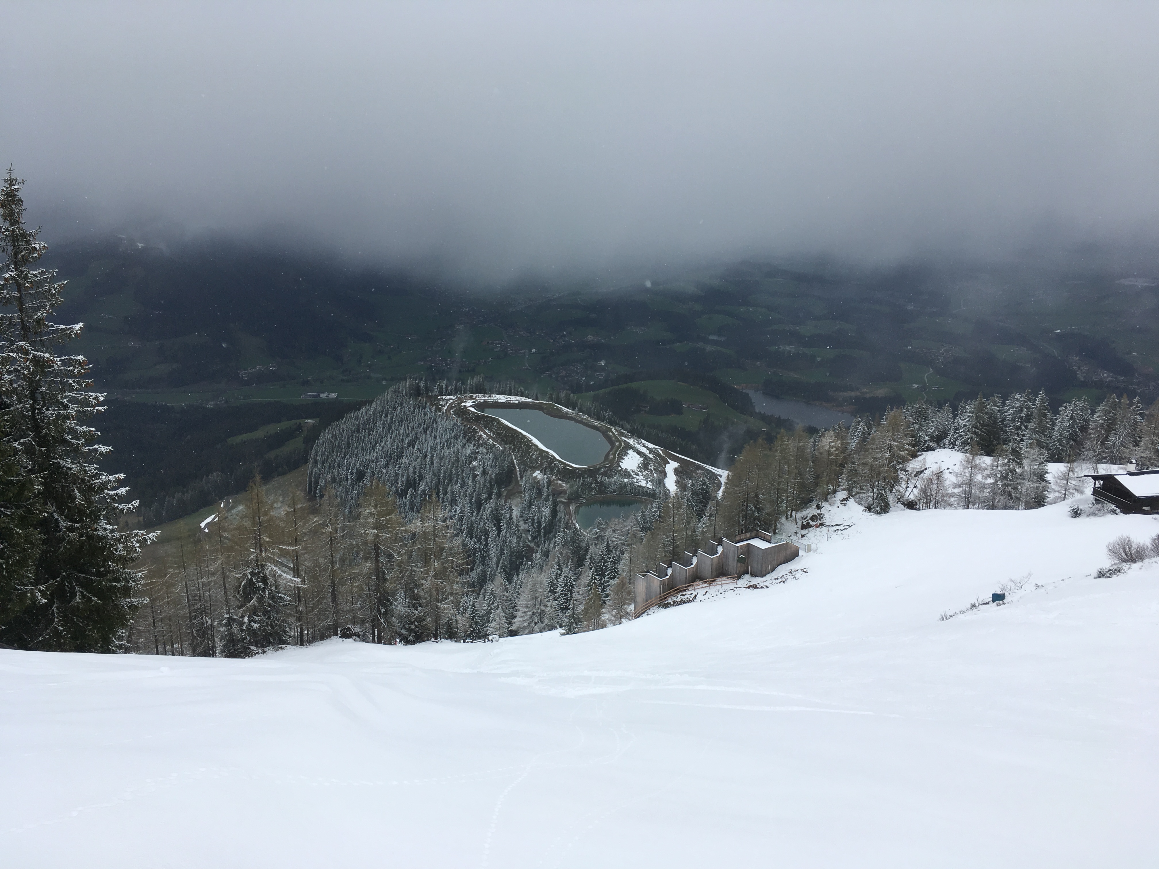 Bei den Seidlalm-Sprung-Speicherseen gibt es einen ersten Blick zum oberen Teil der Streif und dem Bereich Waldebahn: