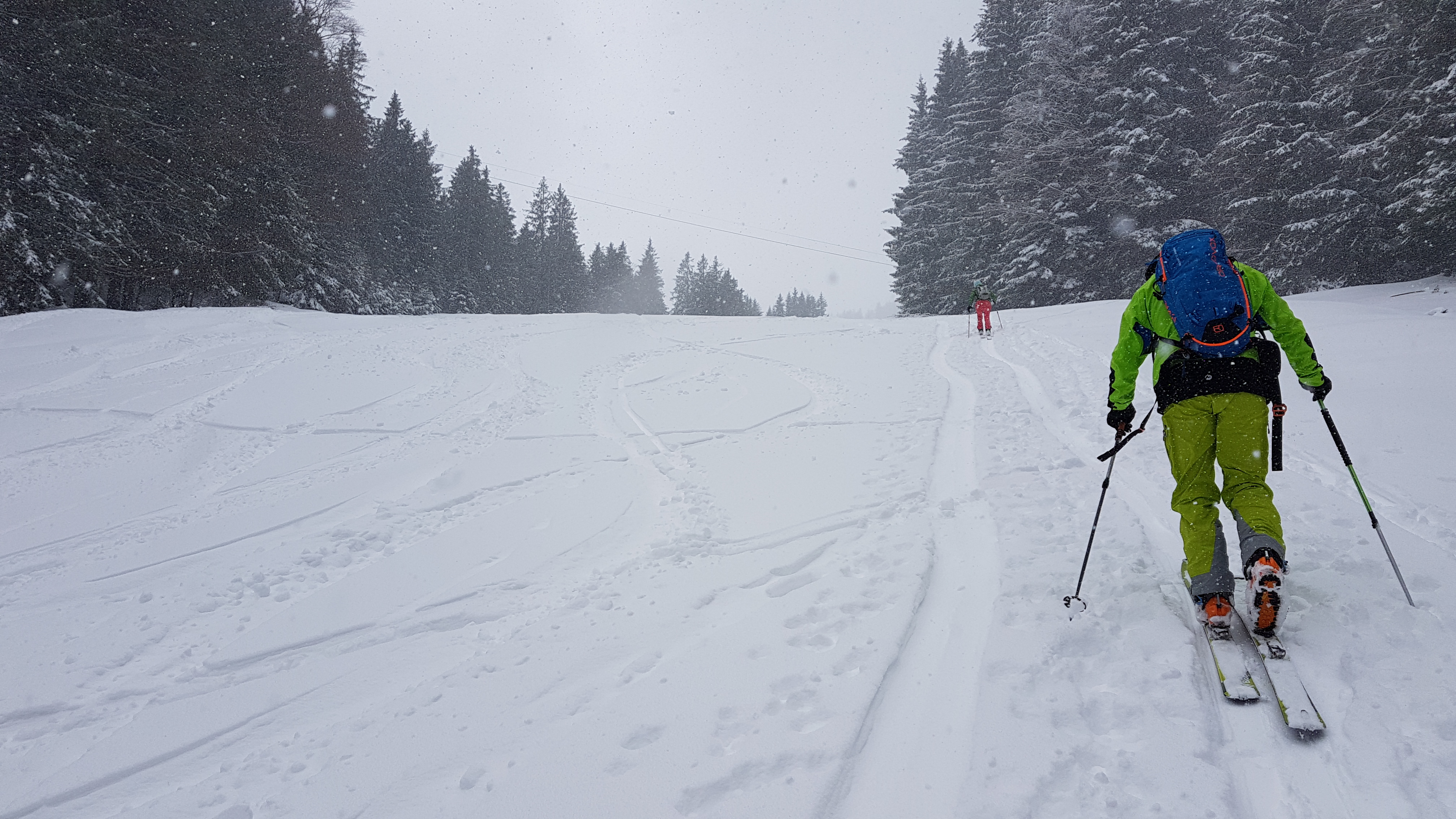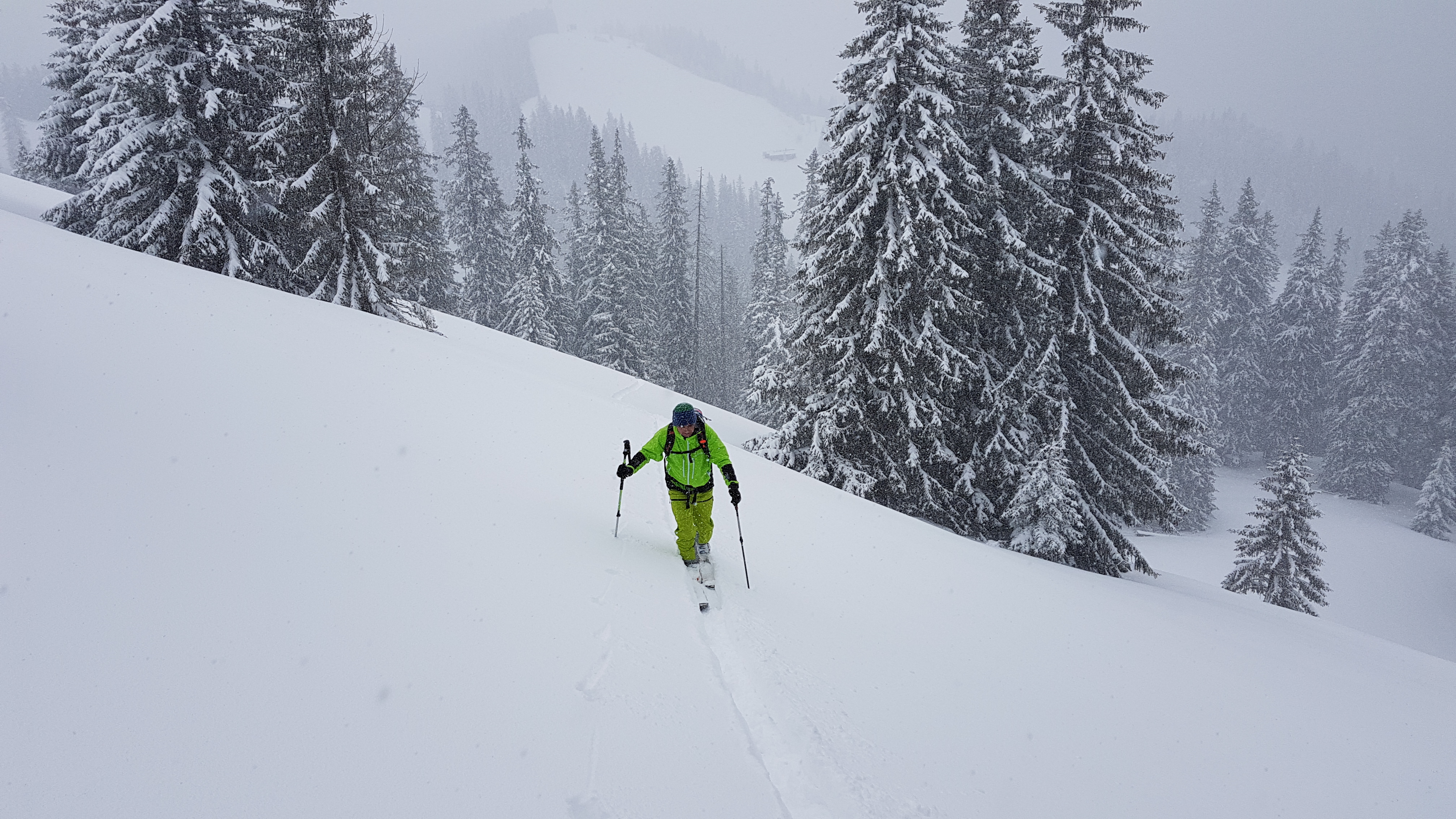 Start am Kurvenlift. Nur am untersten Hang war wohl vor dem Schneefall keine Unterlage mehr, so dass man sich hier mit den 20 cm Neuschnee begnügen musste. Oben sind wir auf einer noch unverspurten Variante über Waldschneisen aufgestiegen und abgefahren. Hier 30 cm, teilweise schon fast 40 cm sehr pulvriger Neuschnee.