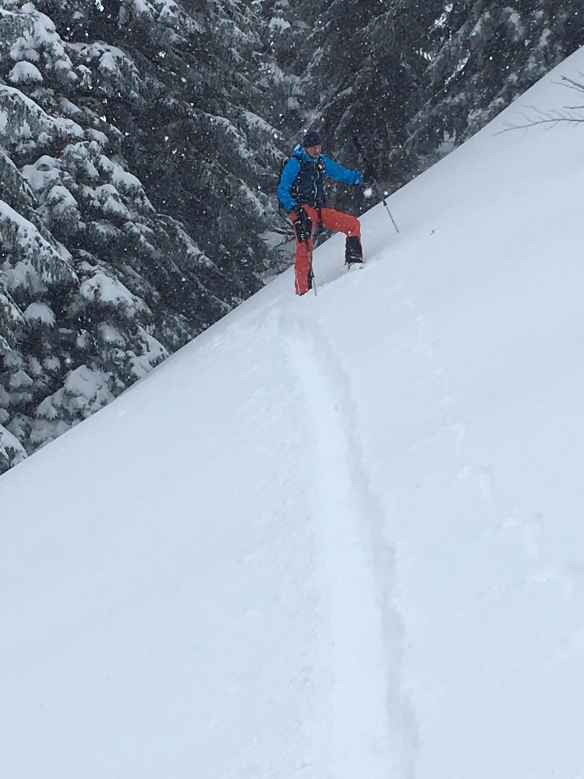 Interessant: wir haben noch im Pistenbereich einen Böschungstest gemacht und hier war der Neuschnee sehr leicht auslösbar. Weiter oben dann in den Waldschneisen lockerer, ungebundener Pulver ohne Windeinfluss.