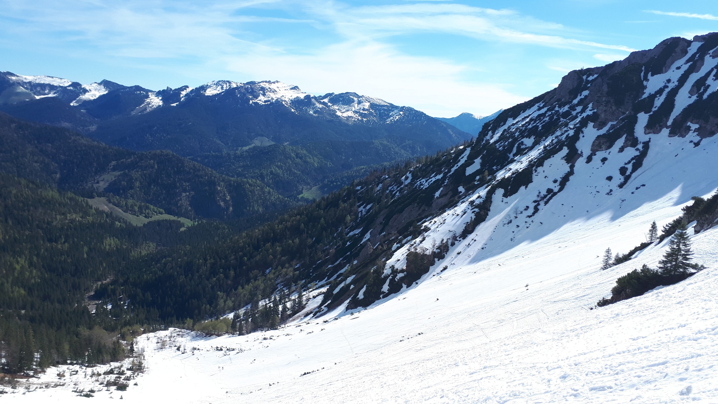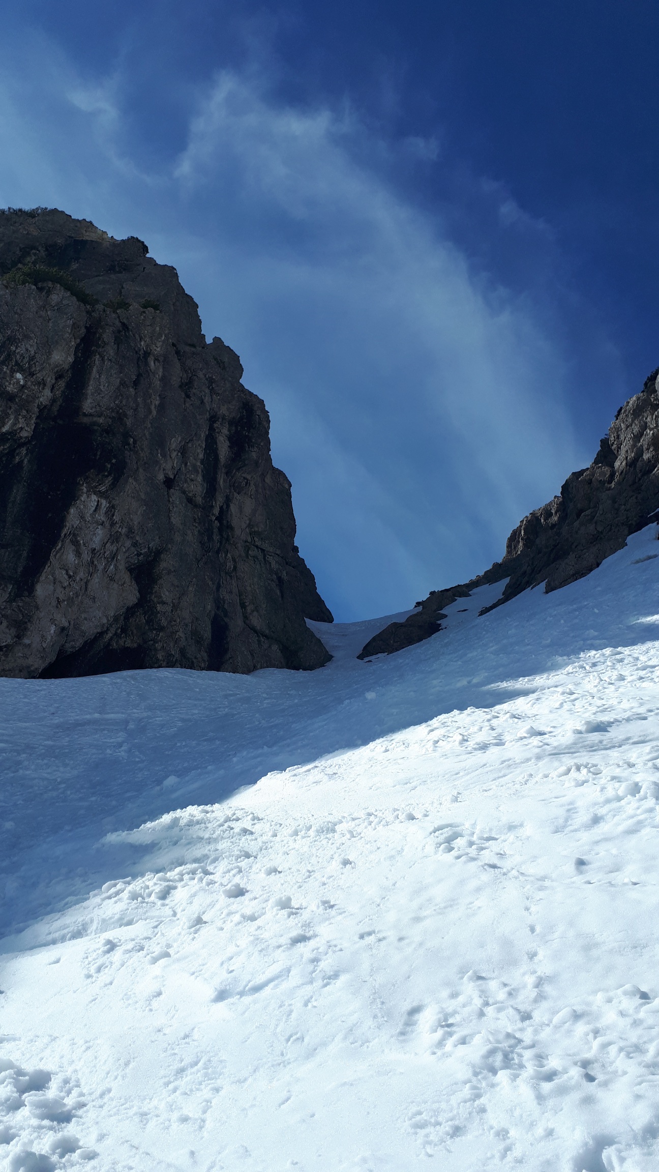 Trotz recht klarer Nacht war es nicht durchgefroren und recht weich. Aufstieg in die Scharte daher aber gut möglich. Das Schindertor ist noch verschneit. Man kann sogar noch mit Ski bis in die Scharte (wird aber schon recht eng und mühsam). Die meisten sind zu Fuß rauf. Da der Schnee aber nicht so toll war, bin ich bei circa 1630m an einer Engstelle im Kar umgedreht.