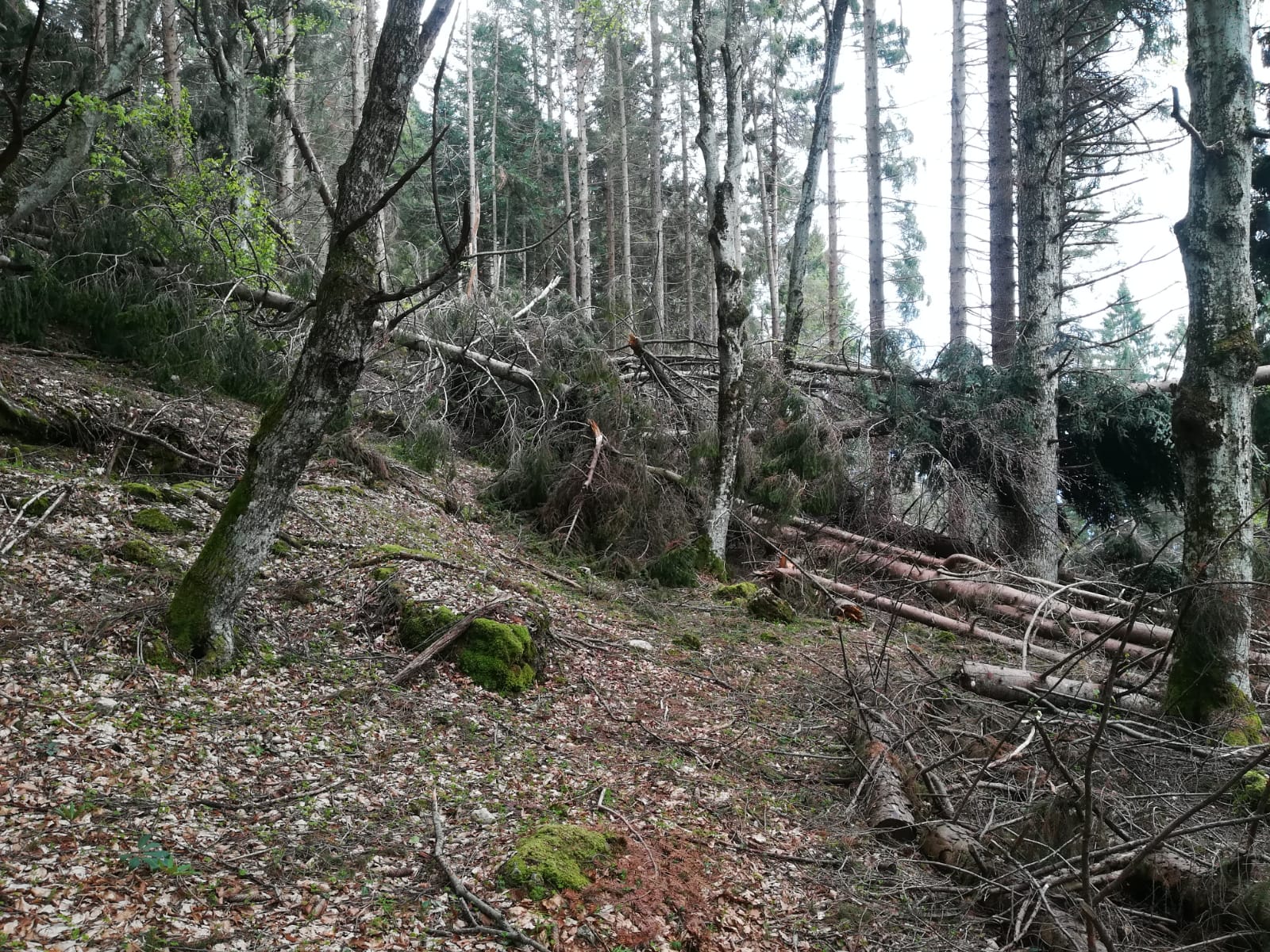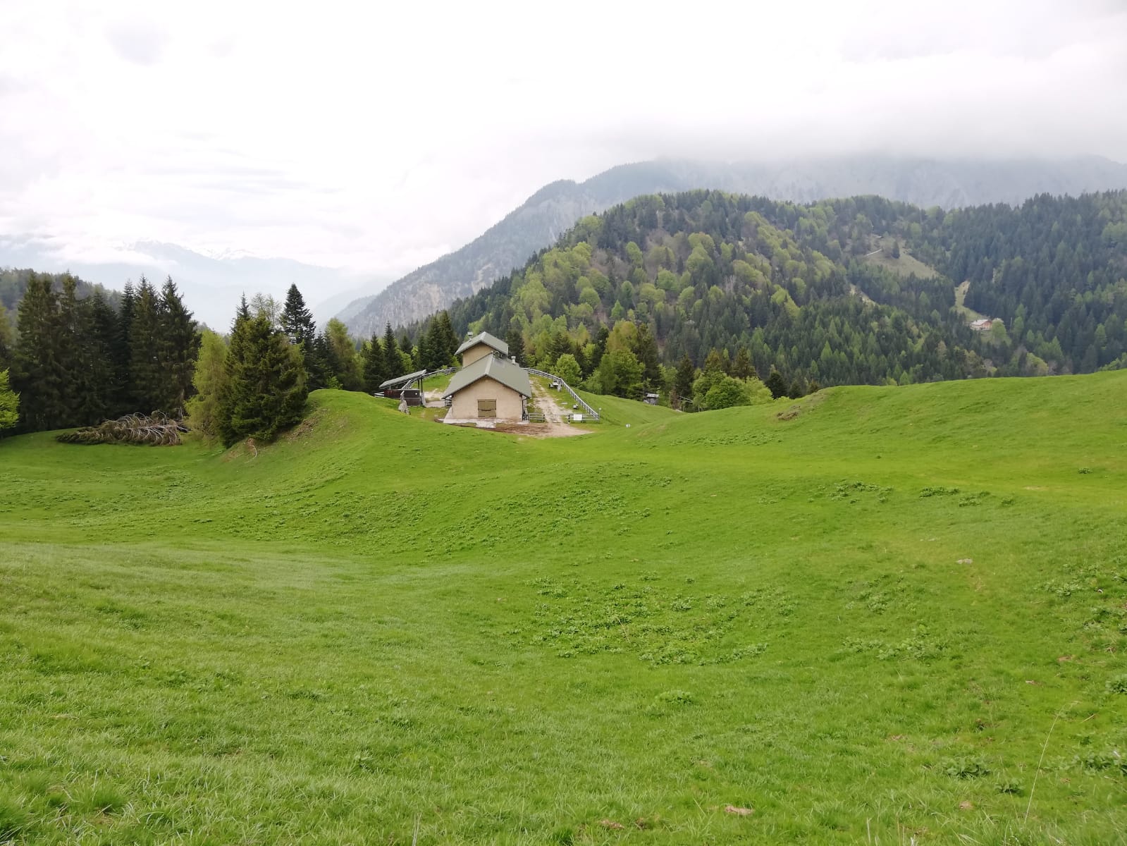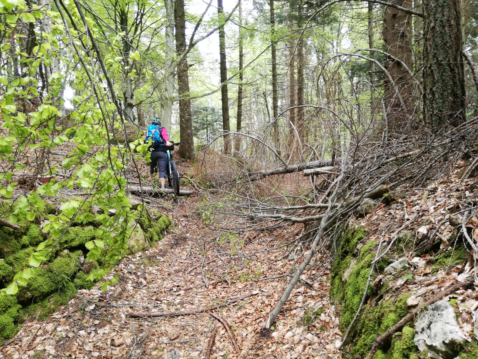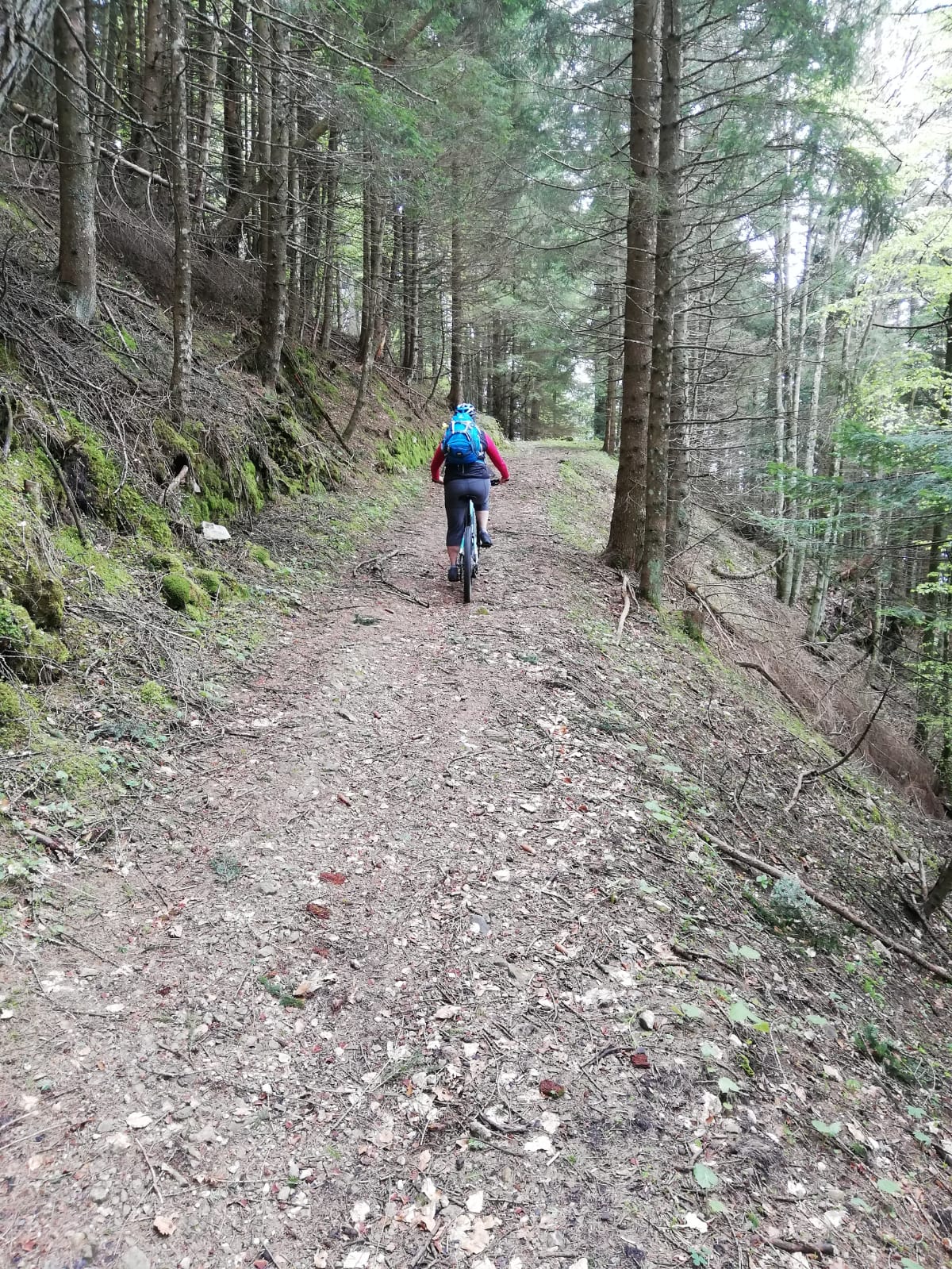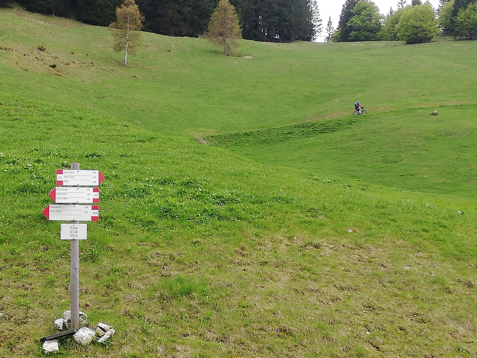 Von Pieve auf dem Radweg nach Tiarno di Sotto und auf schmaler Teerstraße an der Kapelle San Giorgio vorbei bis zur Bocca. Ca. 7km ab Tiarno, max. 14%. Von der Bocca zur Malga di Cap ca. 500m auf Forststraße, kurz bis 17%. Von der Malga über Wiesen kurz steil (bis 20%) zum Waldrand. Hier wollten wir den Trail Richtung Passo Giovo fahren, kehrten aber nach etwa200-300m im Wald um, da der Weiterweg durch einige umgestürzte Bäume versperrt war. Daher zunächst noch einen weglosen Abstecher zu Fuß auf die Cima Palone (unlohnend, Gipfel bewaldet, keine Aussicht) und dann mit dem Rad auf dem gleichen Weg zurück bis zu den Wiesen von Prati di Bria. Hier zweigt ein Sträßchen (Wegweiser) ab, das ebenfalls nach Tiarno führt. Über dieses deutlich steiler (betoniert) als die Auffahrtsstrecke runter nach Tiarno und zurück nach Pieve.
