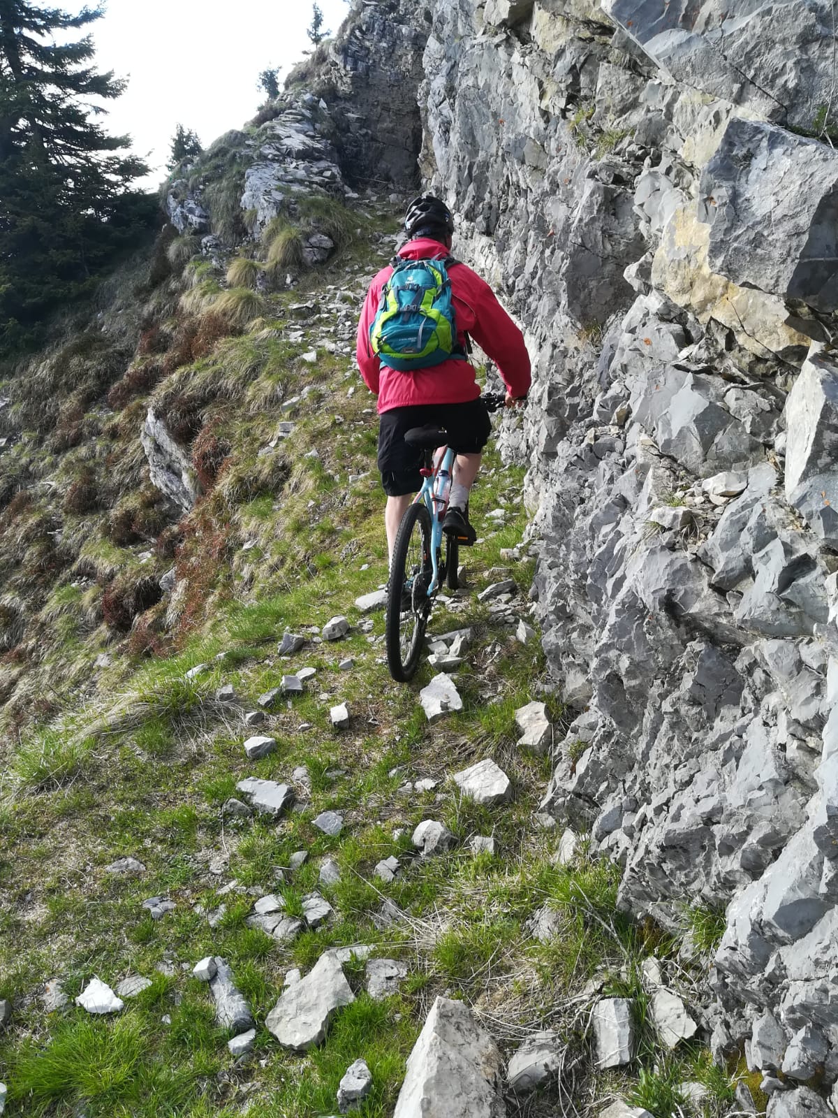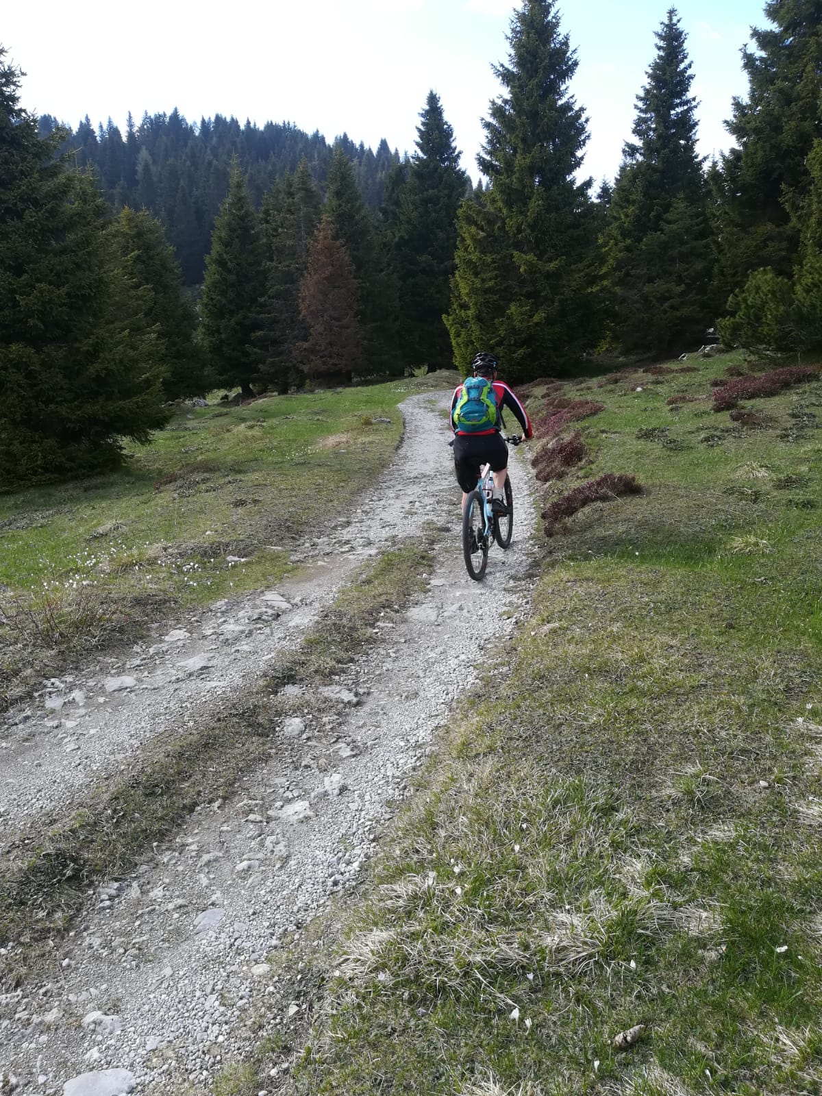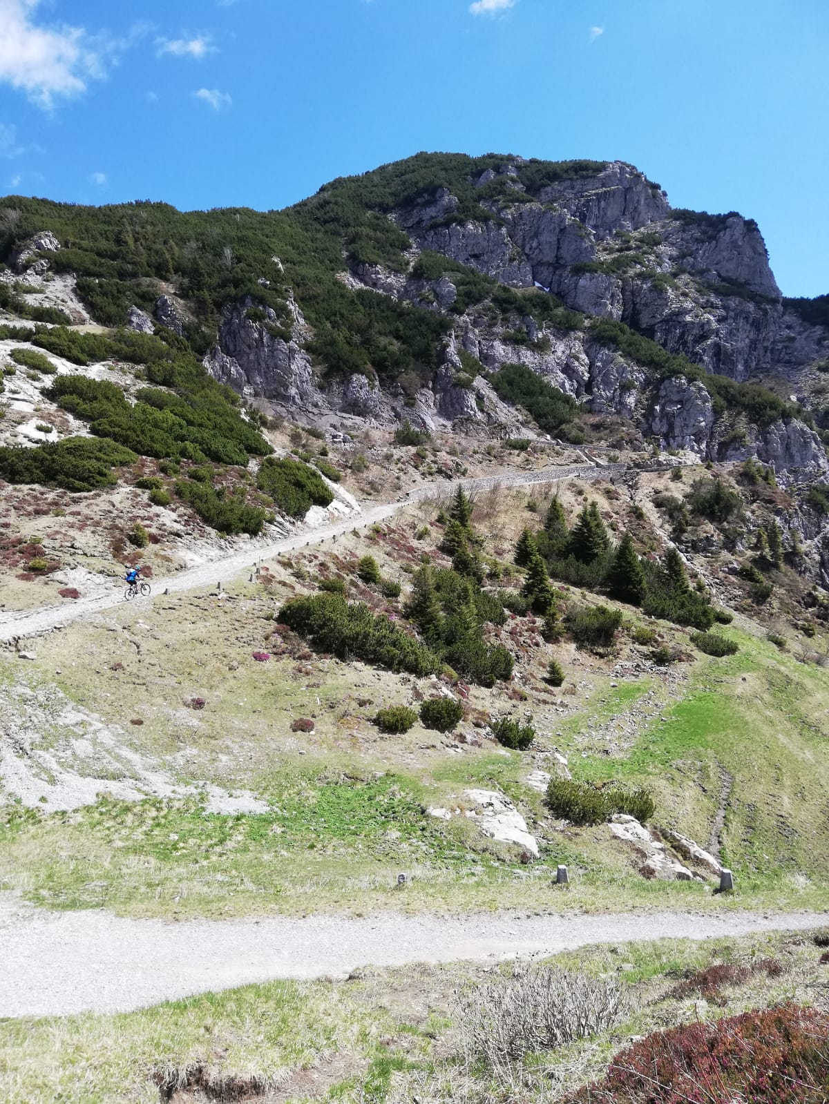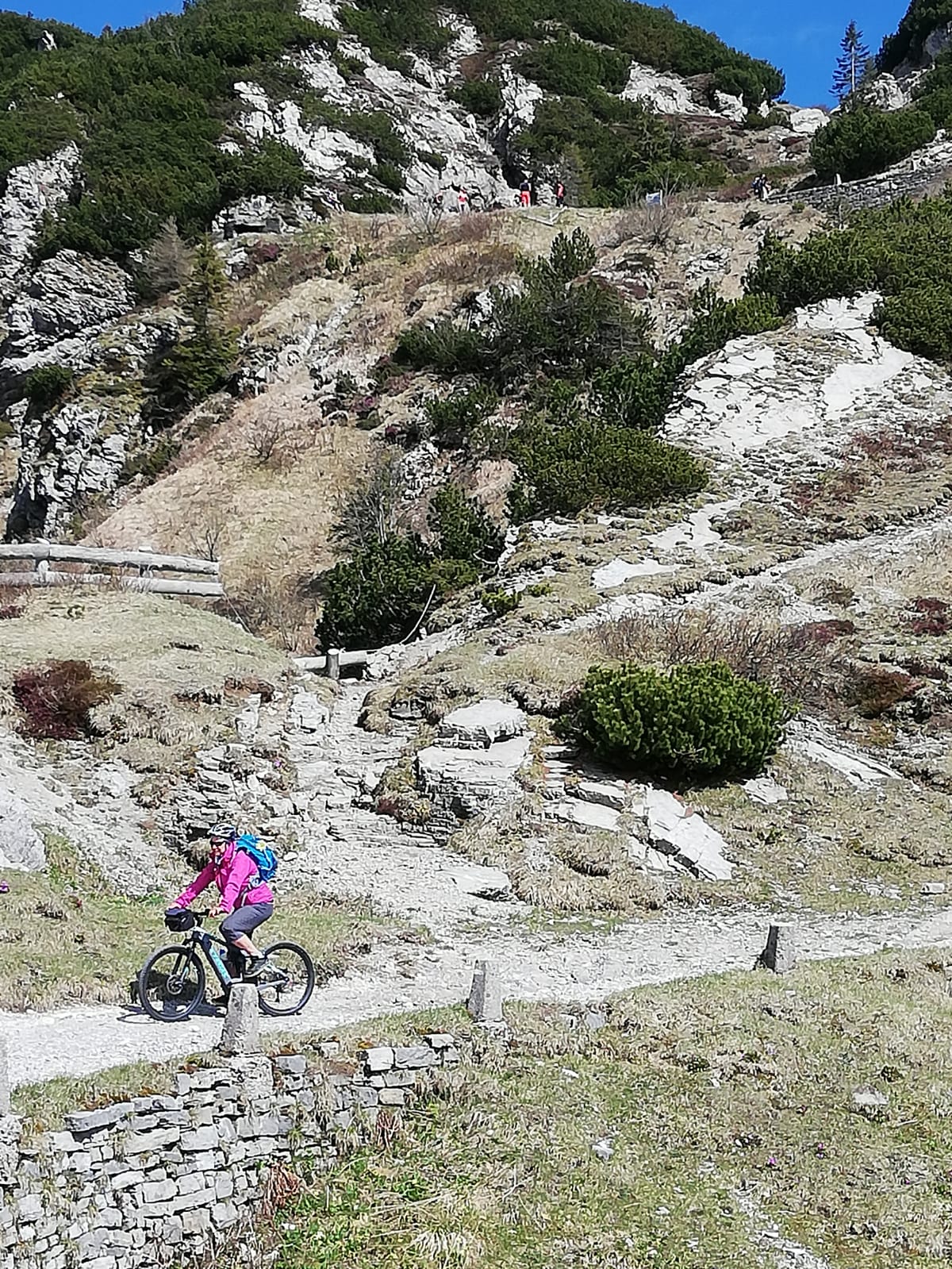 Heute haben wir eine "MTB-Tour light" gemacht und uns eine Auffahrt mit dem Auto gegönnt. Damit es nicht zu wenig wird, zunächst Abfahrt vom Rifugio Garda auf der Südseite bis zur Malga Ca dall Era (1330m) und wieder Auffahrt bis zum Scheiteltunnel der Tremalzoroute (1860m). Von hier auf Steig durch Latschengassen, streckenweise noch mit Schnee, auf den Corno de Marogna. Abfahrt zum Rifugio Garda und Abstecher auf Forststraße nach Westen zur Cima Avez. Mit dem Rad kann man hier bis 10m unter den Gipfel fahren und im Gegensatz zur Tremalzoroute ist es hier sehr einsam, dazu auch nirgends steiler.
